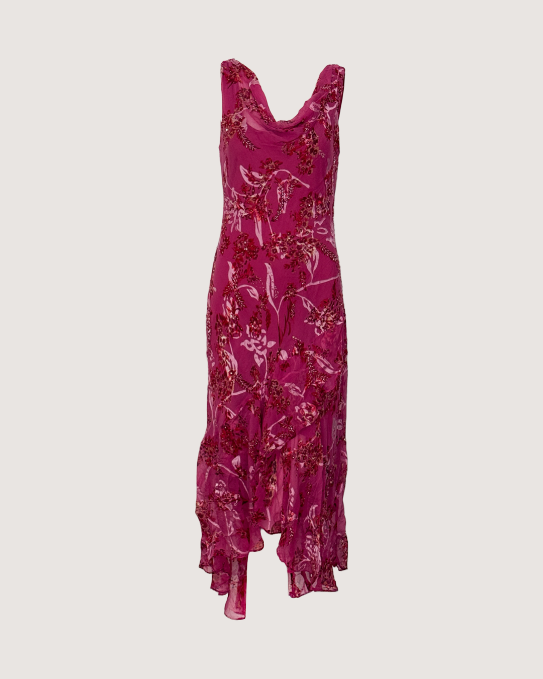 Absolutely stunning 2000’s-era designer dress with a pink floral beaded design. Made of a silk-blend—so luxurious. This lovely closet staple can be styled out on the town and for casual and formal events year ‘round.