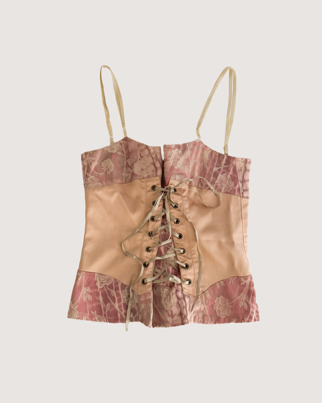 The chicest 2000’s French pink floral lace-up corset bodice. This eye-catching and lovely closet staple can be styled as loungewear and lingerie, as well as worn out and about. A stunning French garment to treasure forever.