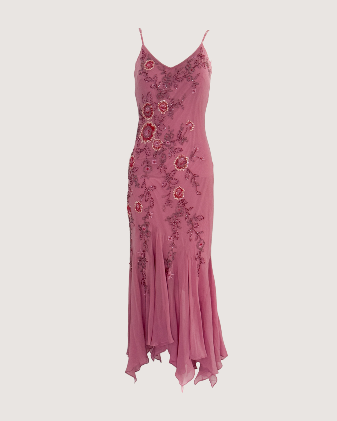 100% Silk Luxurious 2000's Pink Floral Beaded Dress (Medium)