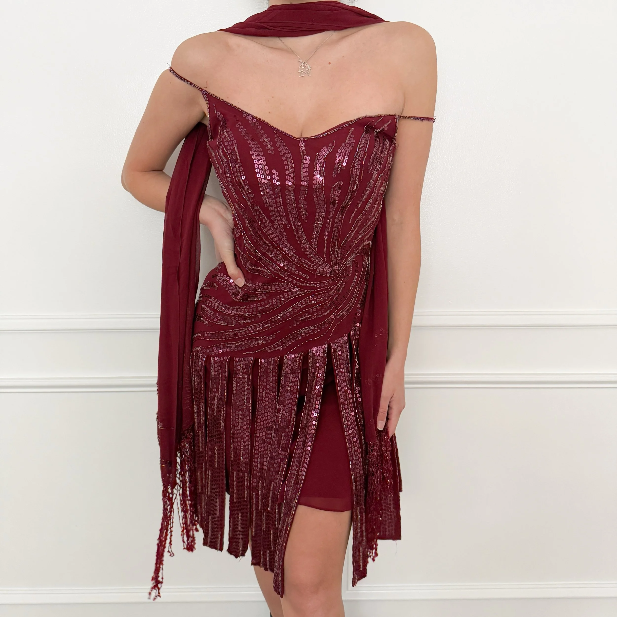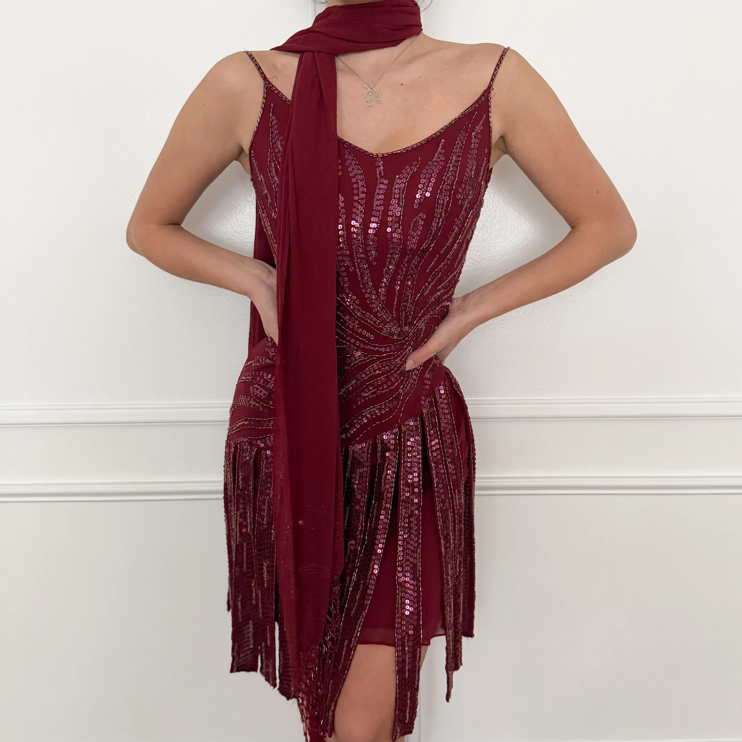 100% Silk Luxurious 2000's Burgundy Beaded Dress & Scarf Ensemble (Medium)