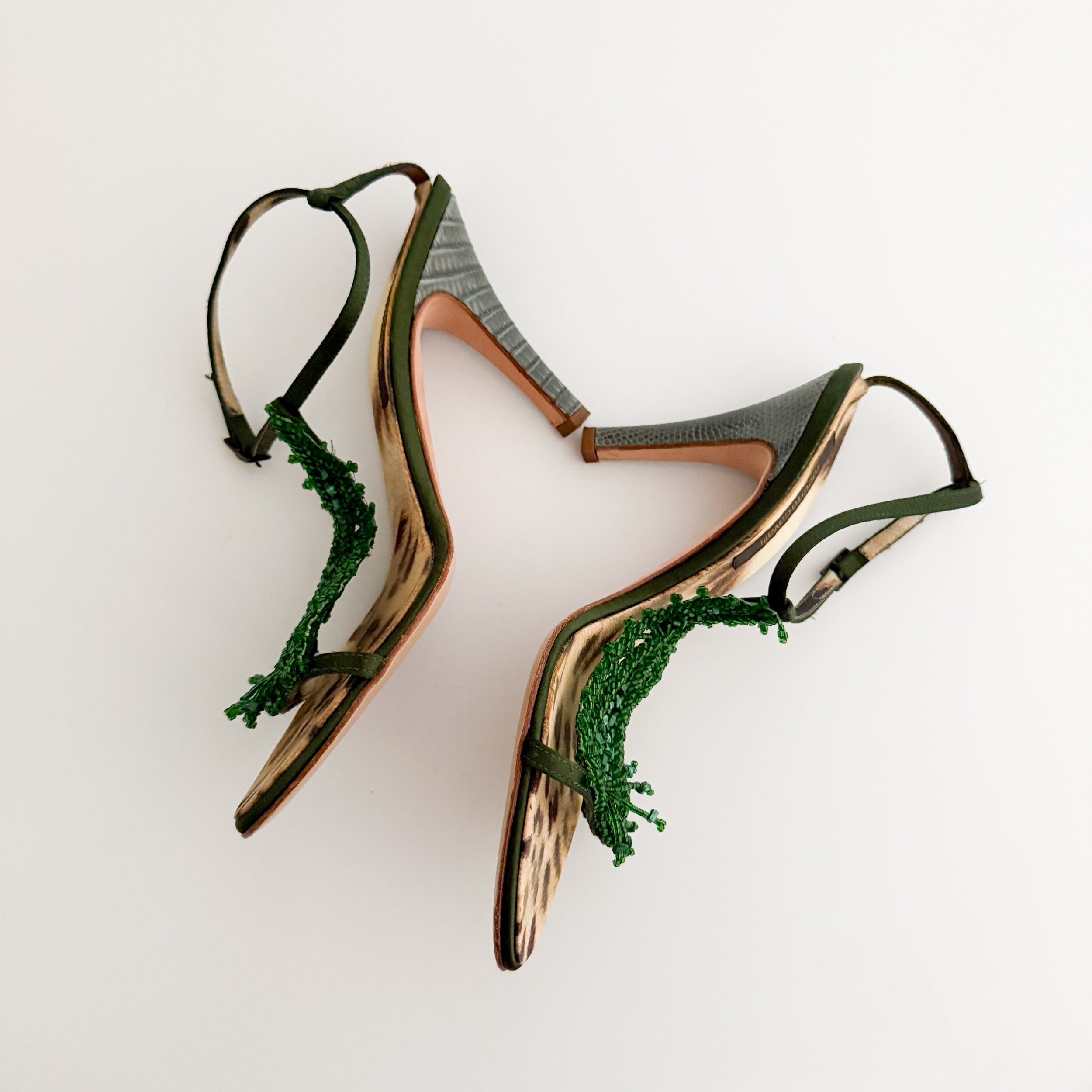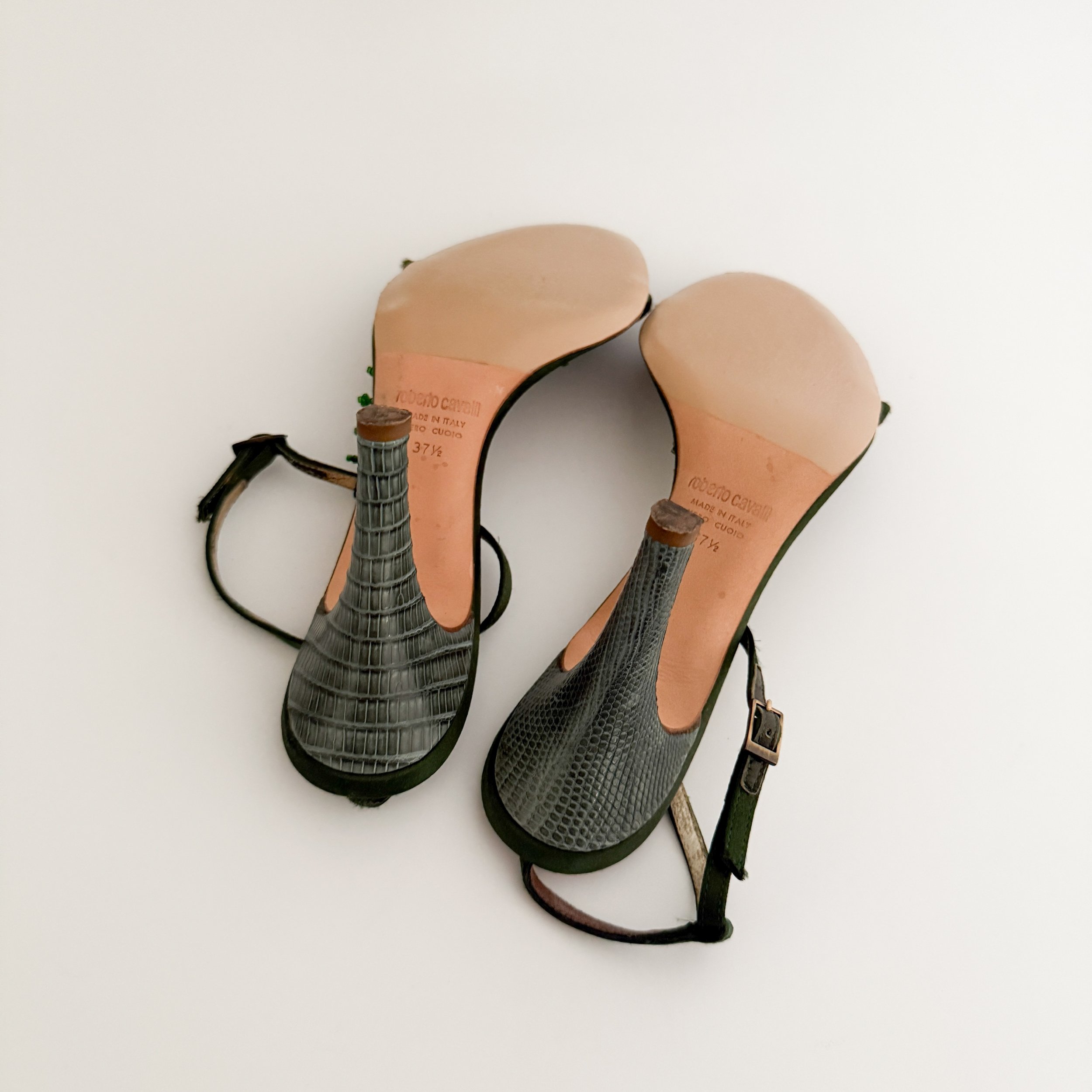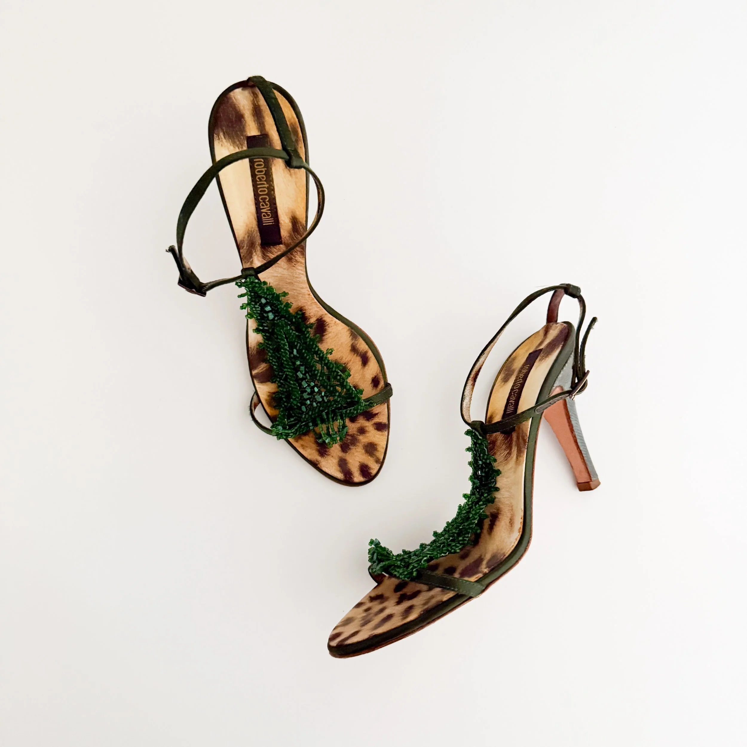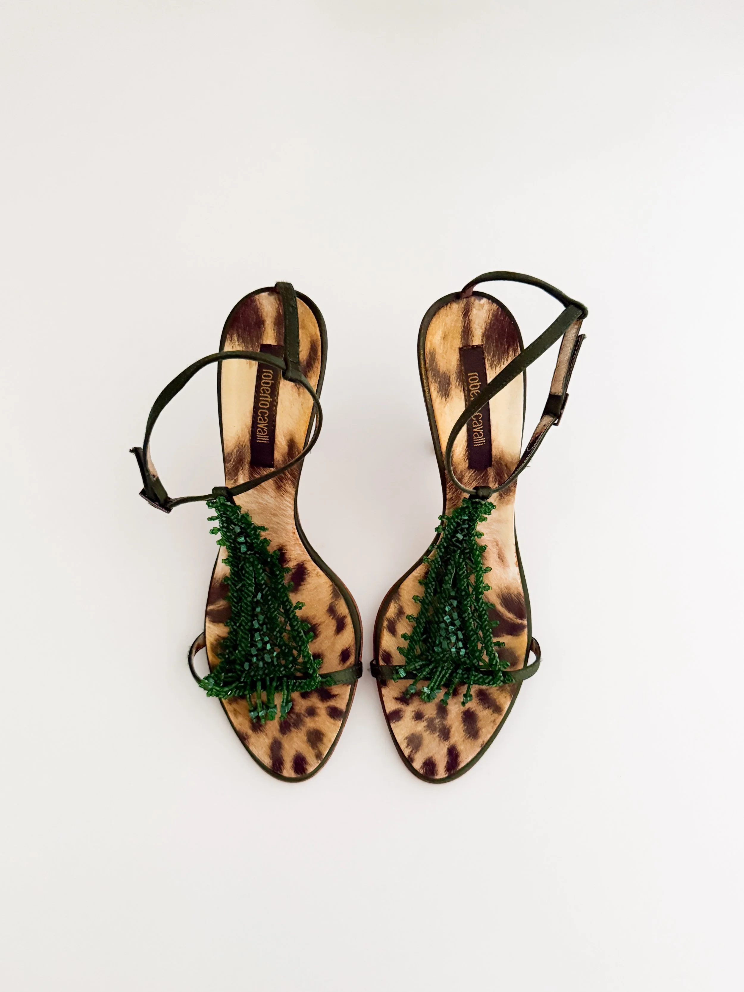 Roberto Cavalli Green Beaded Leopard Sandal Heels (US 7 / IT 37.5)