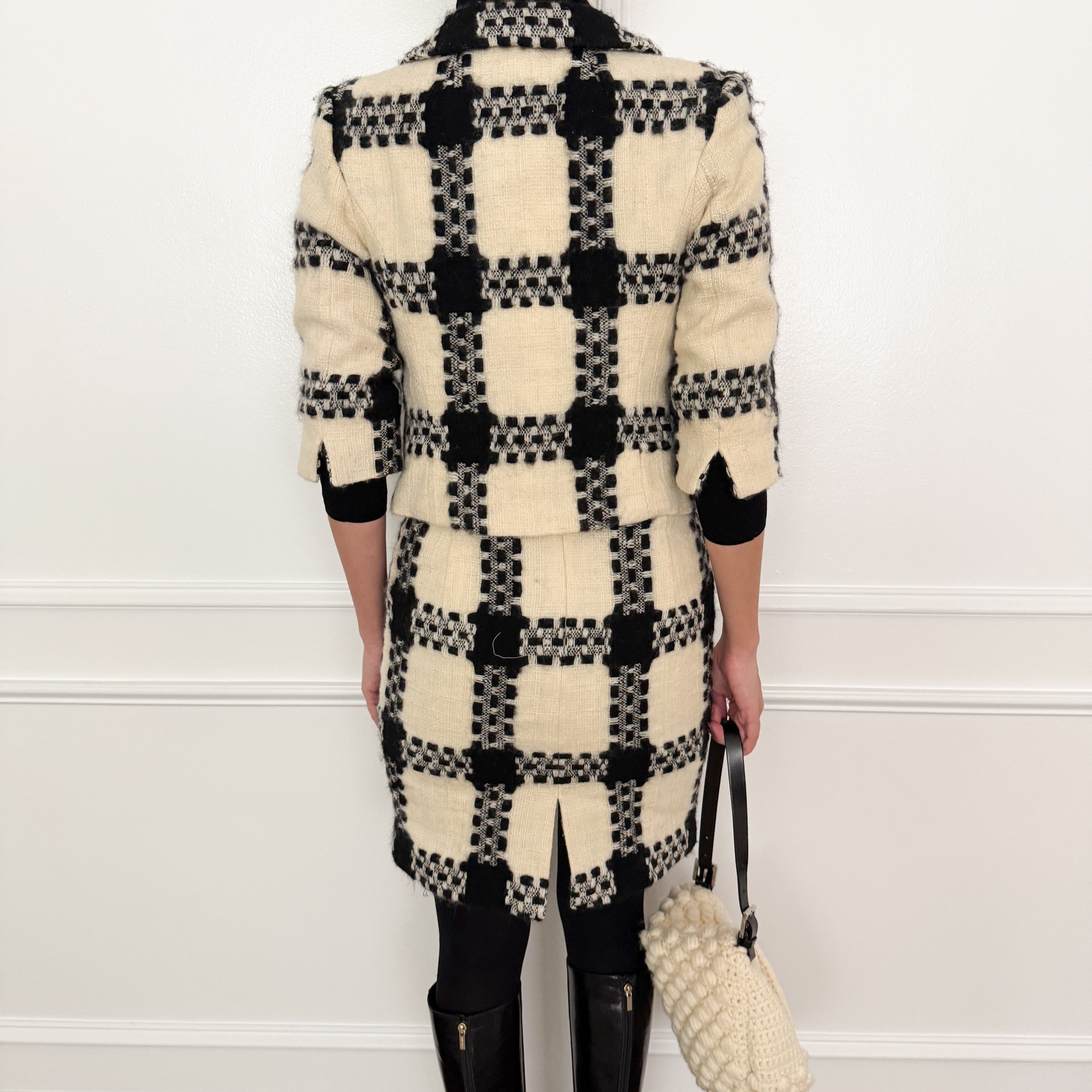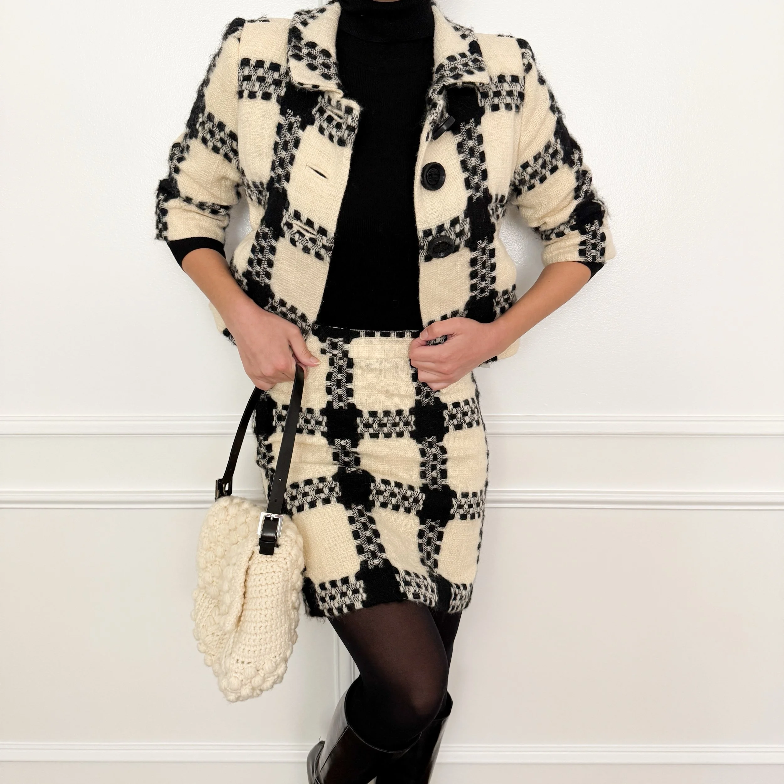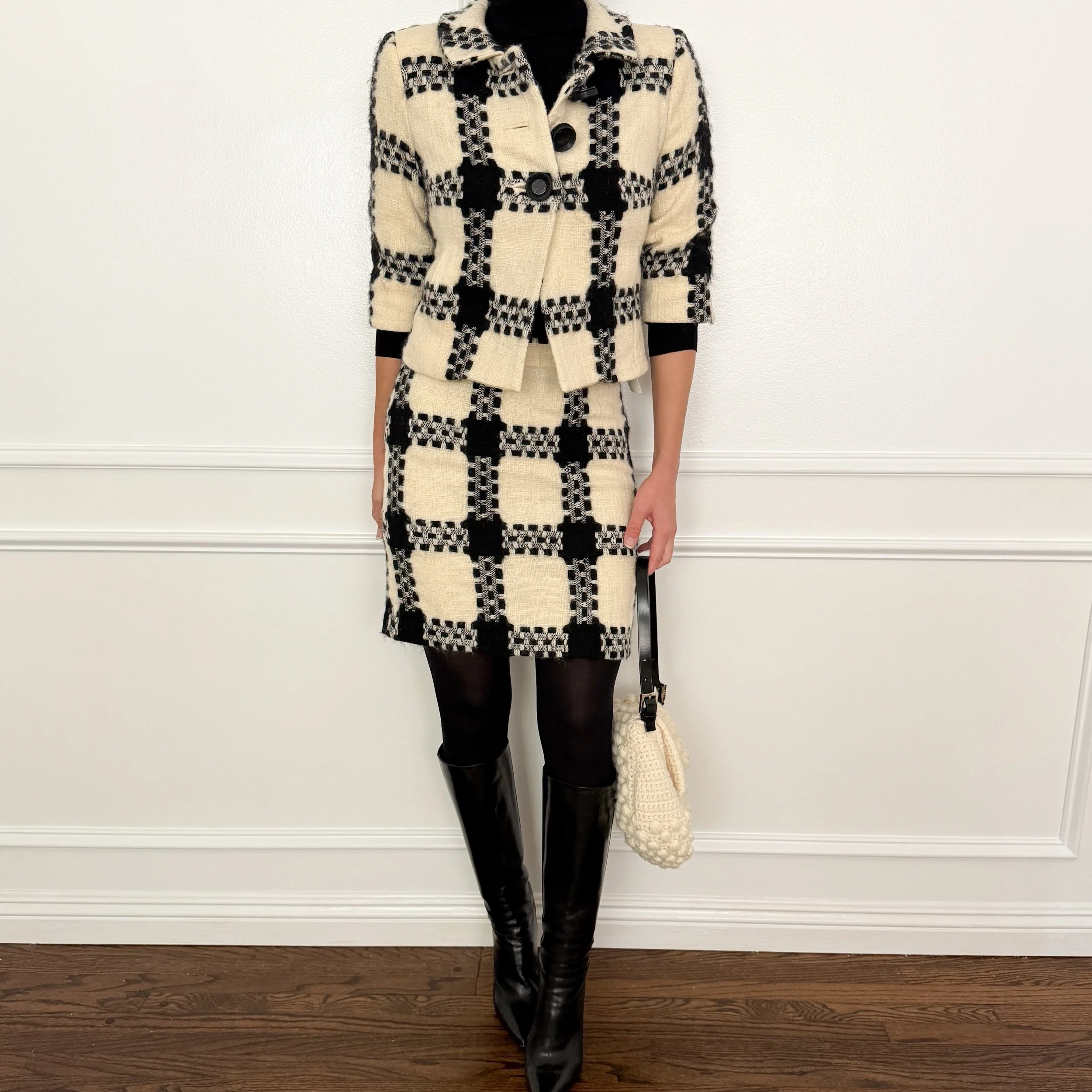 The most classic two-piece ensemble, featuring an ivory and black cropped button-up blazer and a matching skirt. This pair of closet staples can be styled year ‘round, both together and separately, and both casually and formally. The perfect pair of garments to add to your capsule wardrobe.