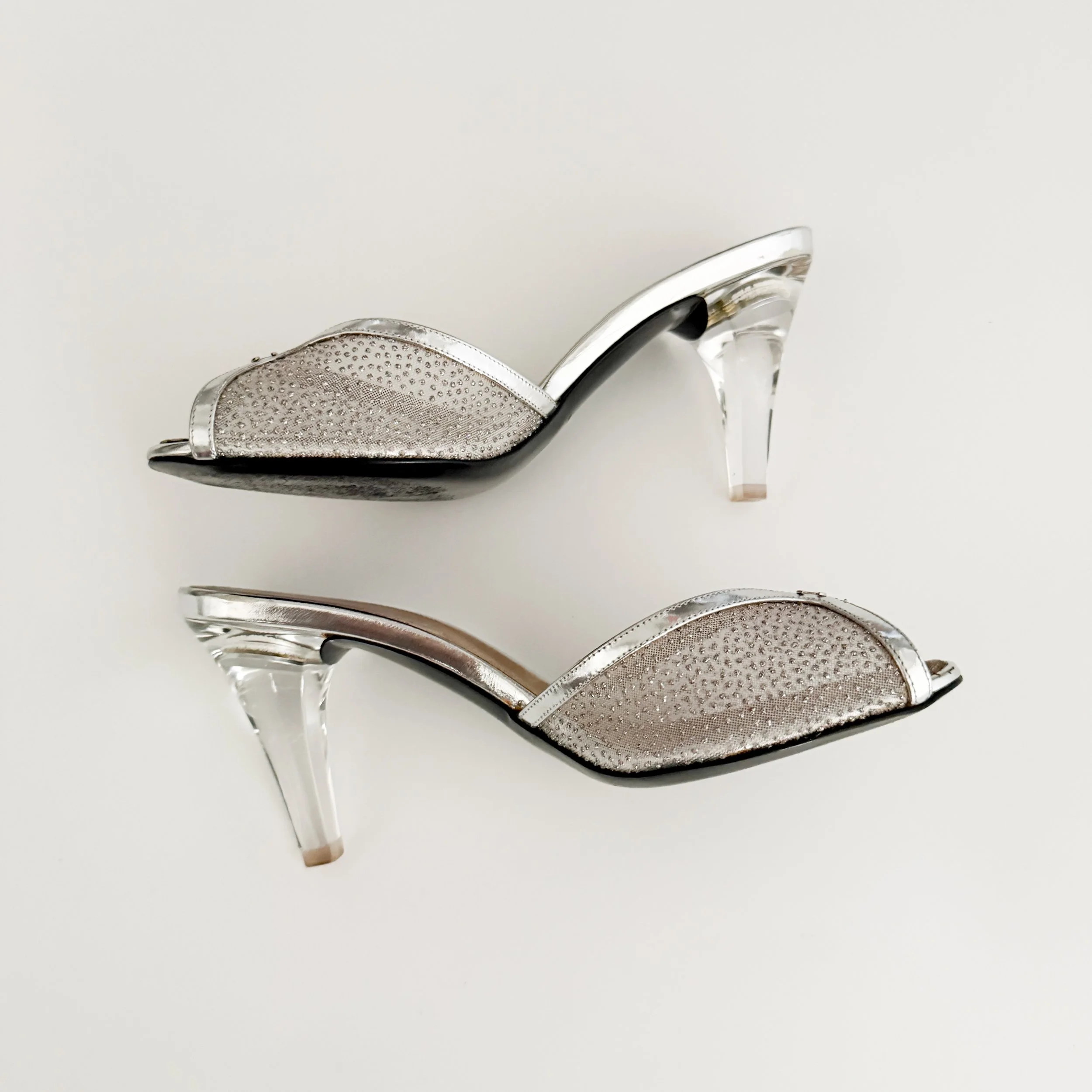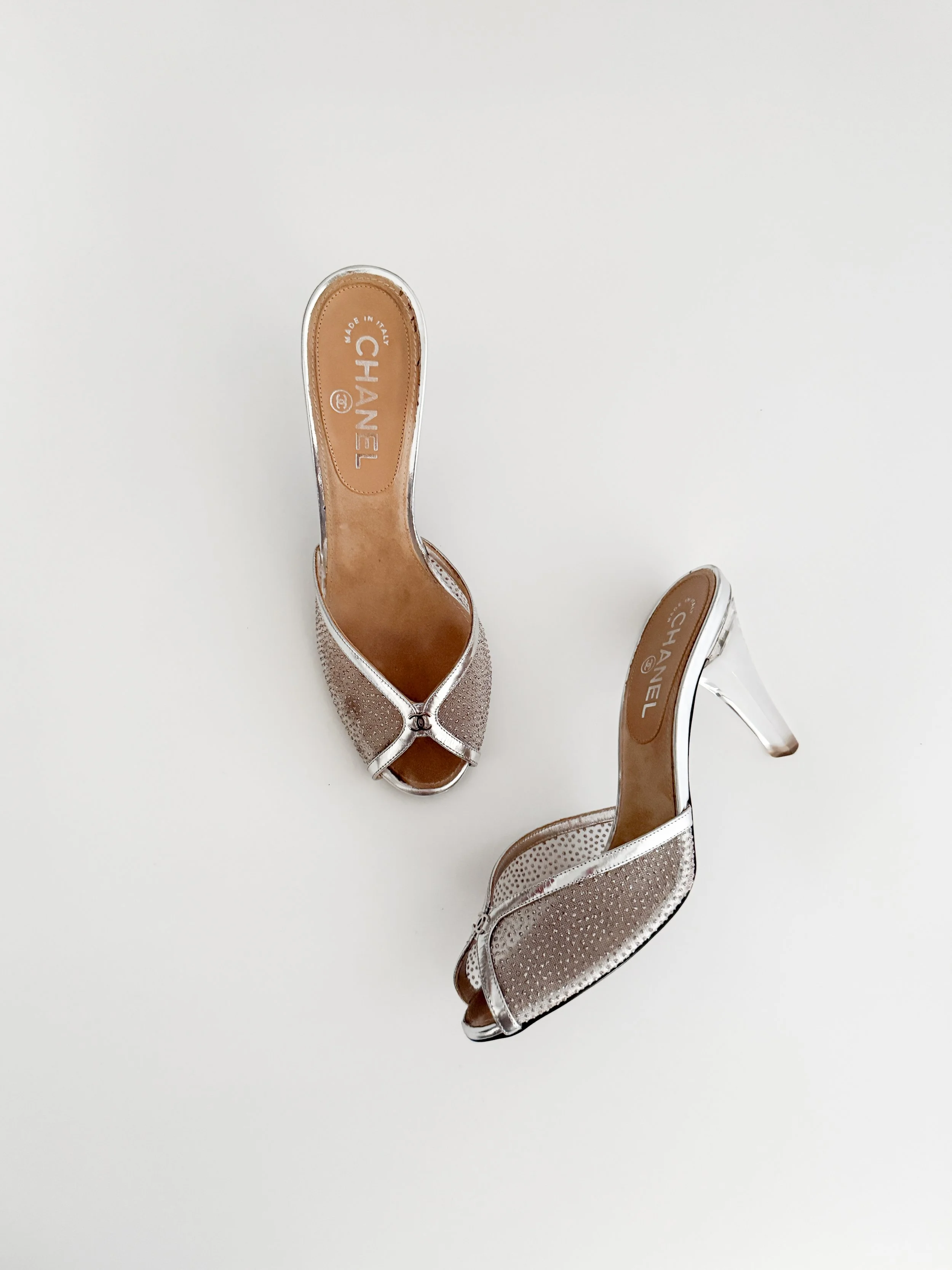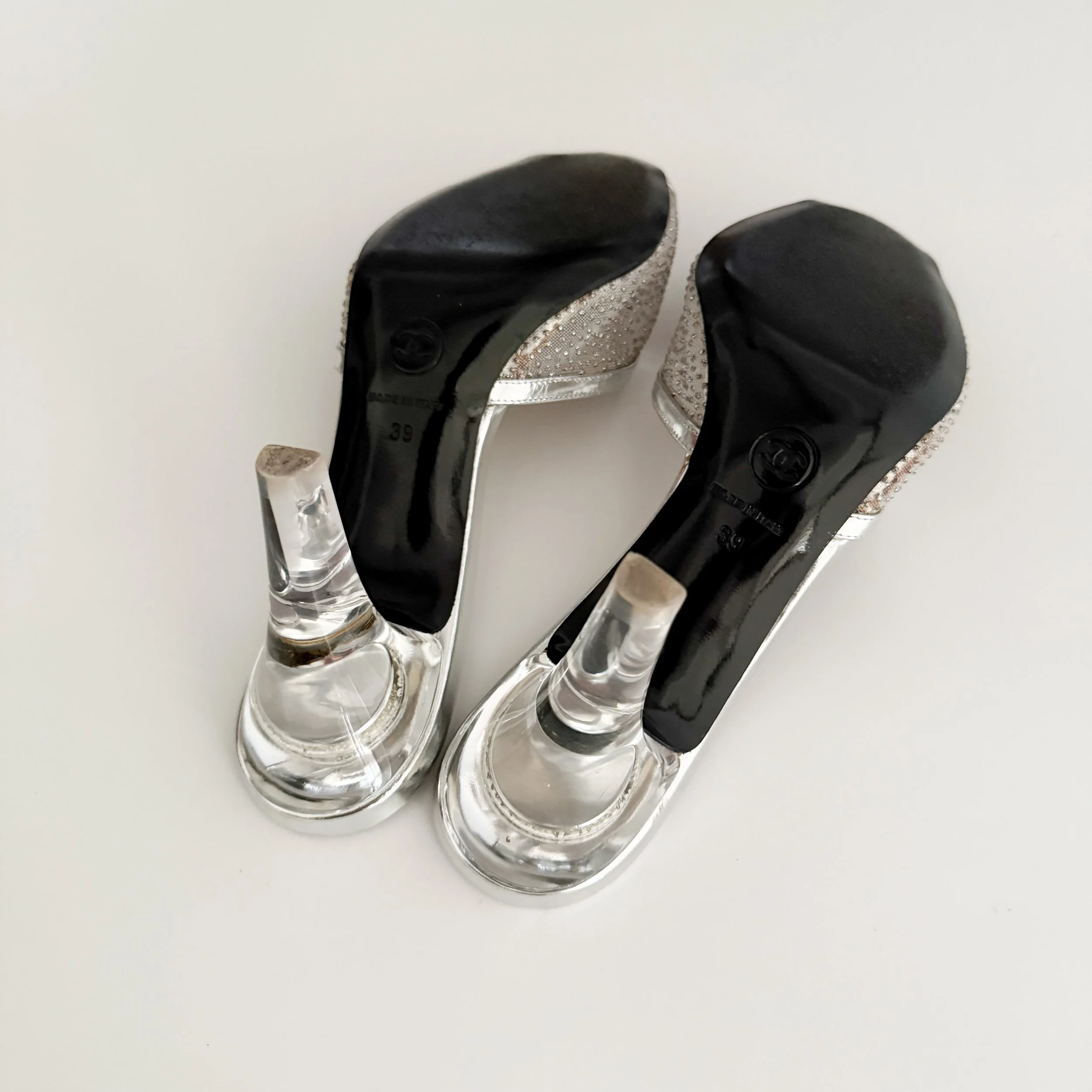 The most darling silver lucite heels from iconic fashion house Chanel. Features the iconic Chanel “CC” logo at front. These shoes are a timeless statement accessory and are perfect for the designer collector. So chic. An in-demand Chanel style.