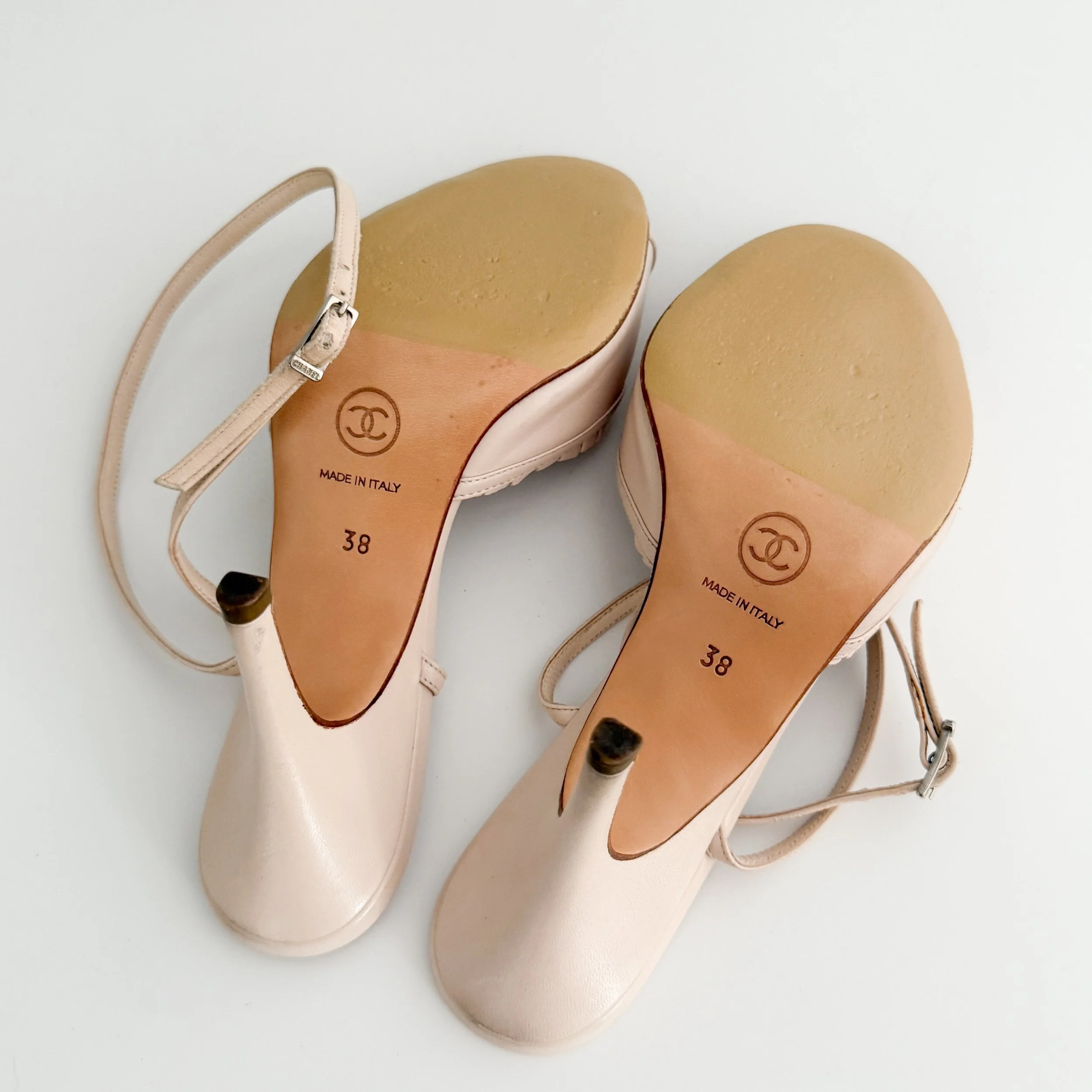 The most chic vintage leather heels from iconic fashion house Chanel by Karl Lagerfeld. Features the signature Chanel "CC" logo at front.