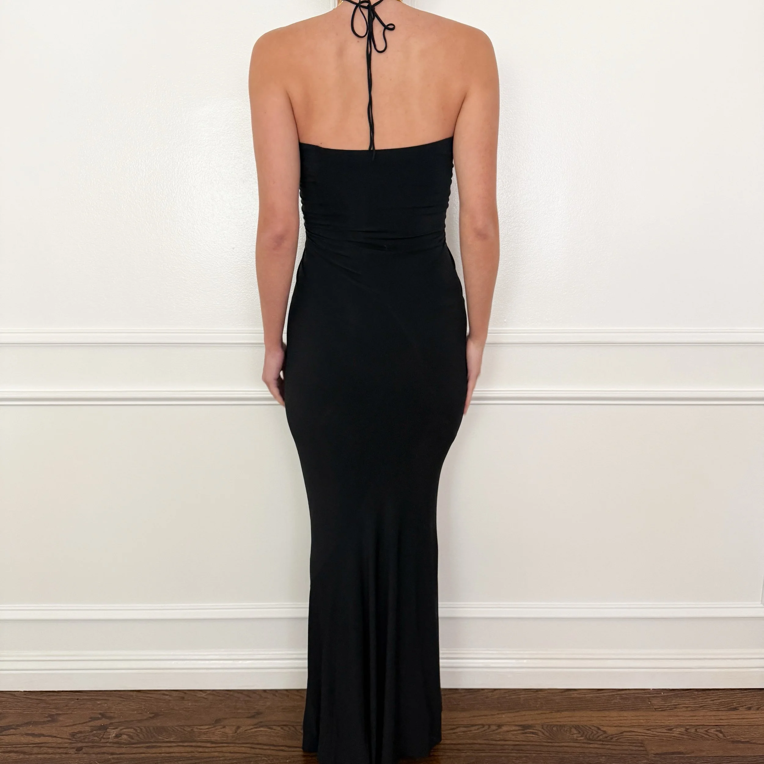 The most incredible black gown with gold neckline accents by luxury designer Donna Karan. A unique statement dress that will never go out of style. The quintessential LBD. So chic.