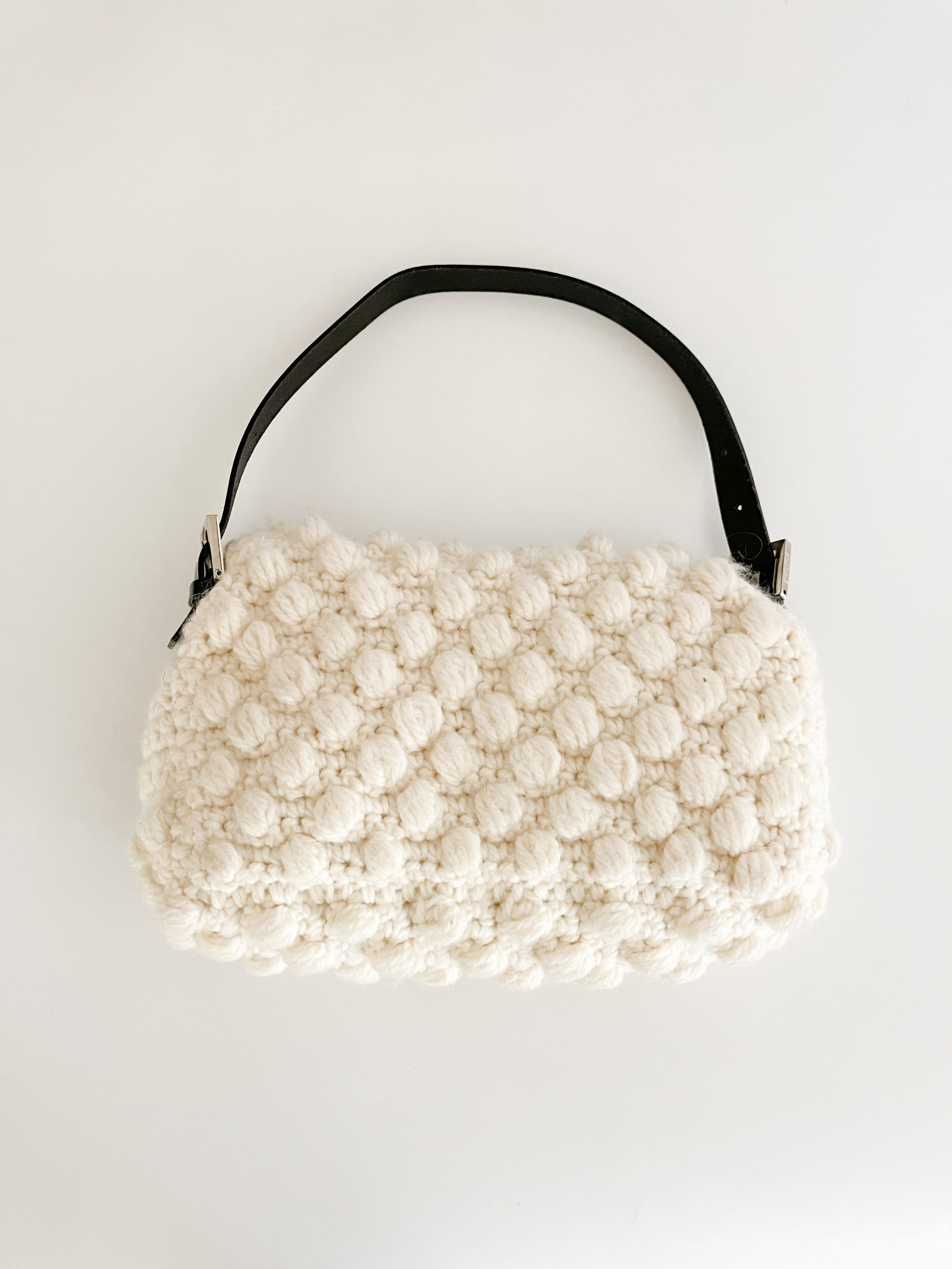 The most chic ivory knit baguette bag from luxury Italian fashion house Fendi. As seen on the brand’s Fall 1999 runway.