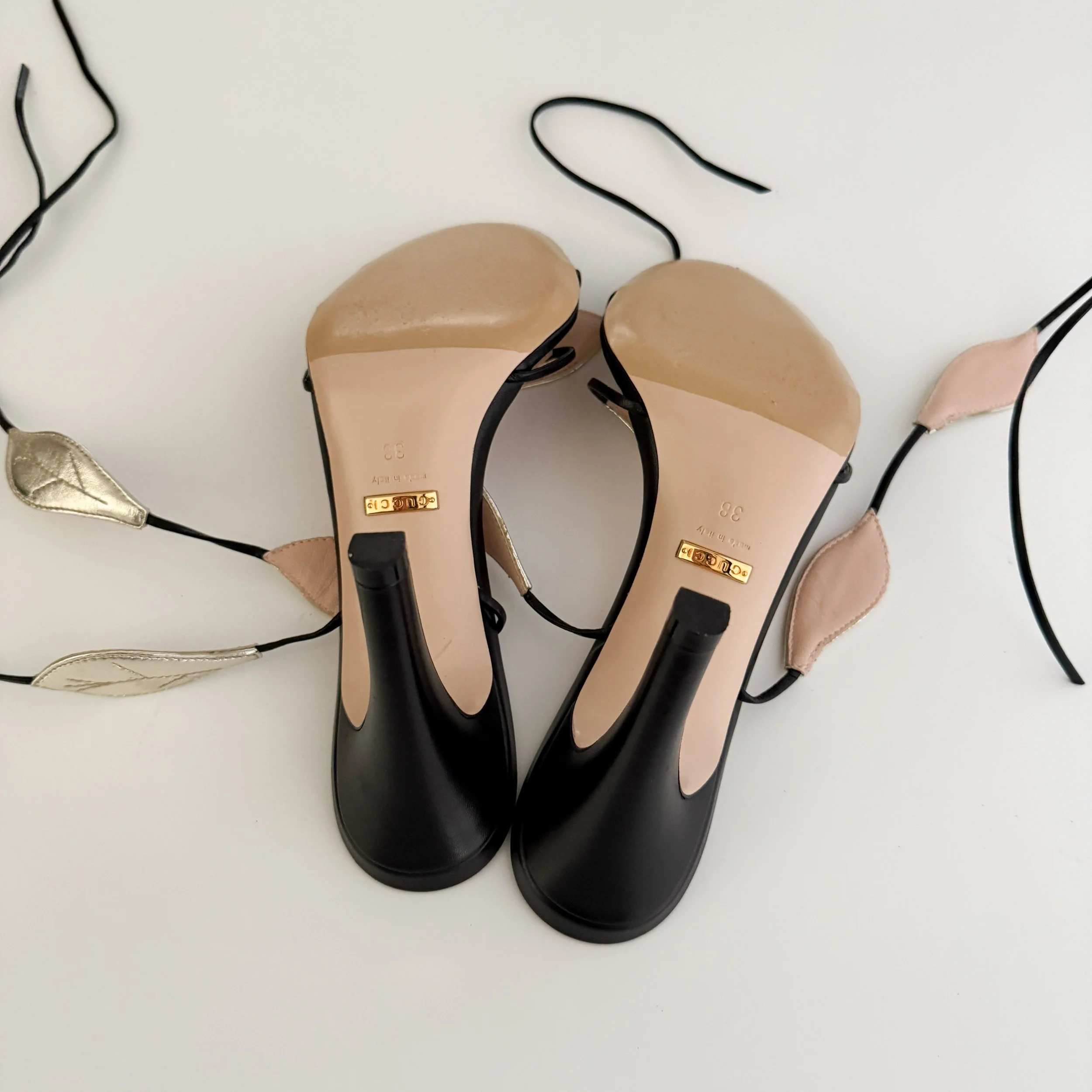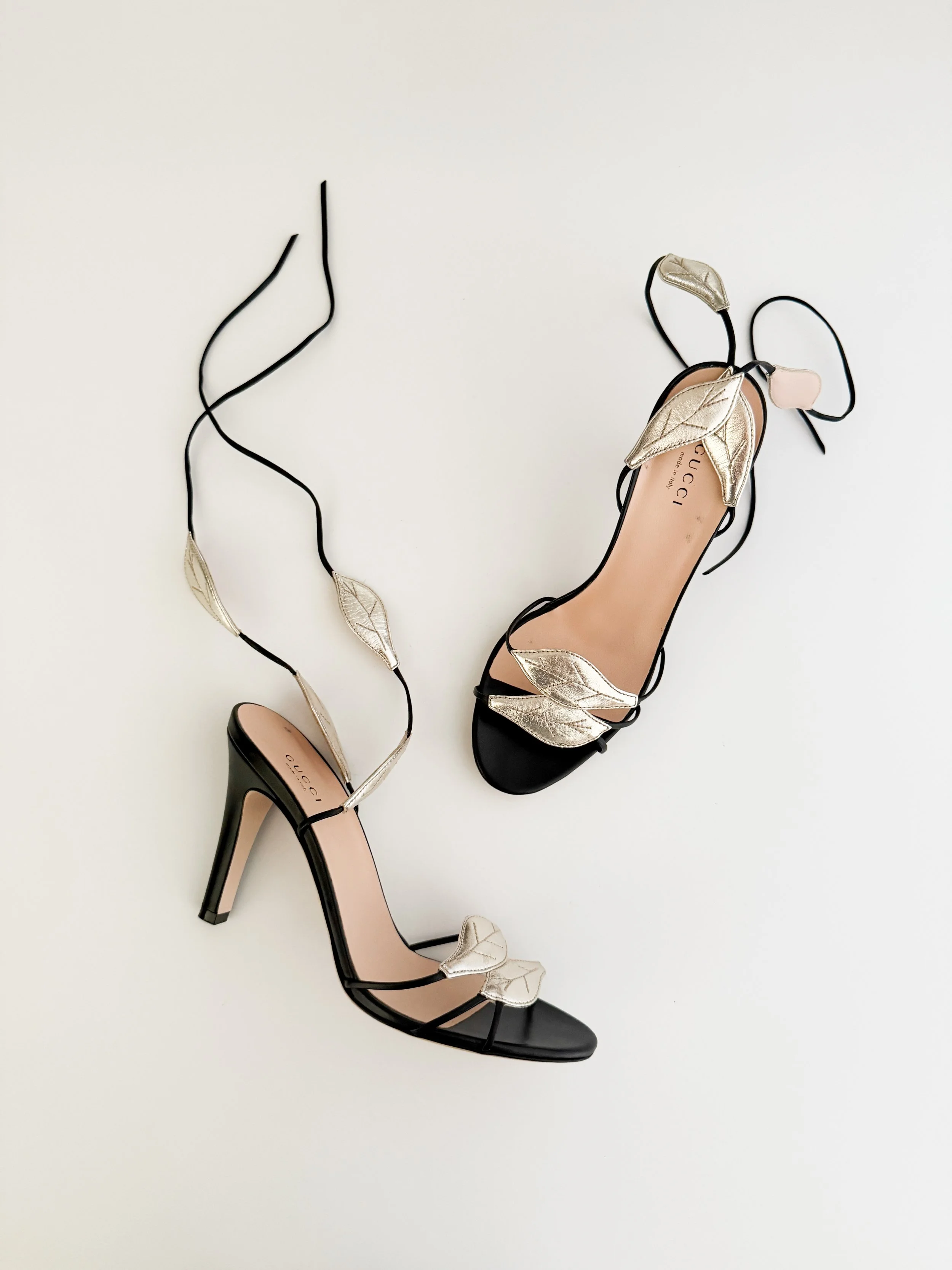 Gucci Black & Silver Leather Leafy Ankle Wrap Sandal Heels (US 8 / IT 38)
