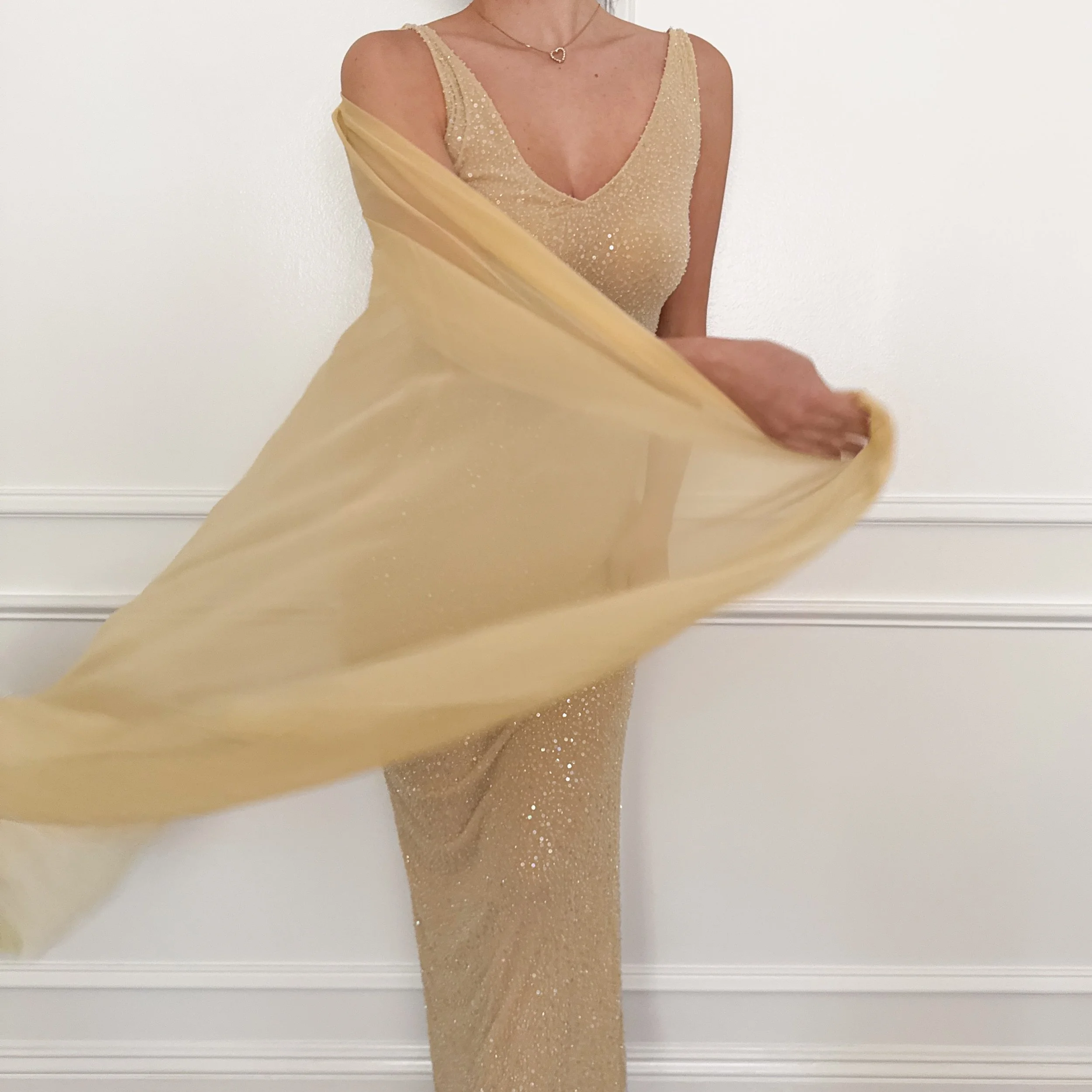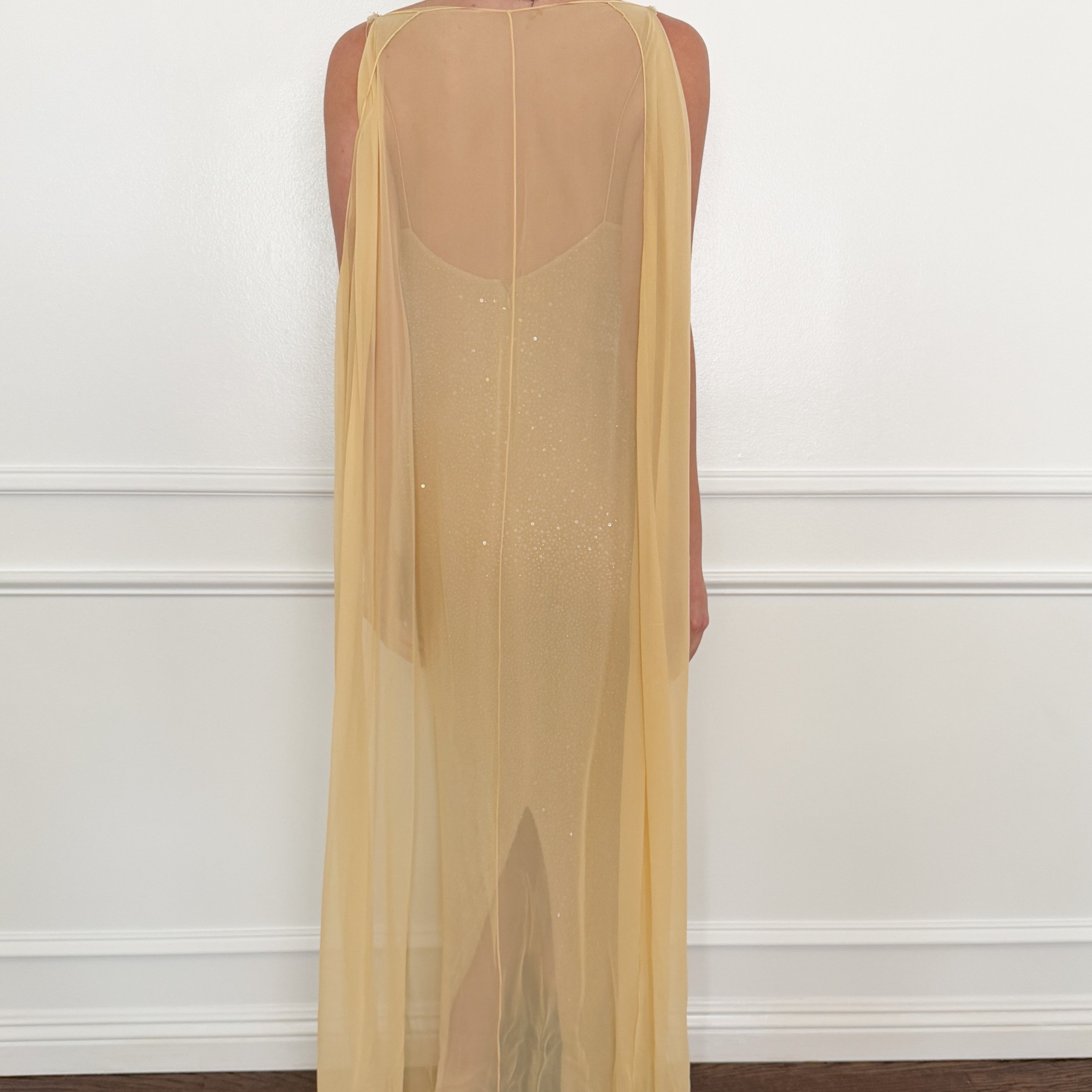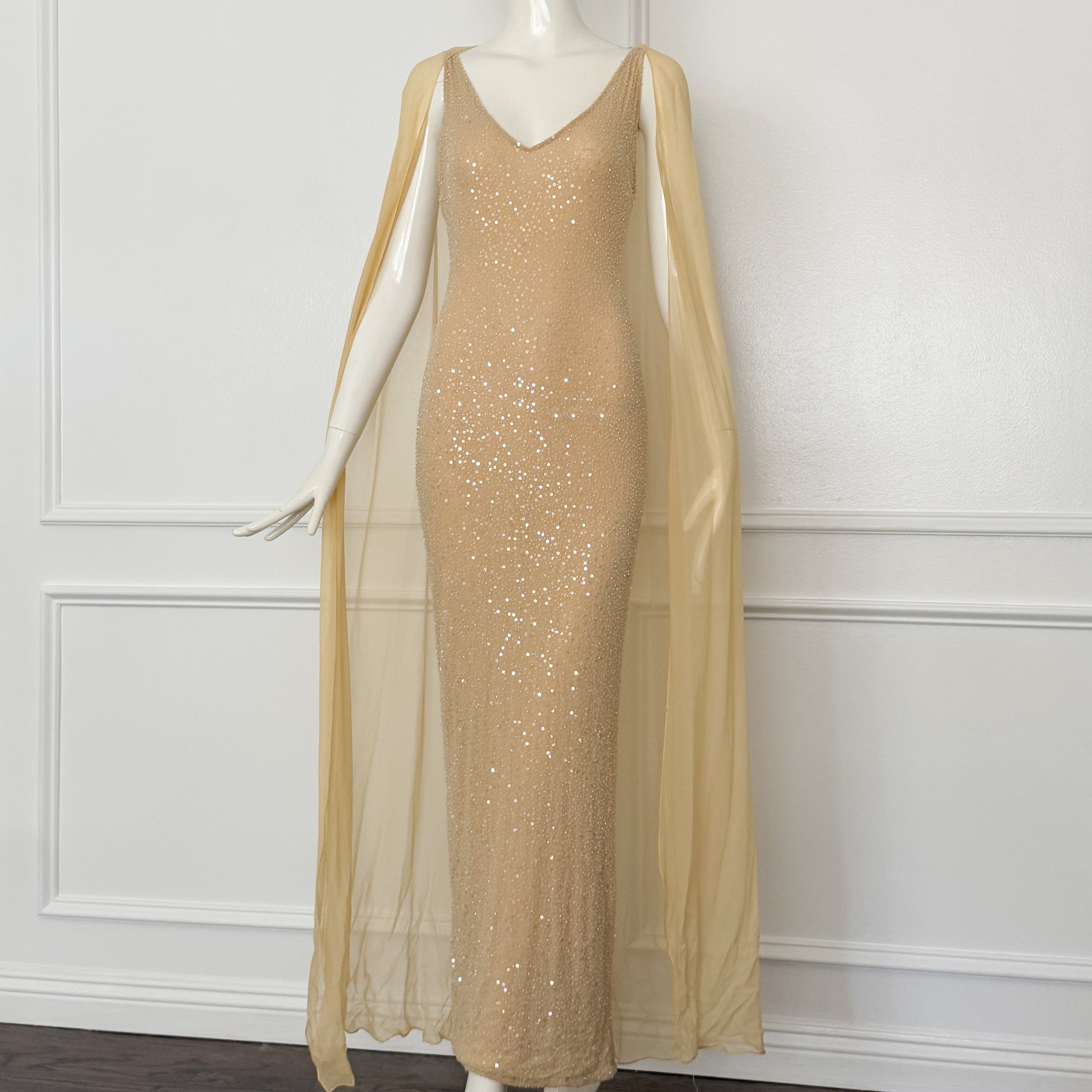 Halston 100% Silk Luxurious Beaded Semi-Sheer Caped Gown (S-M)