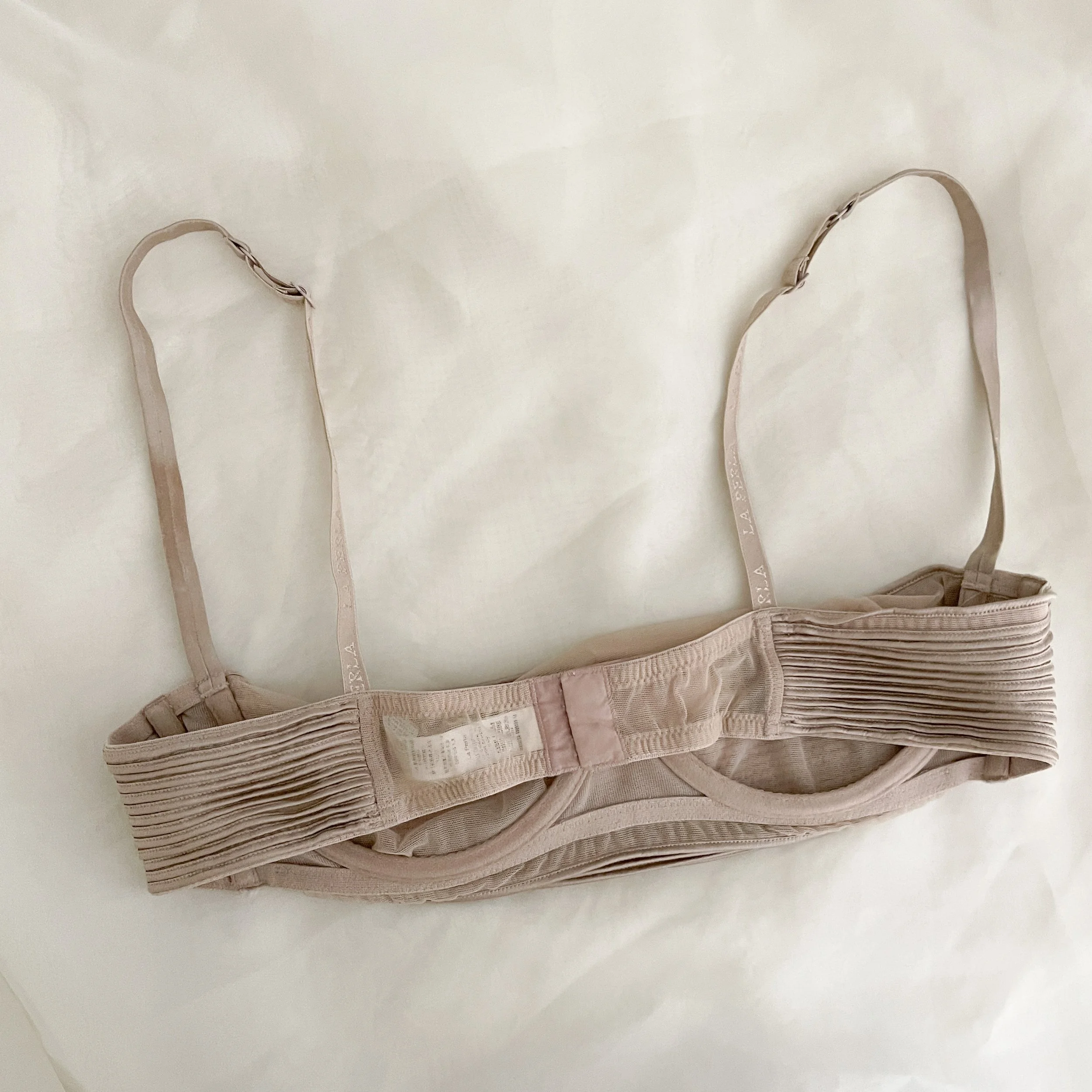 The loveliest taupe bralette with pleated detailing from luxury Italian lingerie brand La Perla. Made of a silk-blend—so luxurious. When a garment is this stunning, it is meant to be shown off; style this as loungewear and lingerie, as well as out and about on the town as a statement top. A closet staple to treasure forever.