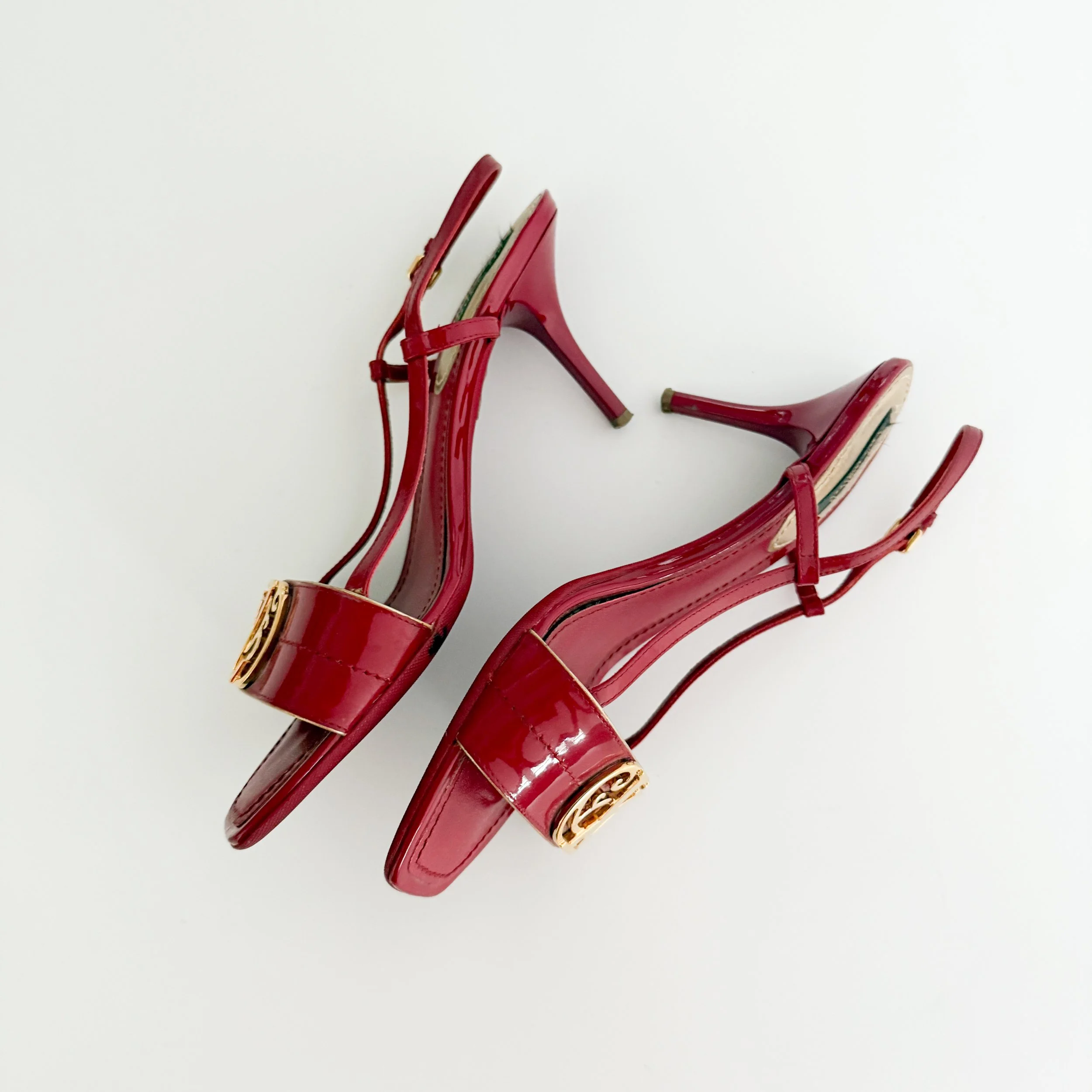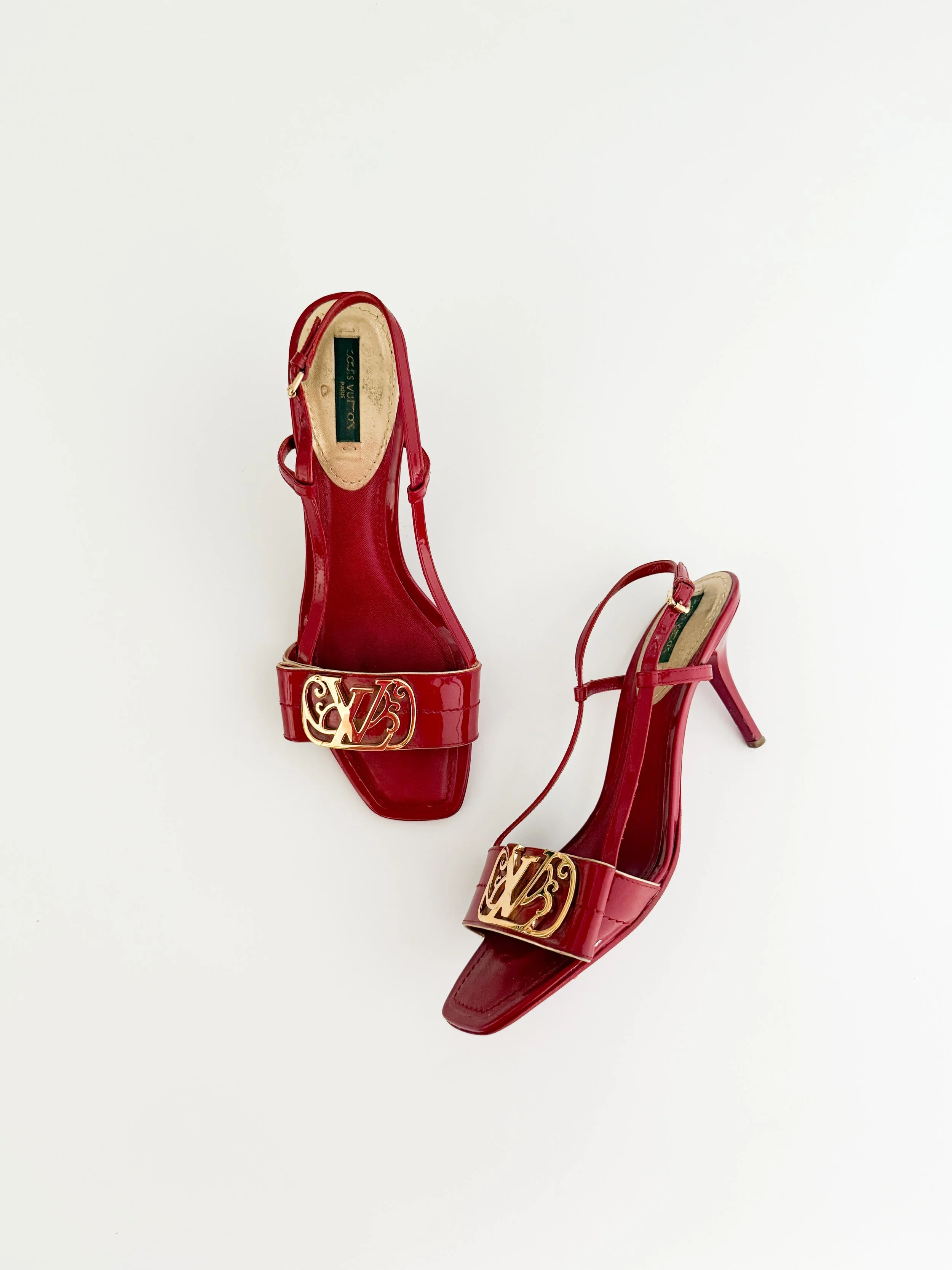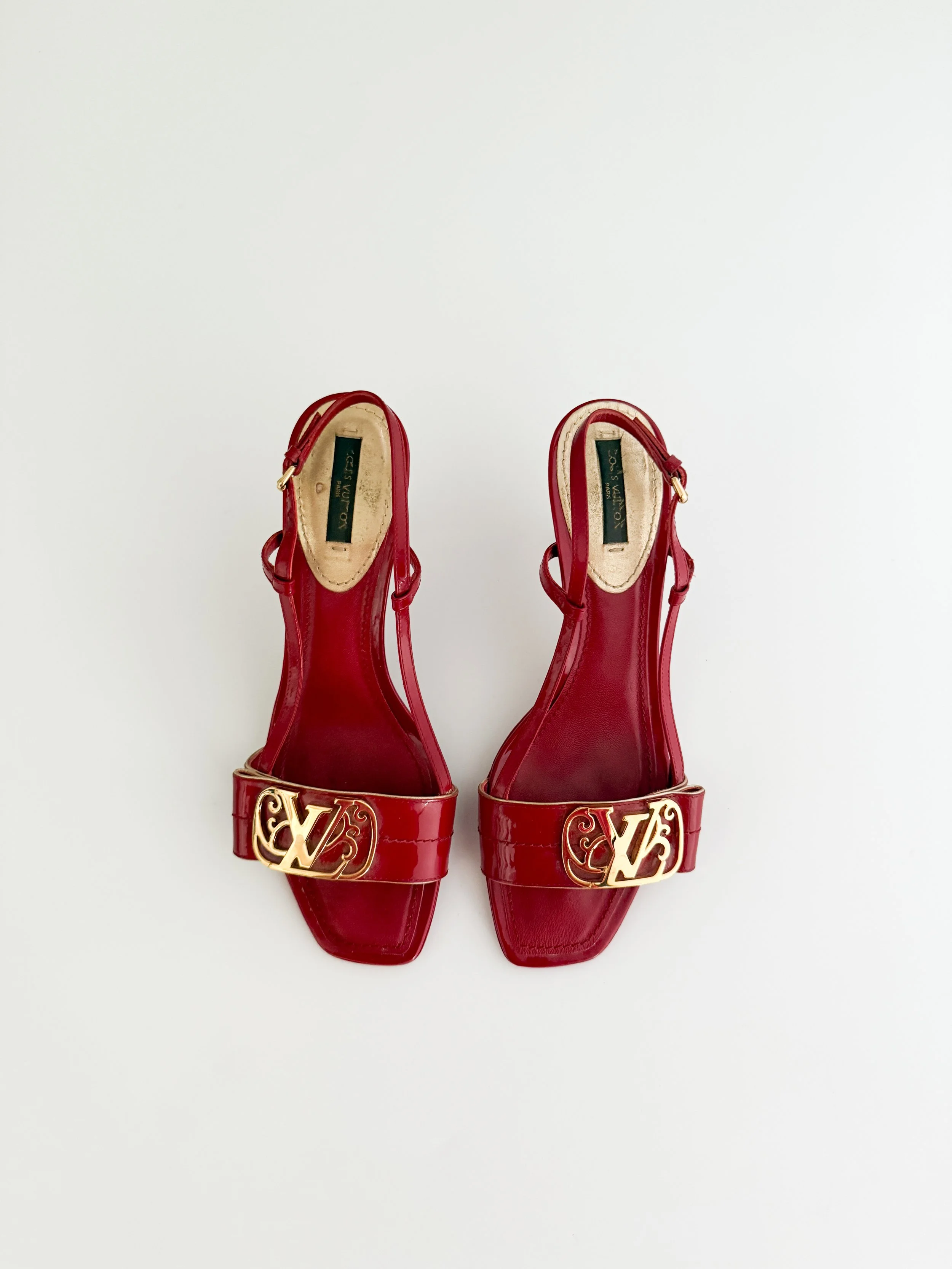 Louis Vuitton Dark Red Patent Leather "LV" Gilded Slingback Sandal Heels (US 7.5 / IT 37)