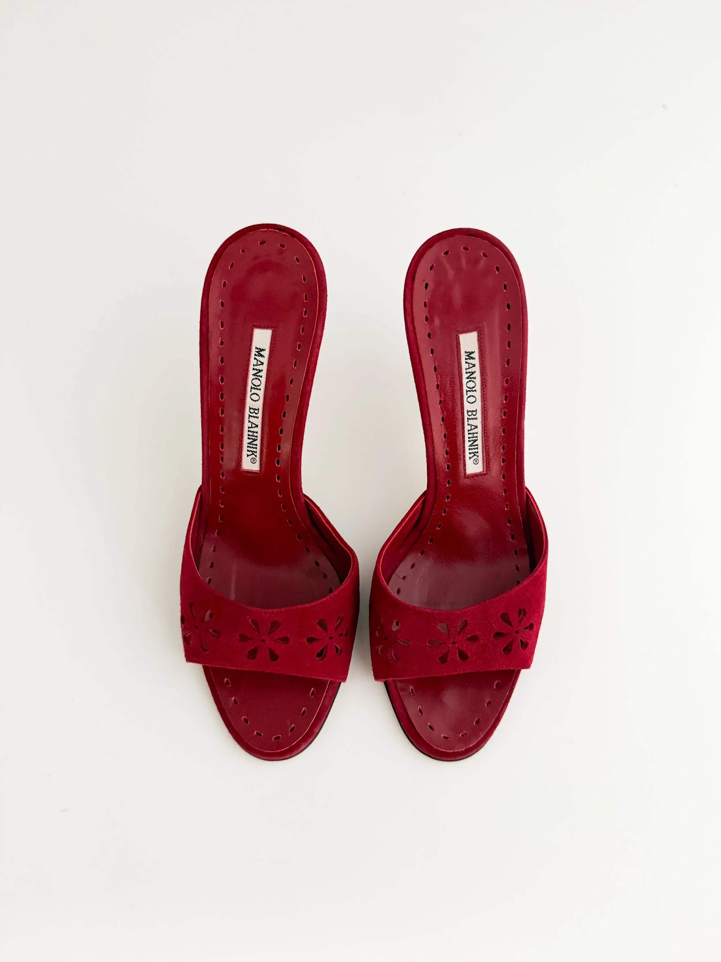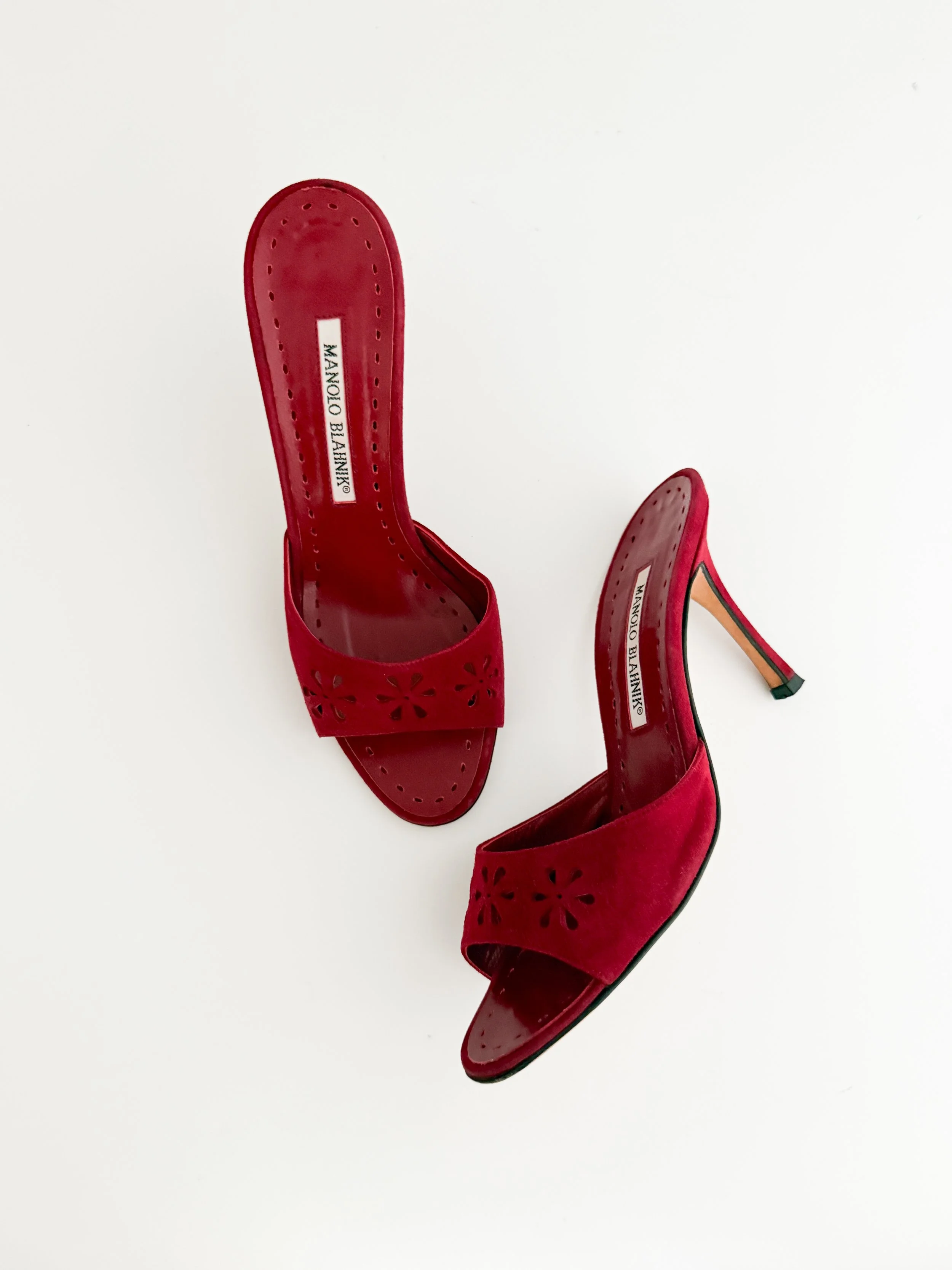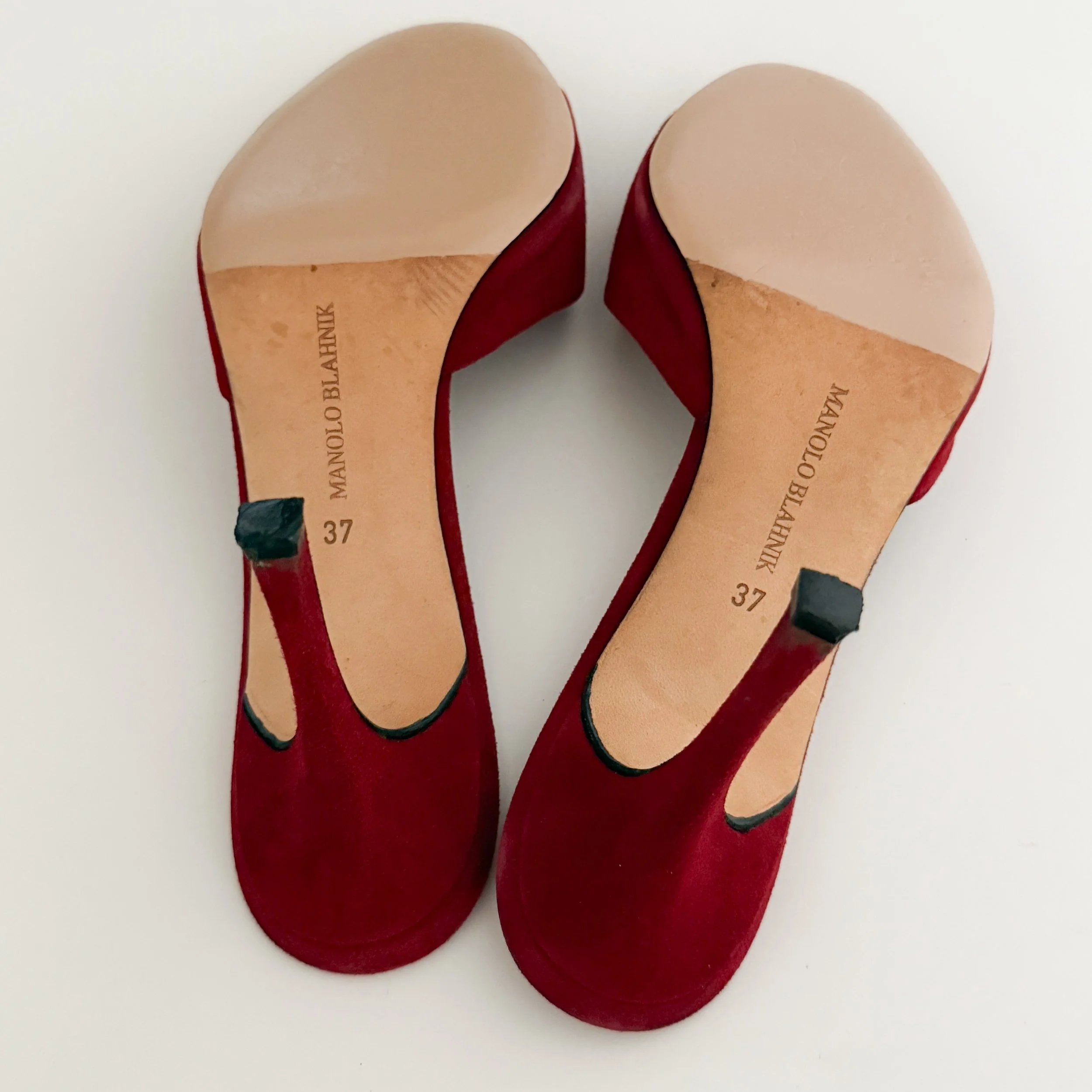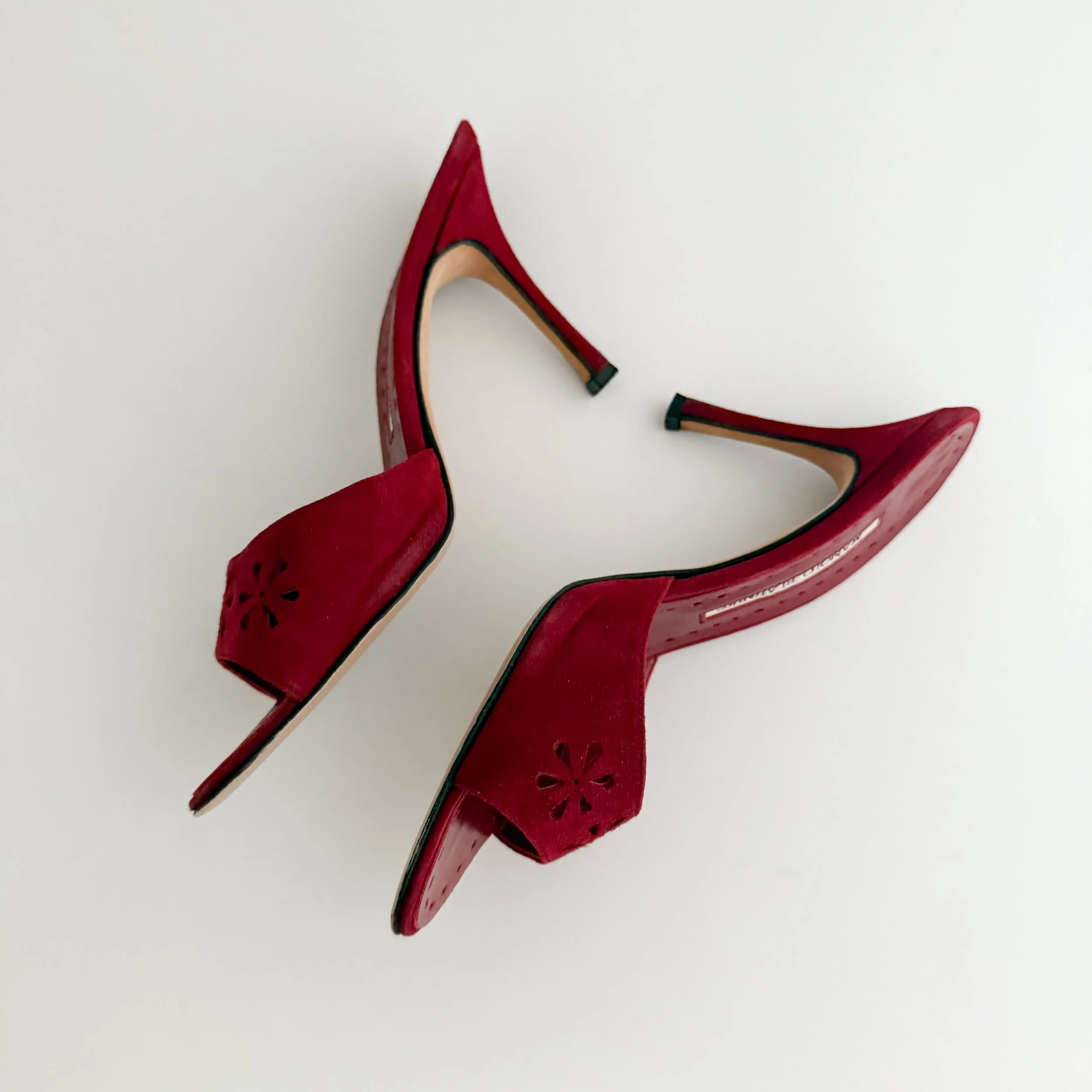 Manolo Blahnik Iconic Wine Red Suede Leather Eyelet Sandal Heels (US 7 / IT 37)