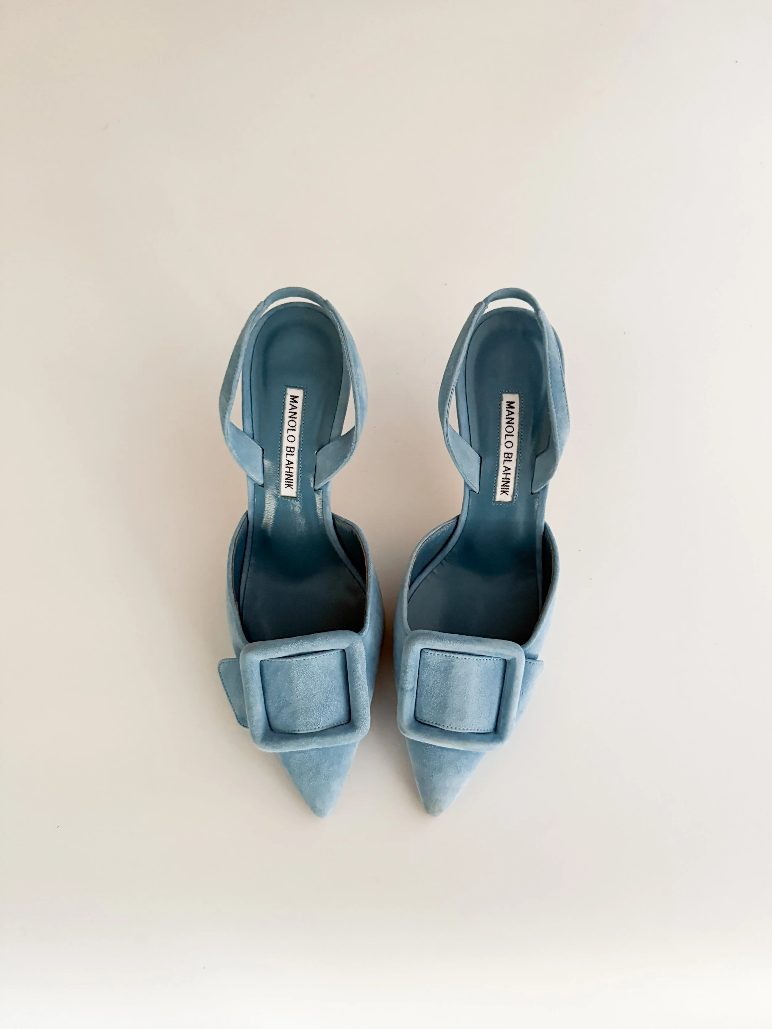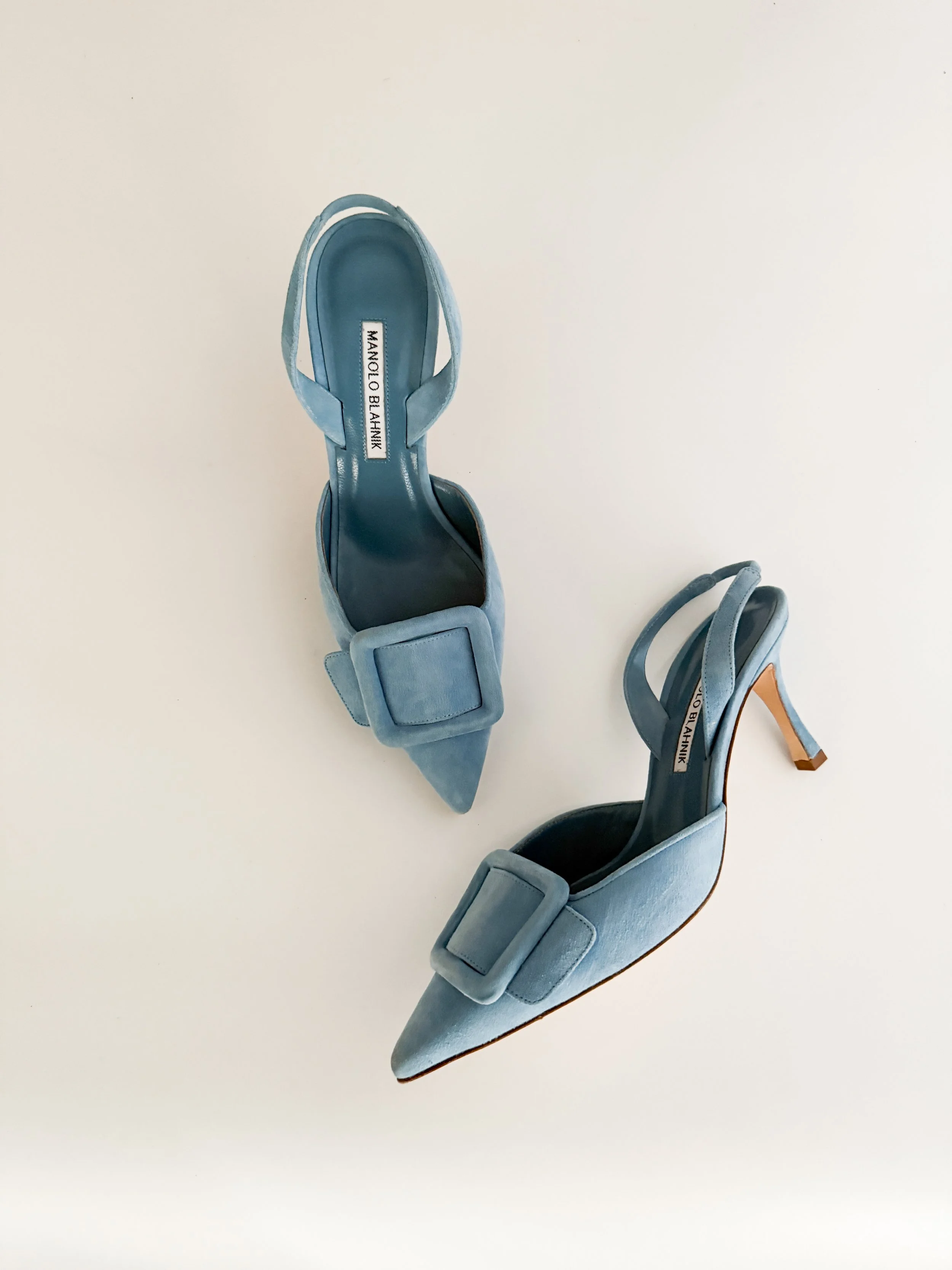 The most chic buckle mule heels from iconic luxury shoe designer Manolo Blahnik. So romantic and luxurious, the perfect “something blue” for a bride. A pair of heels to treasure forever.