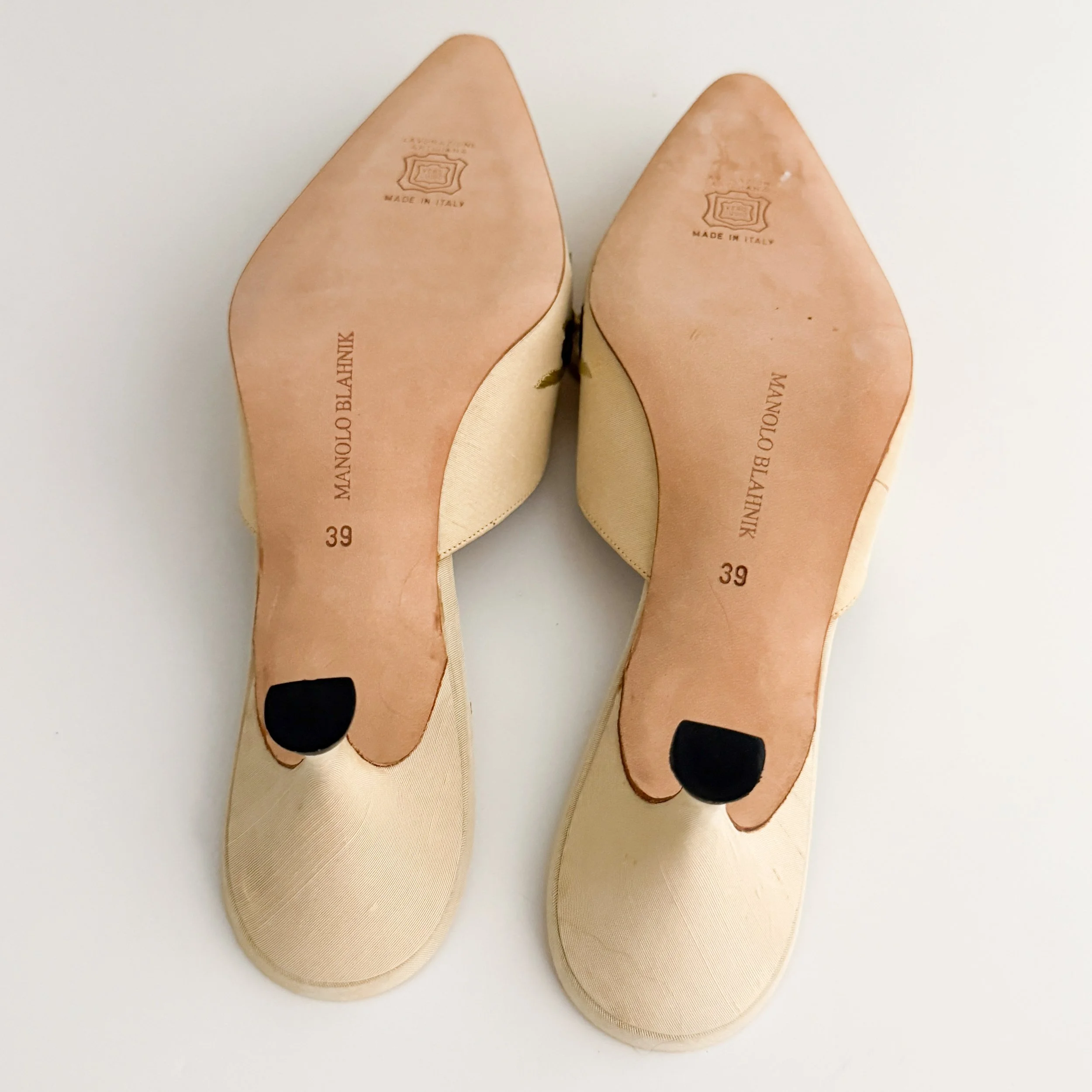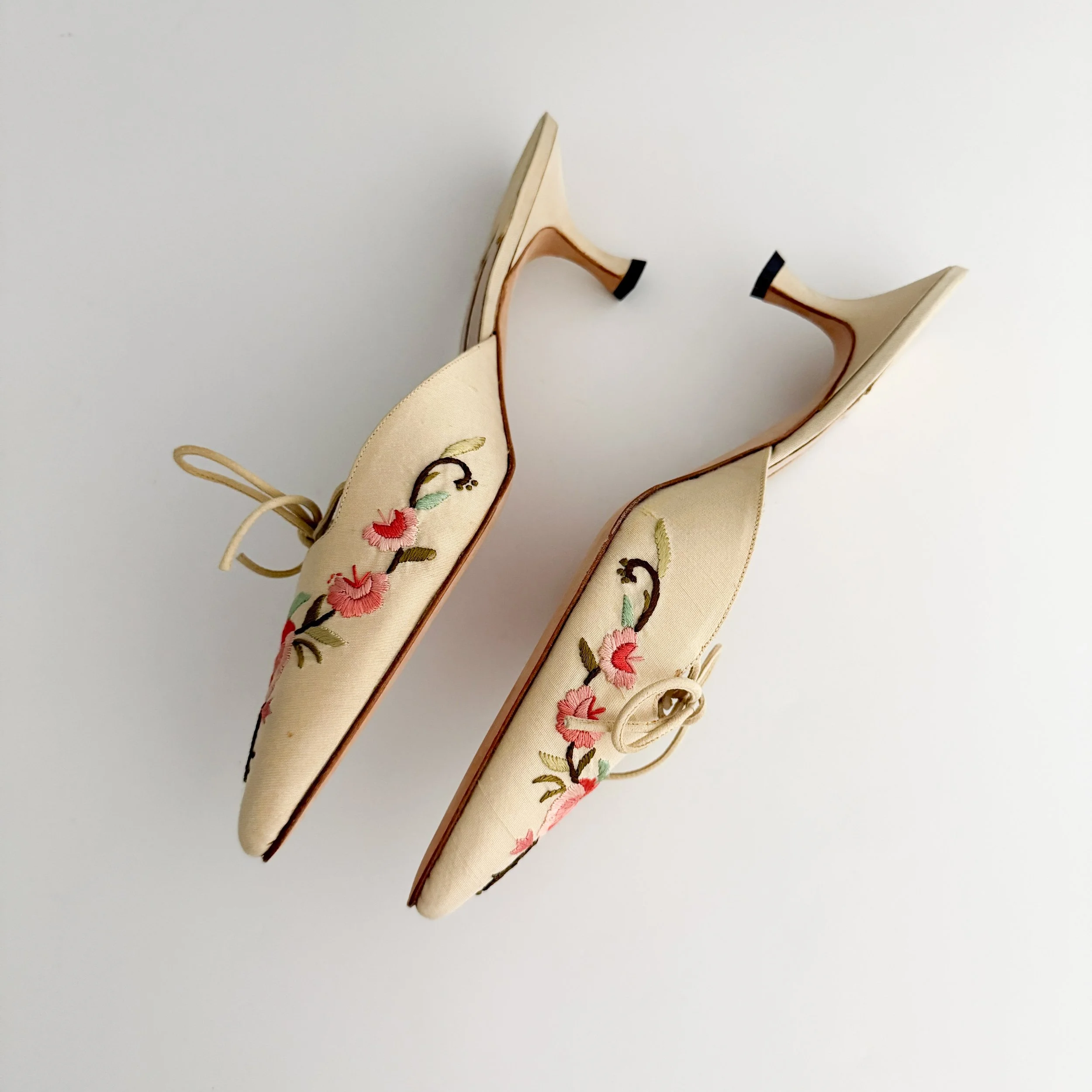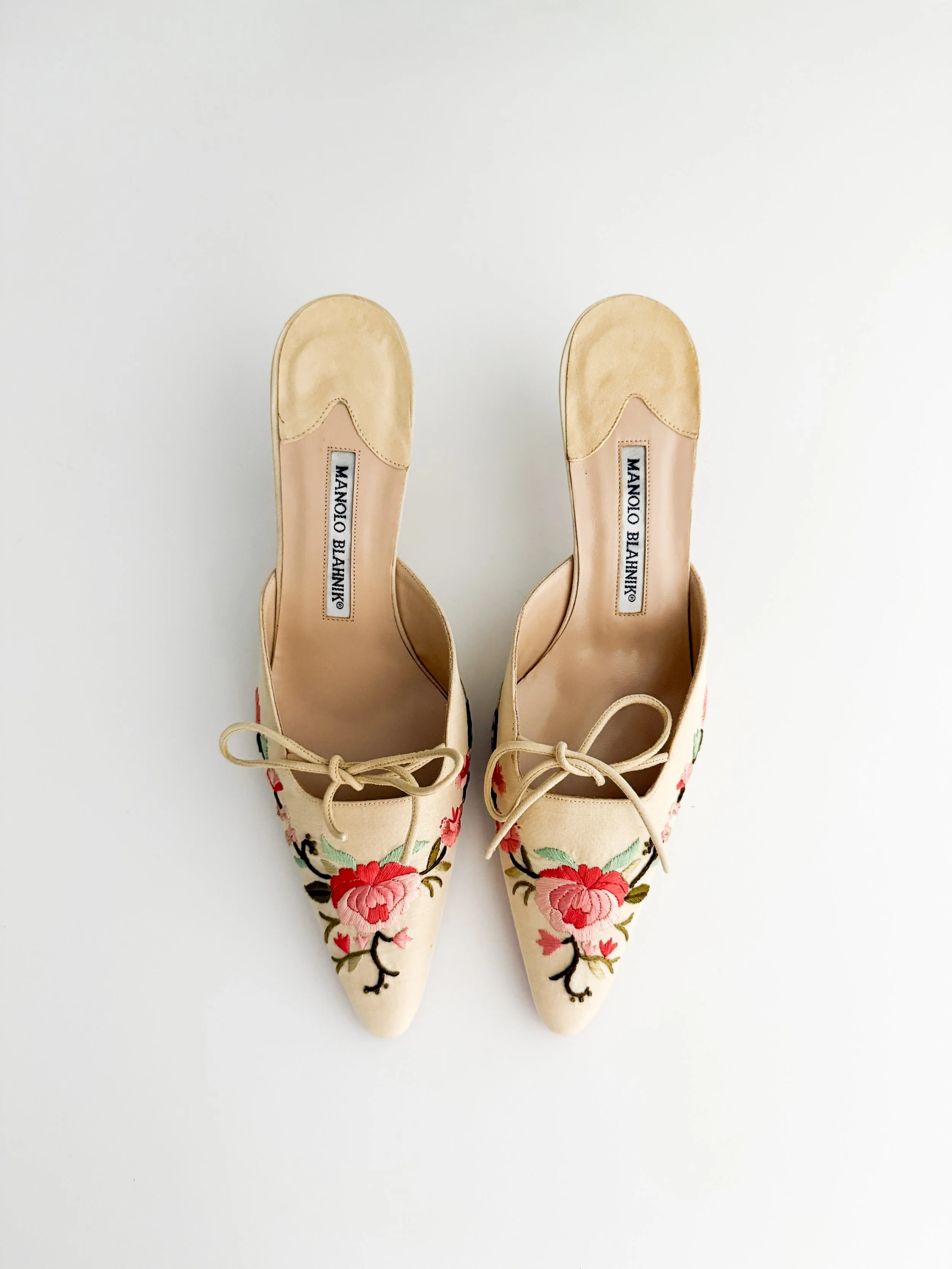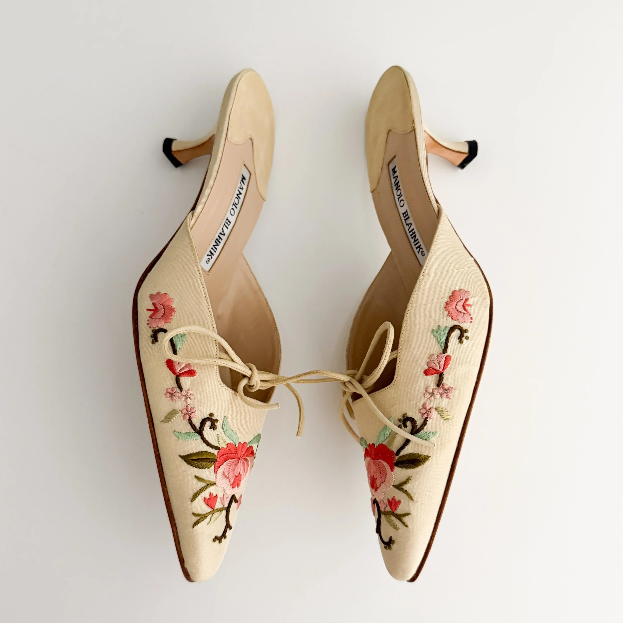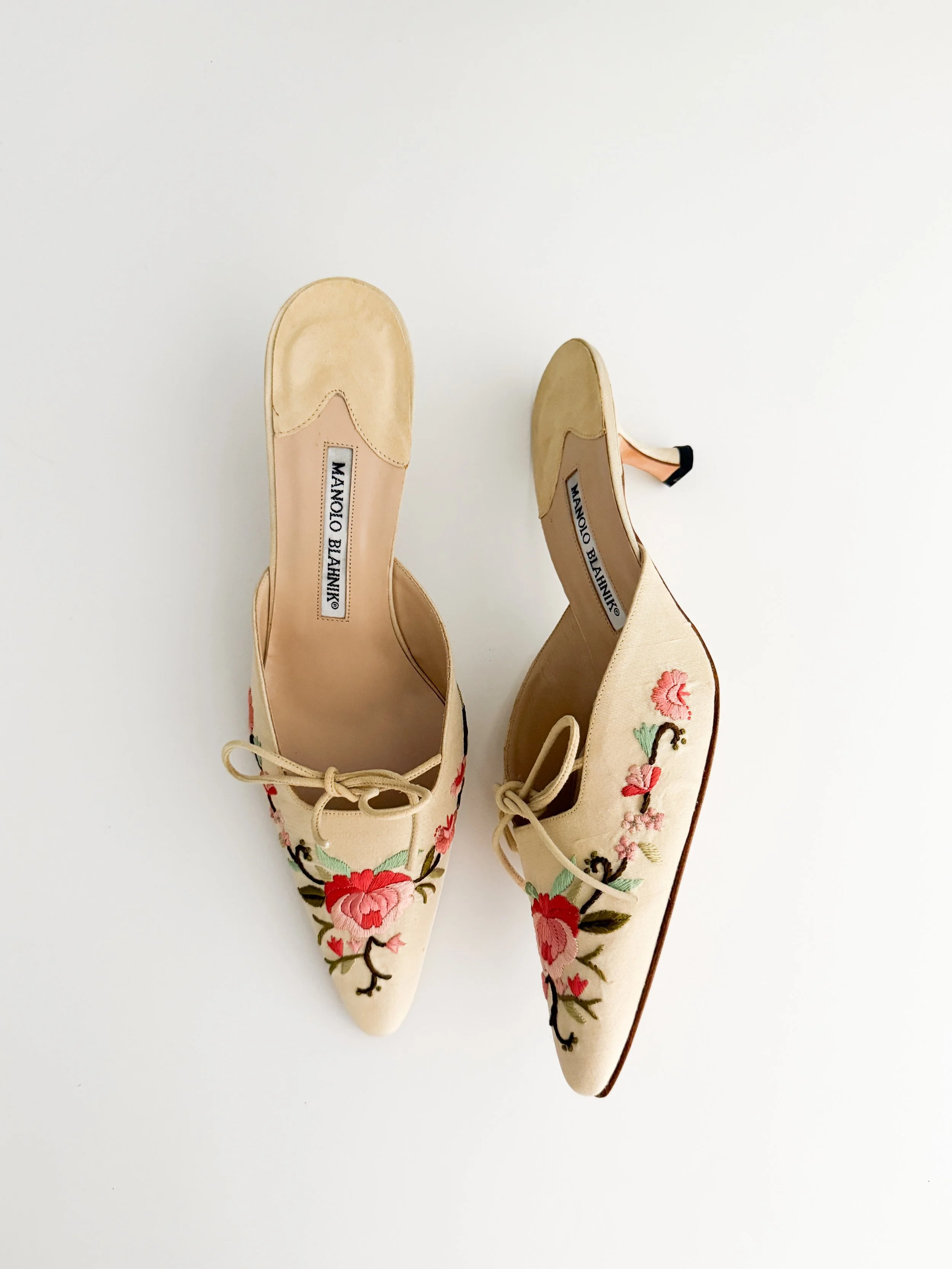 The most chic embroidered mule heels from iconic luxury shoe designer Manolo Blahnik. So romantic, absolutely perfect for the spring and summer seasons. A pair of heels to treasure forever.