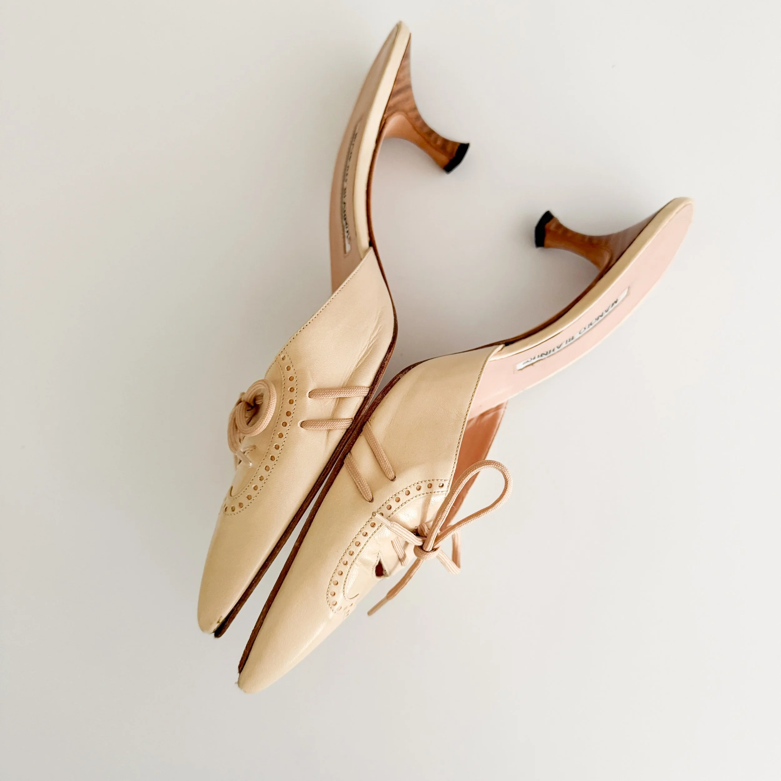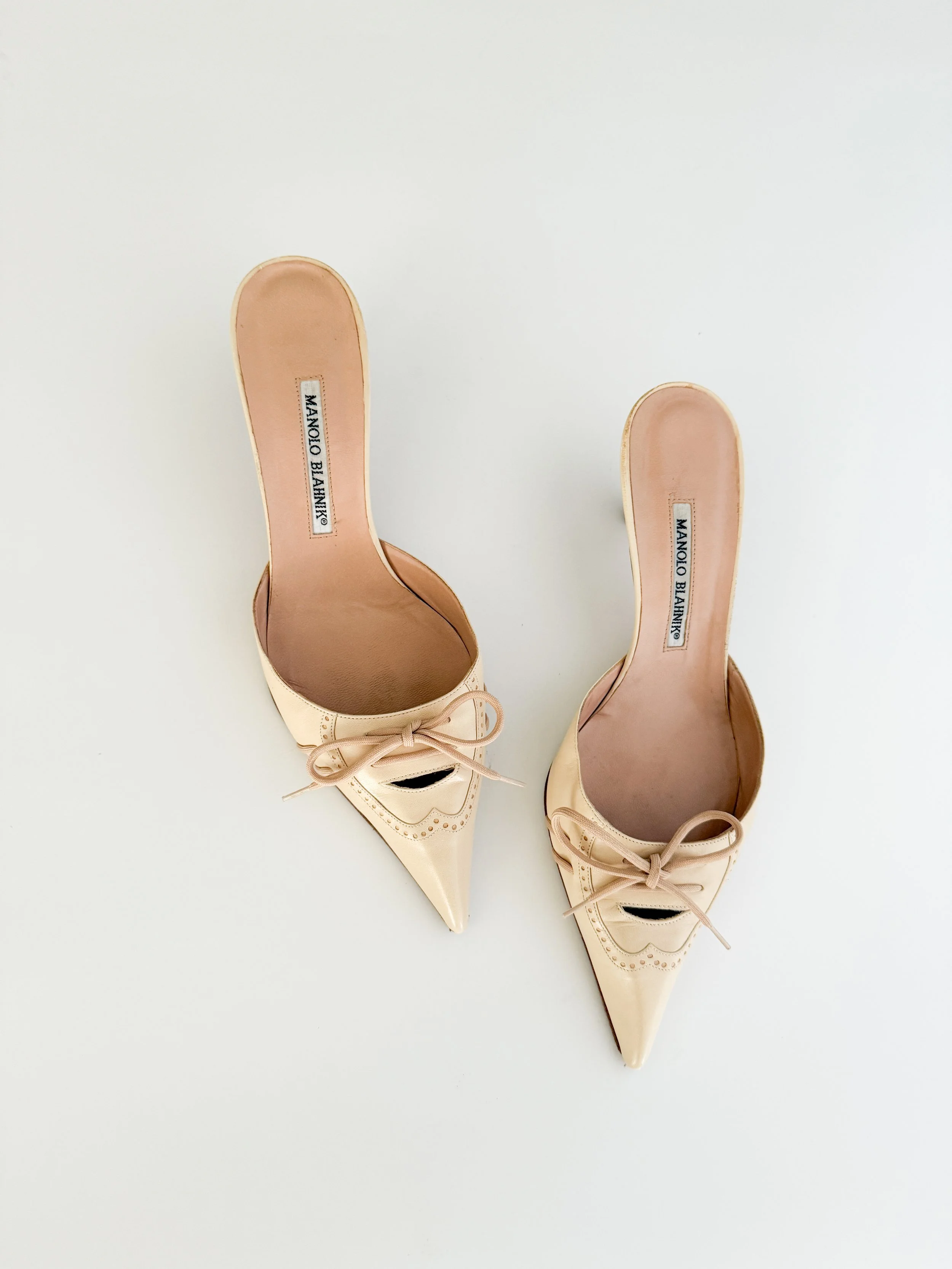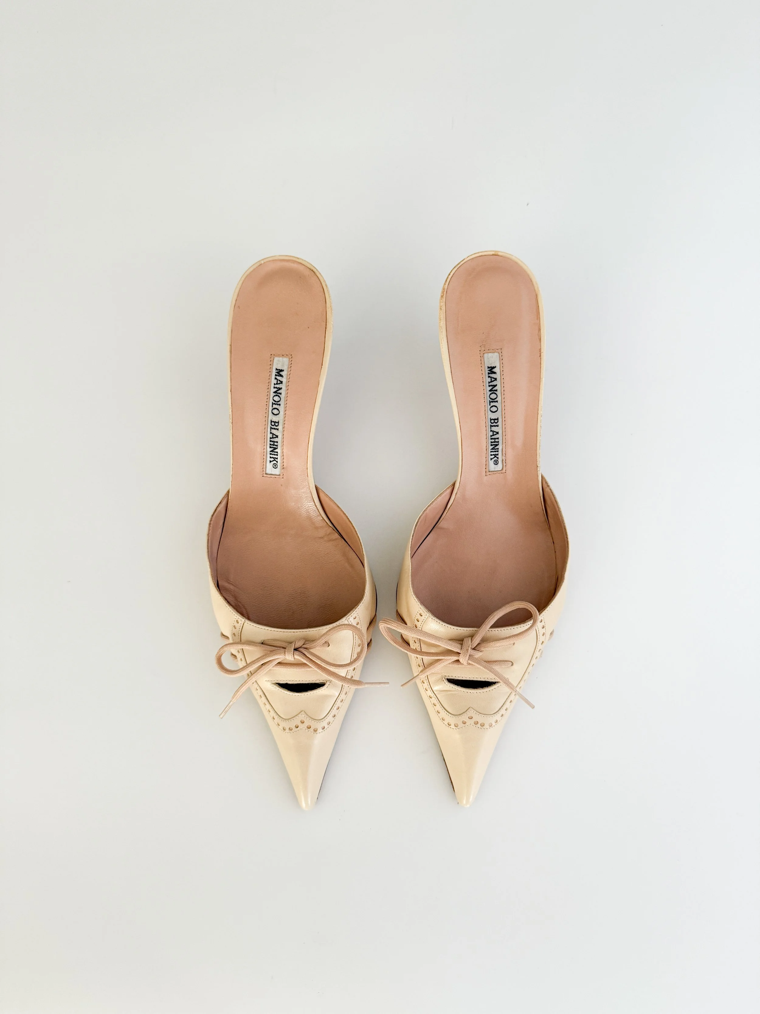 Manolo Blahnik Cream & Soft Pink Lace-Up Bow Mule Heels (US 10 / IT 40.5)