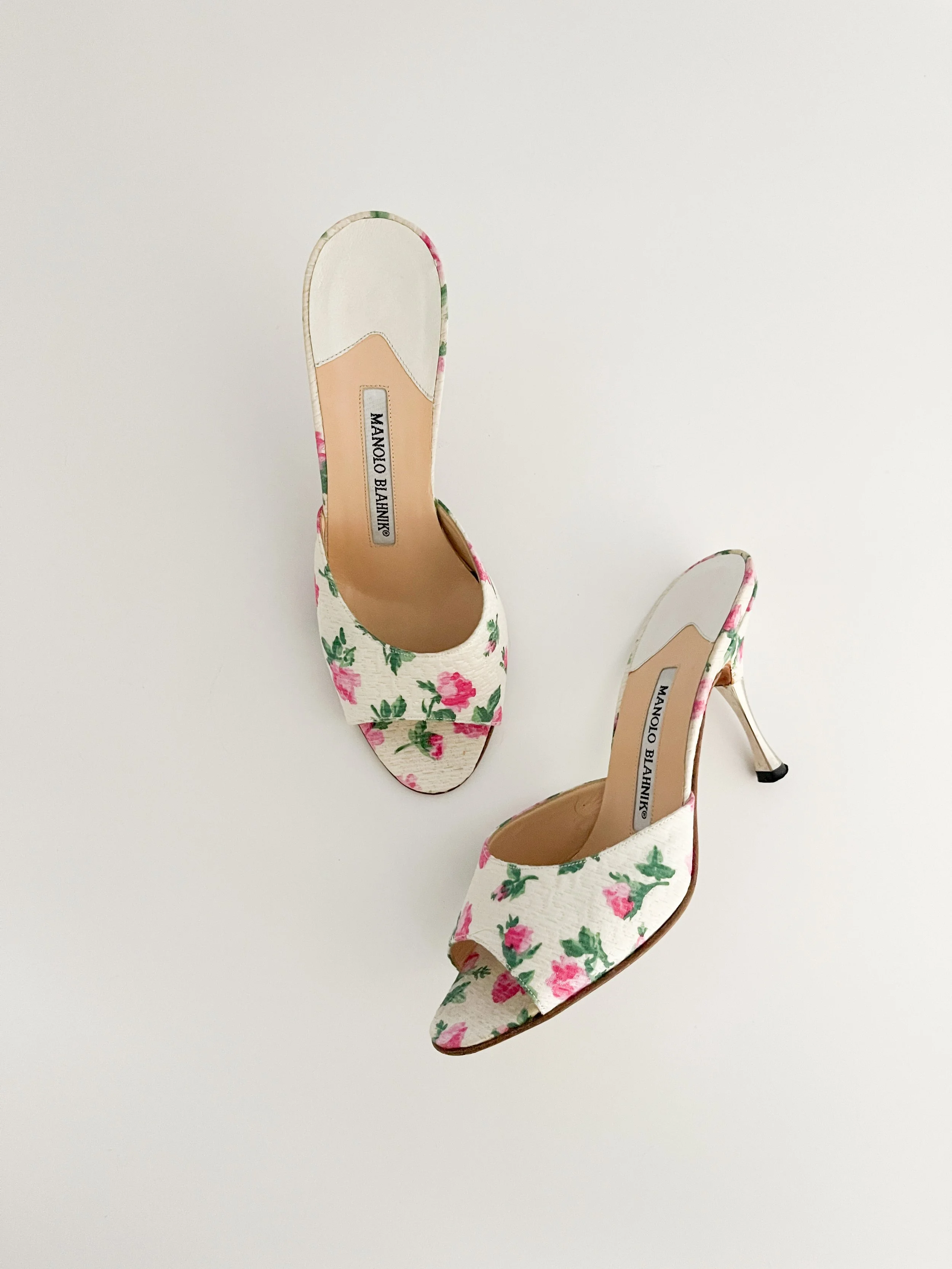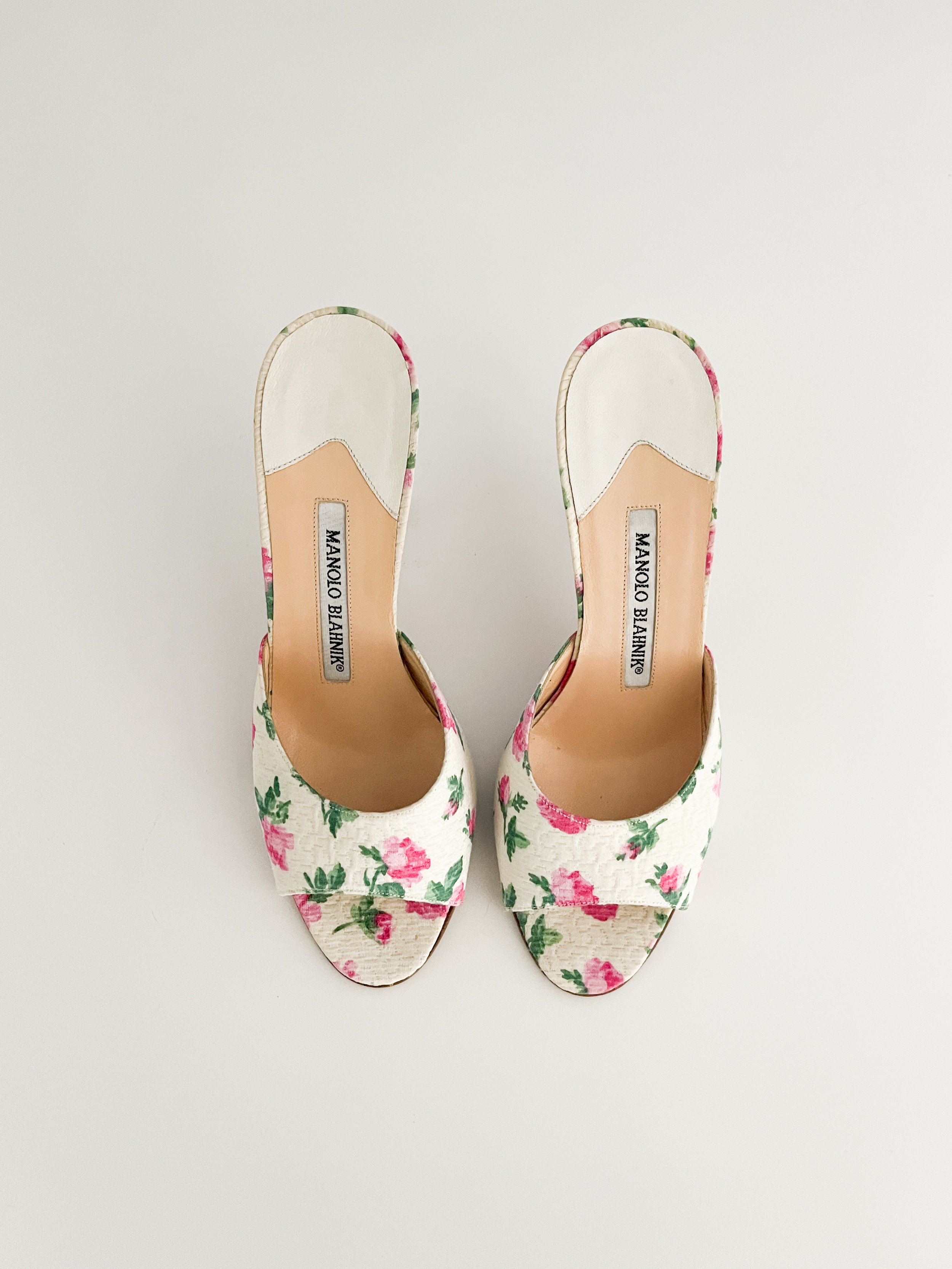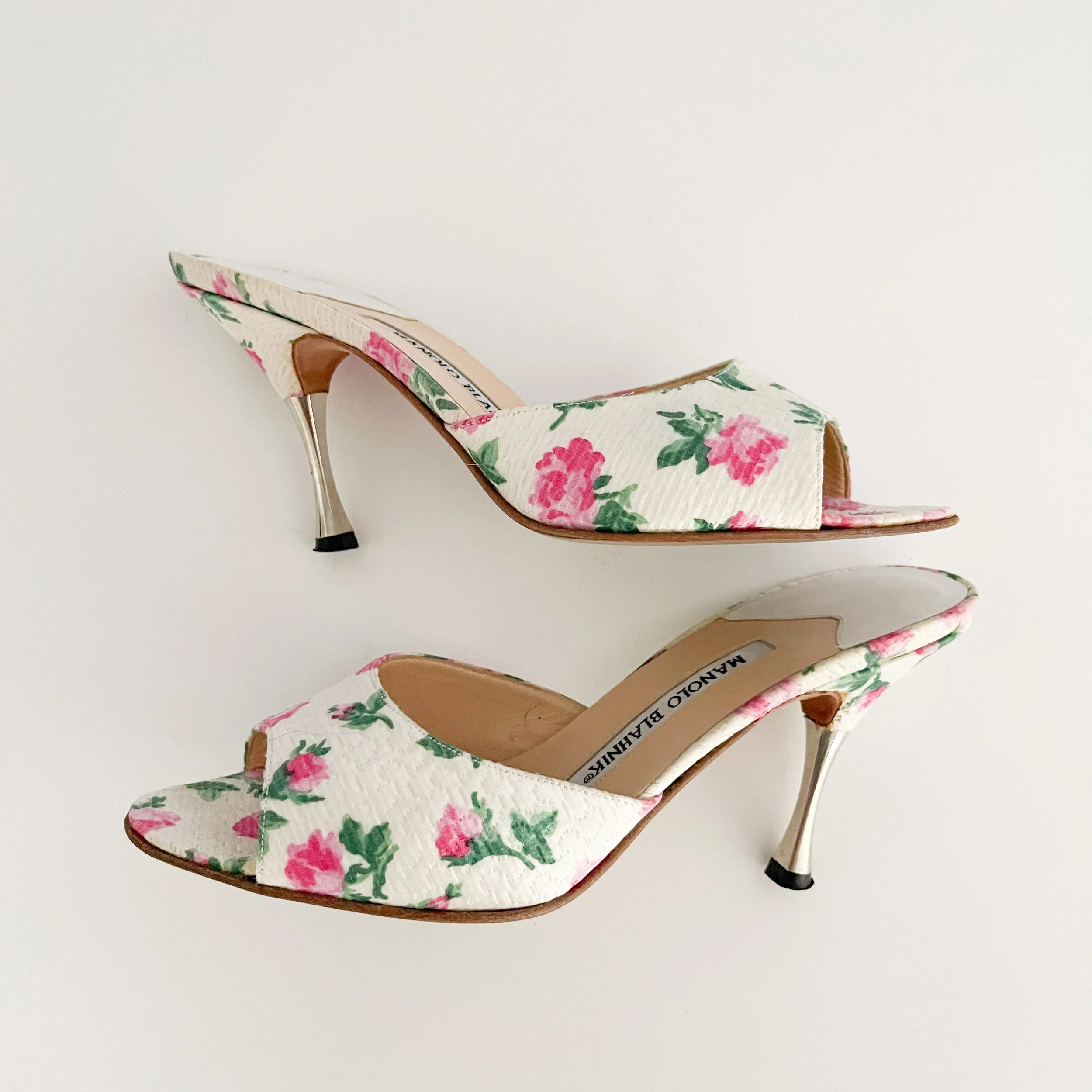 The most chic floral sandal heels from iconic luxury shoe designer Manolo Blahnik. Can be styled both casually and formally in endless ways. Timeless and luxurious.