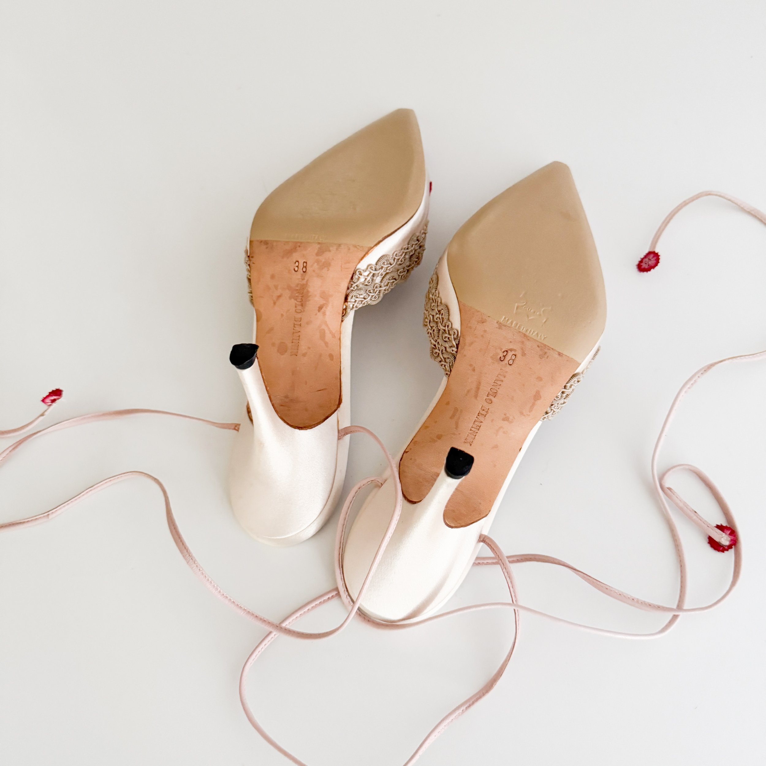 The most chic ankle wrap mule heels from iconic luxury shoe designer Manolo Blahnik. Can be styled both casually and formally in endless ways. A pair of heels to treasure forever.