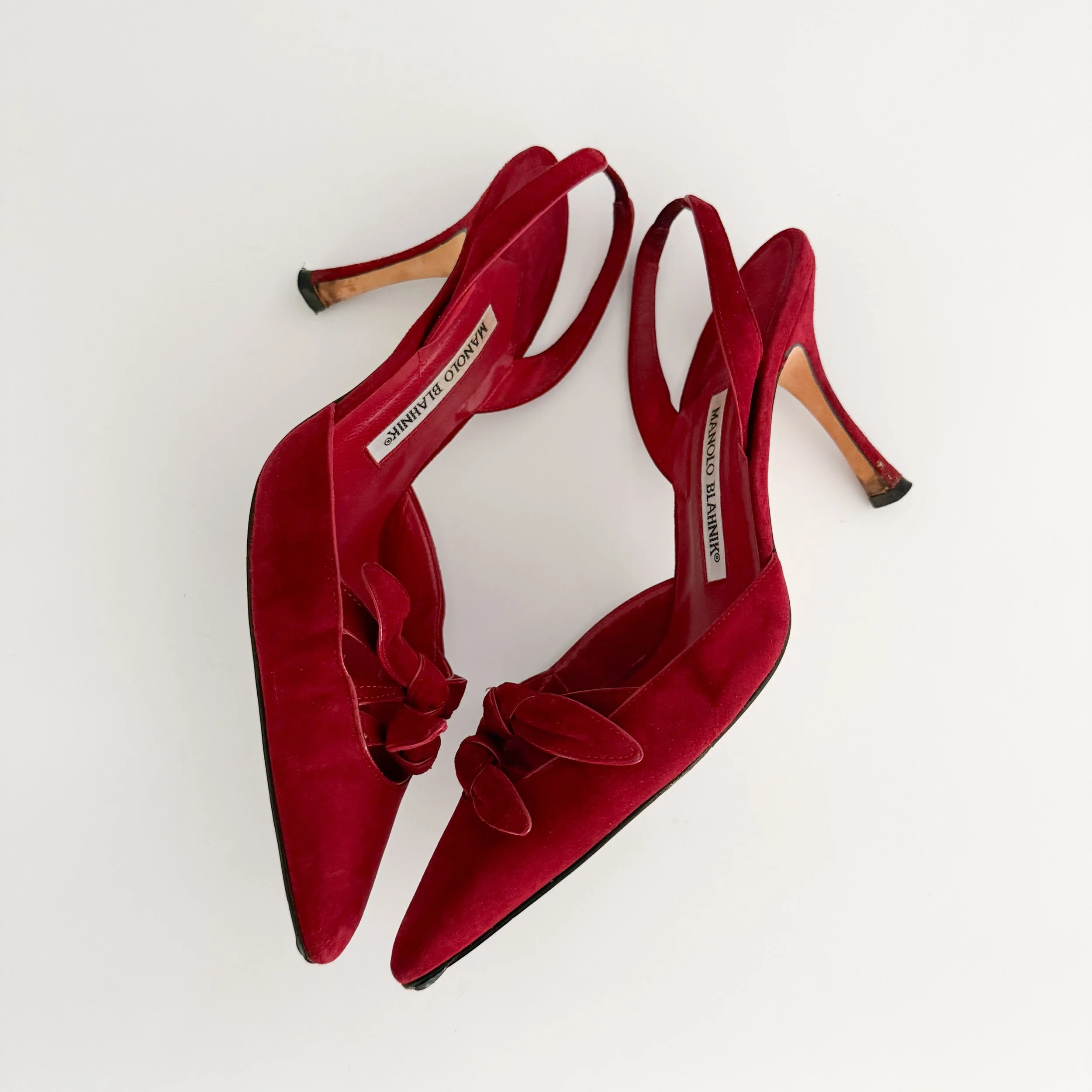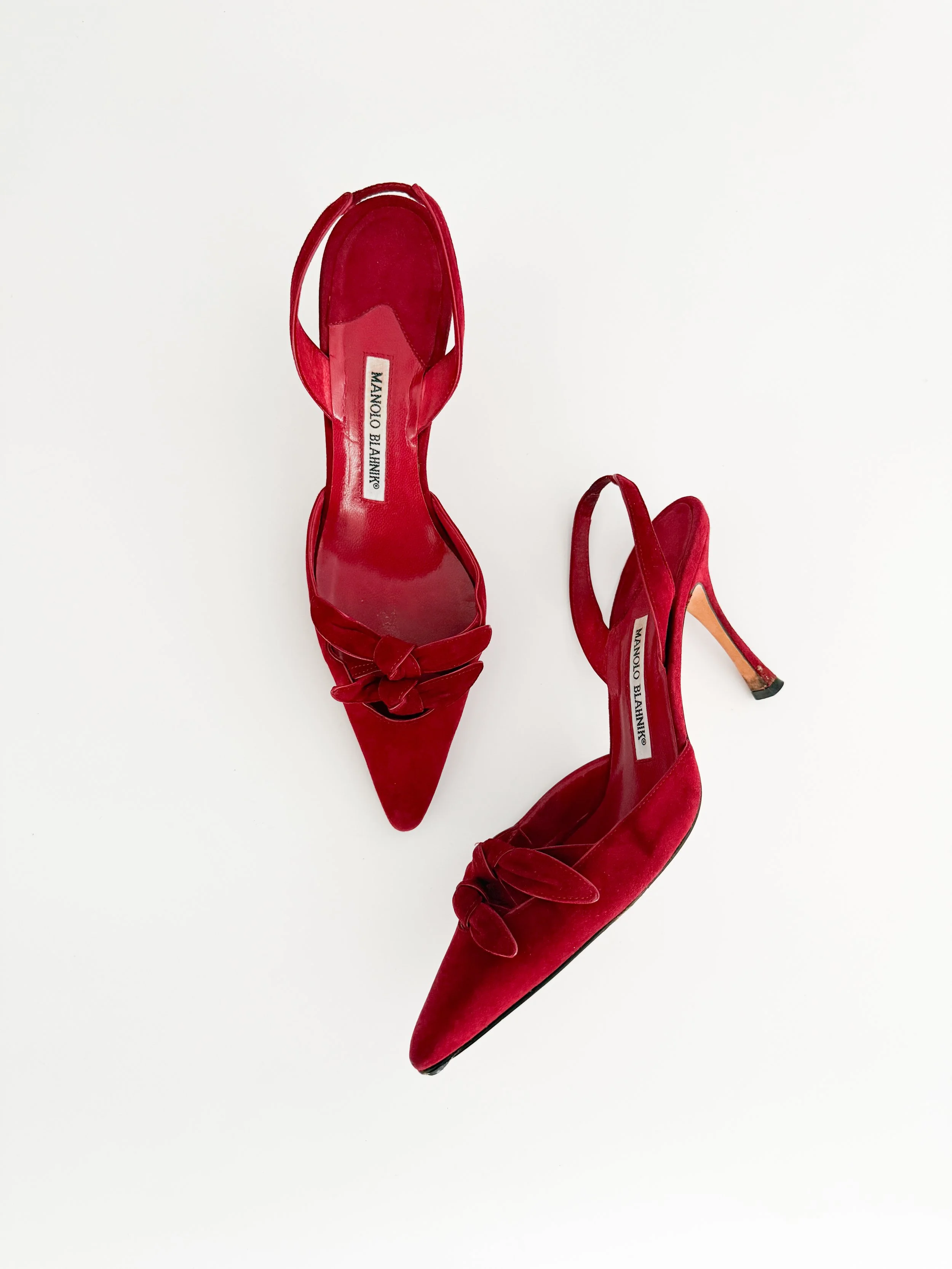 Manolo Blahnik Dark Red Suede Bow Slingback Mule Heels (US 8.5 / IT 39)