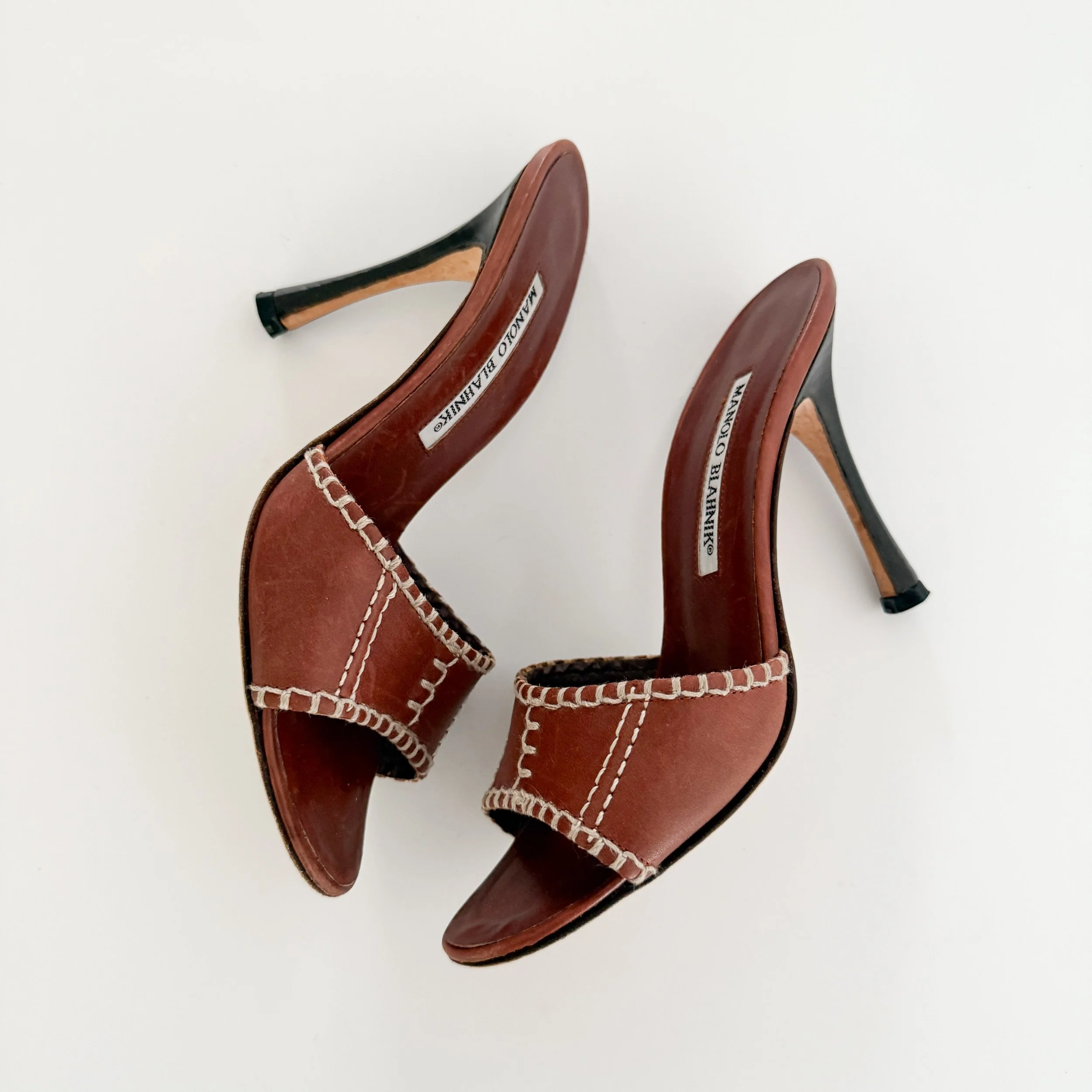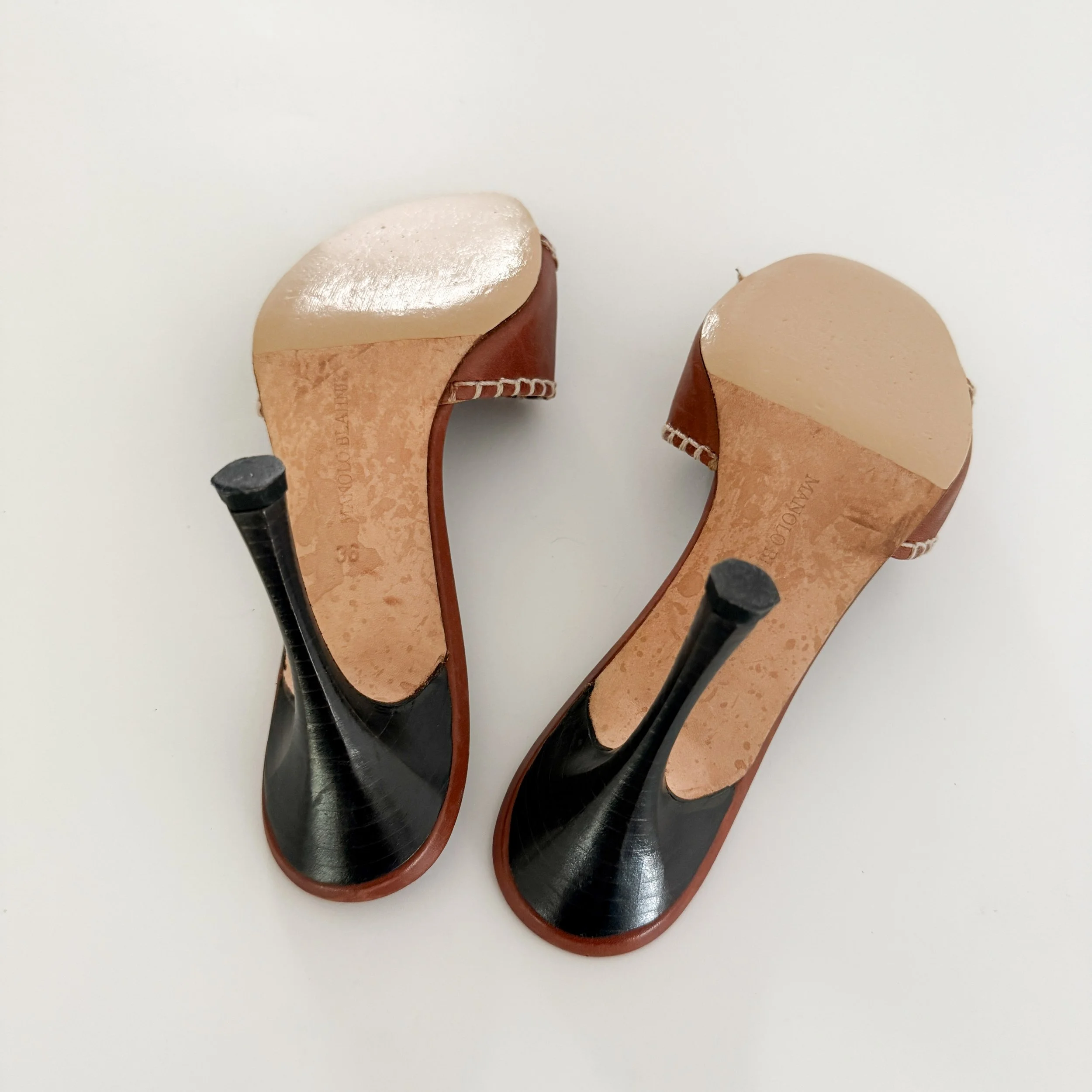 The most chic leather sandal heels from iconic luxury shoe designer Manolo Blahnik. Can be styled both casually and formally in endless ways. Perfect for year 'round wear. So timeless and luxurious.