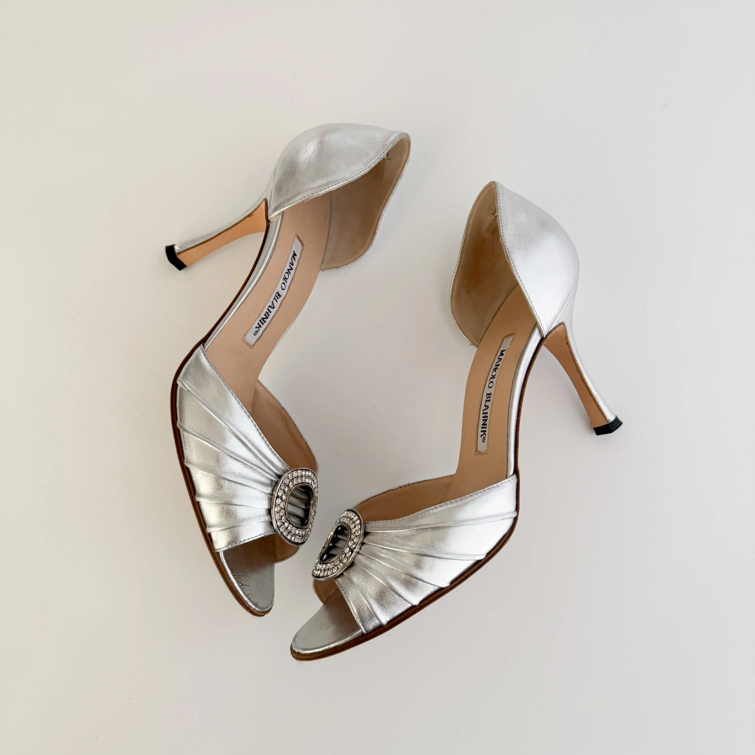 The most chic silver heels from iconic luxury shoe designer Manolo Blahnik. Can be styled both casually and formally in endless ways. So darling. A signature pair of heels.