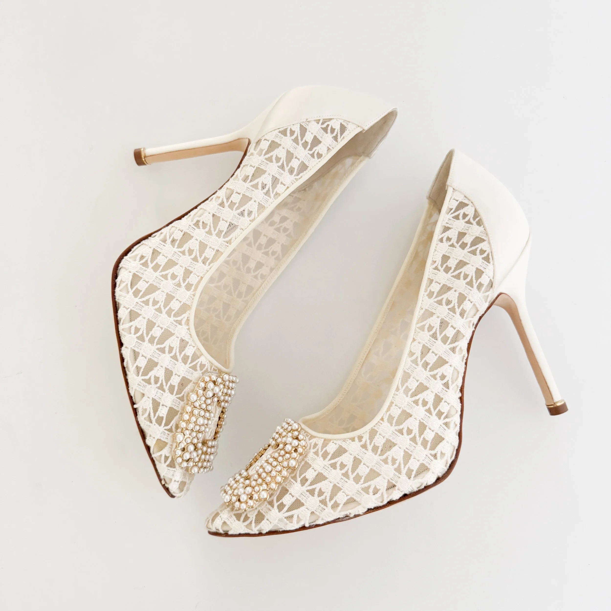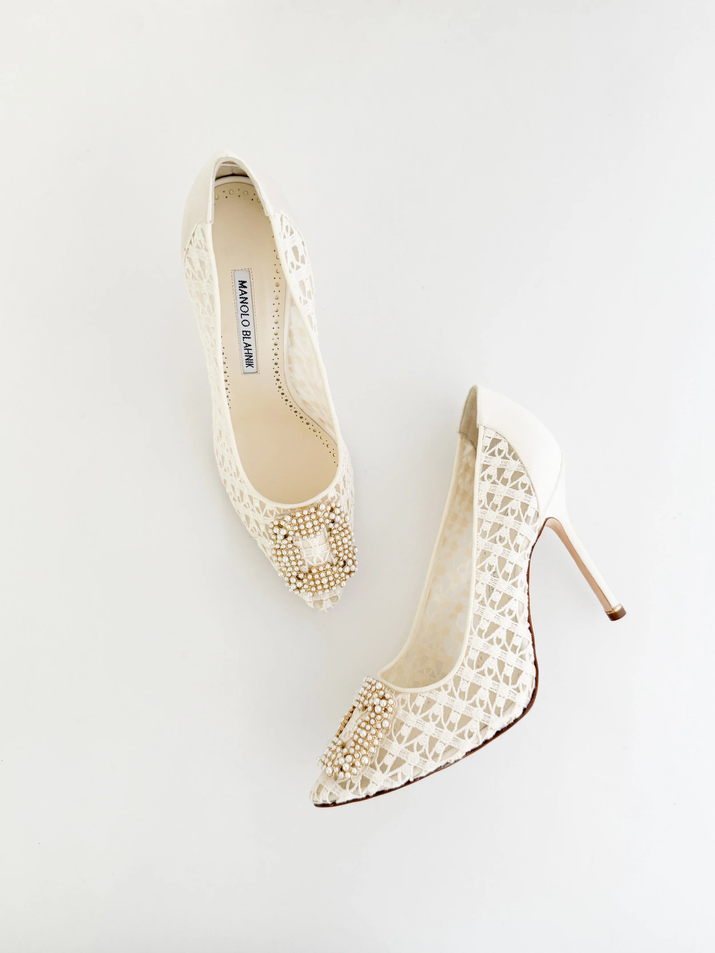 The most chic mini faux-pearl beaded heels from iconic luxury shoe designer Manolo Blahnik. So timeless and classic. A signature pair of heels. Perfect for a bride.