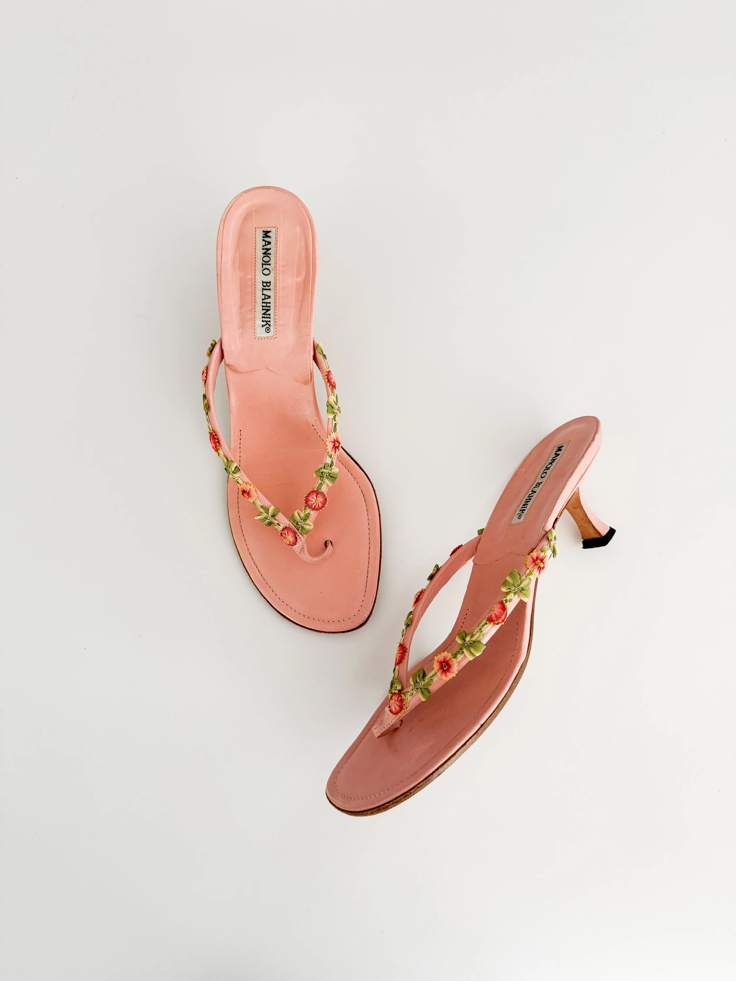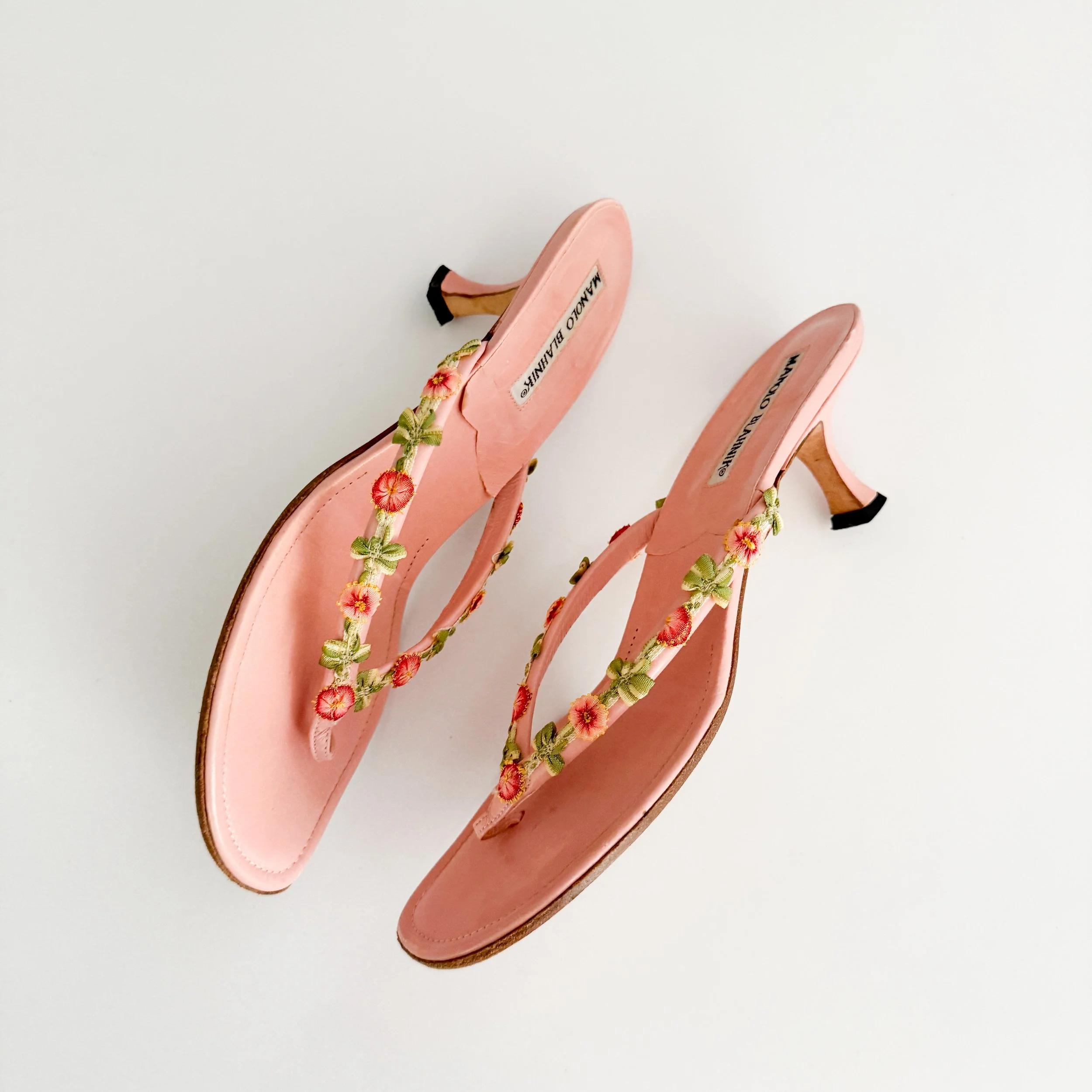 Manolo Blahnik Pink Floral Kitten Sandal Heels (US 7.5 / IT 38)