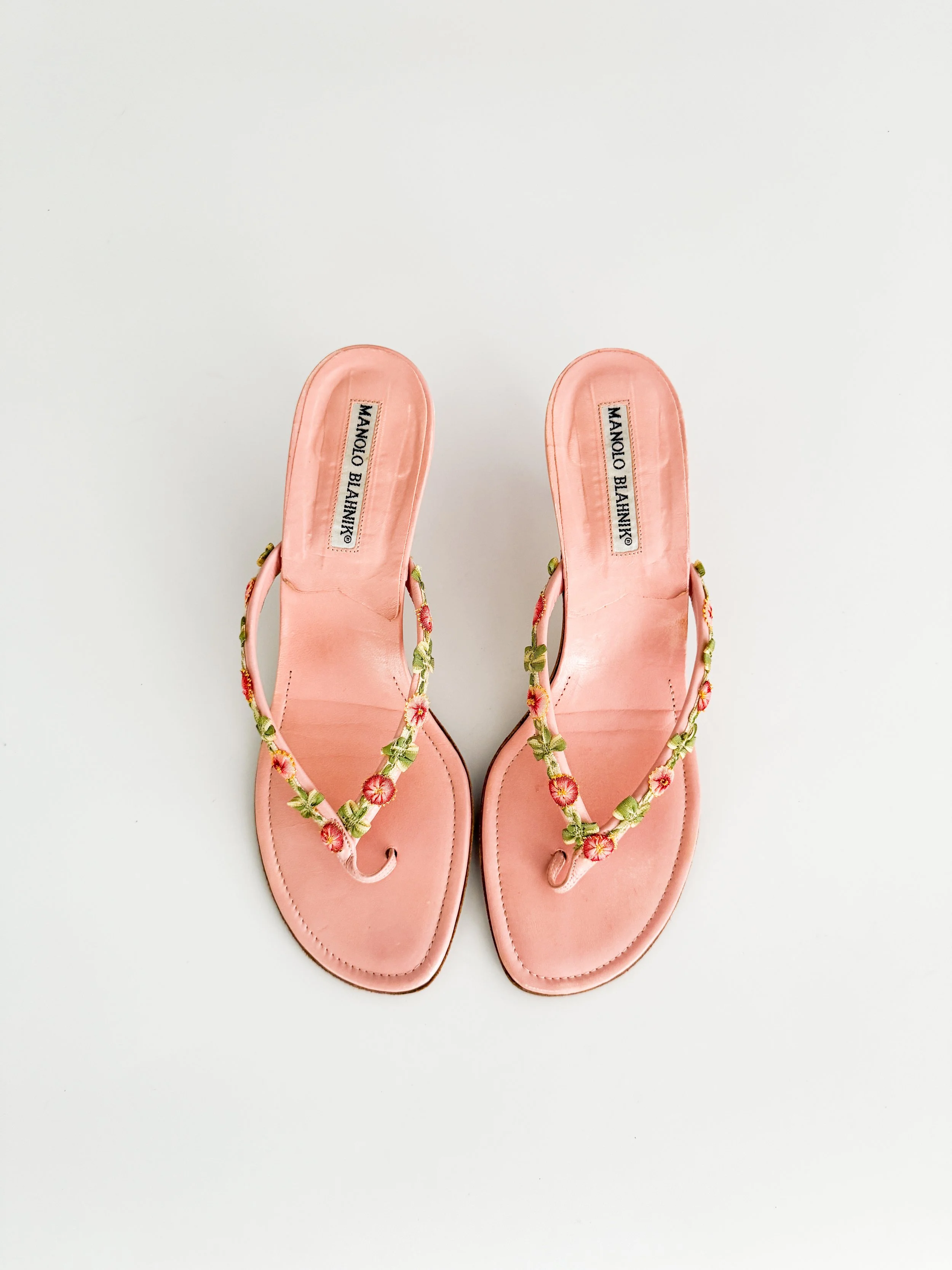 The most chic pink floral sandal heels from iconic luxury shoe designer Manolo Blahnik. Can be styled both casually and formally in endless ways. A pair of heels to treasure forever.