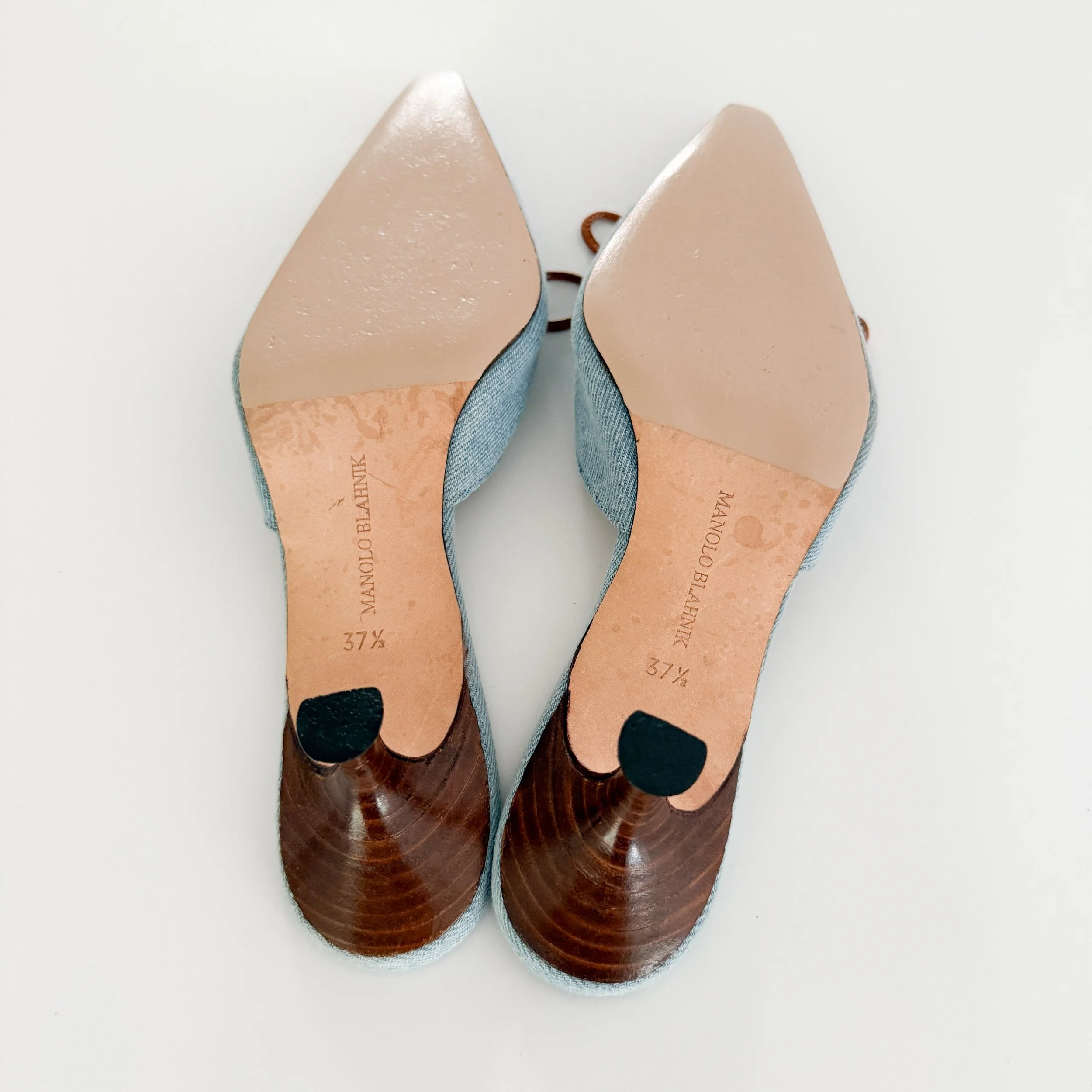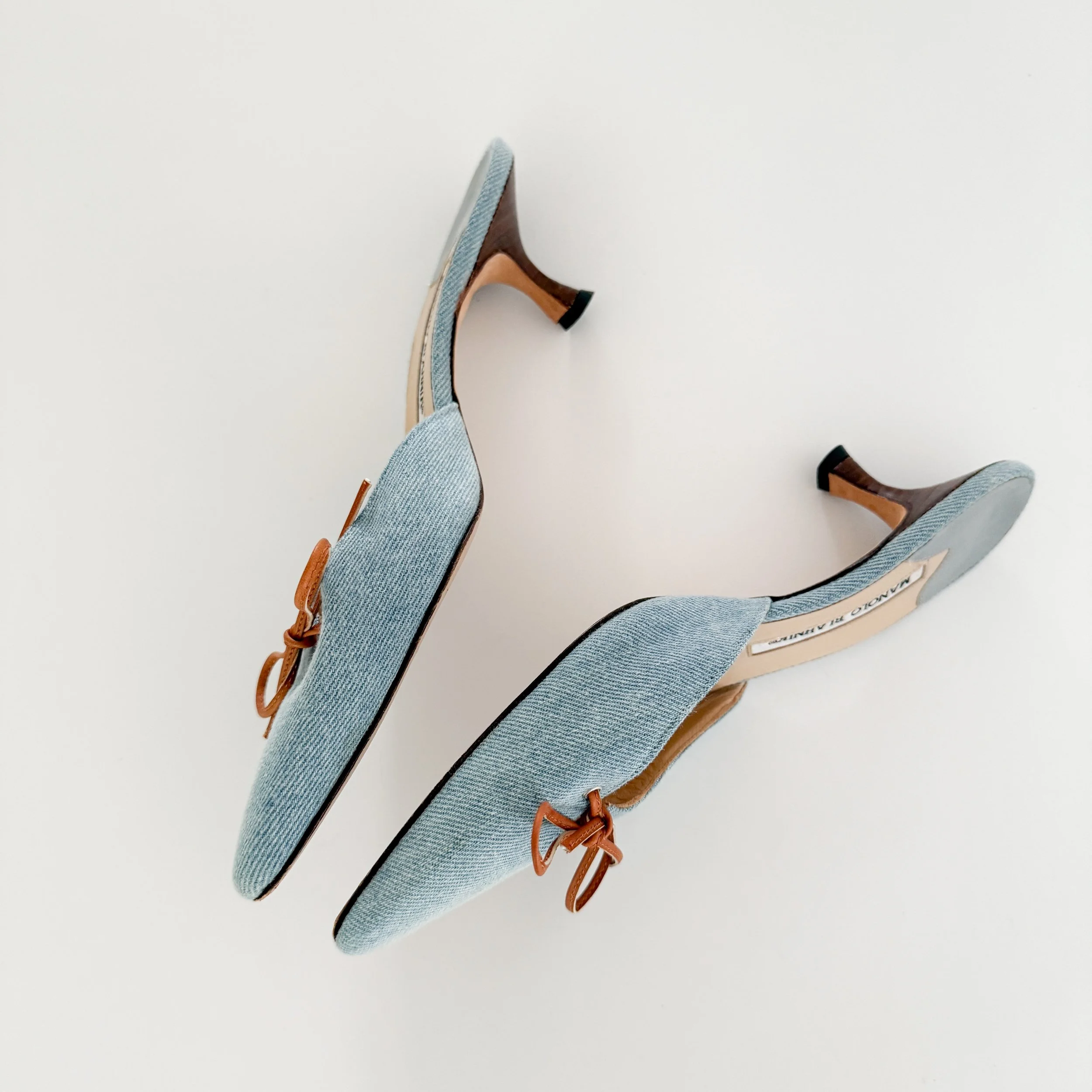 Manolo Blahnik Denim Bow Kitten Mule Heels (US 7.5 / IT 37.5)