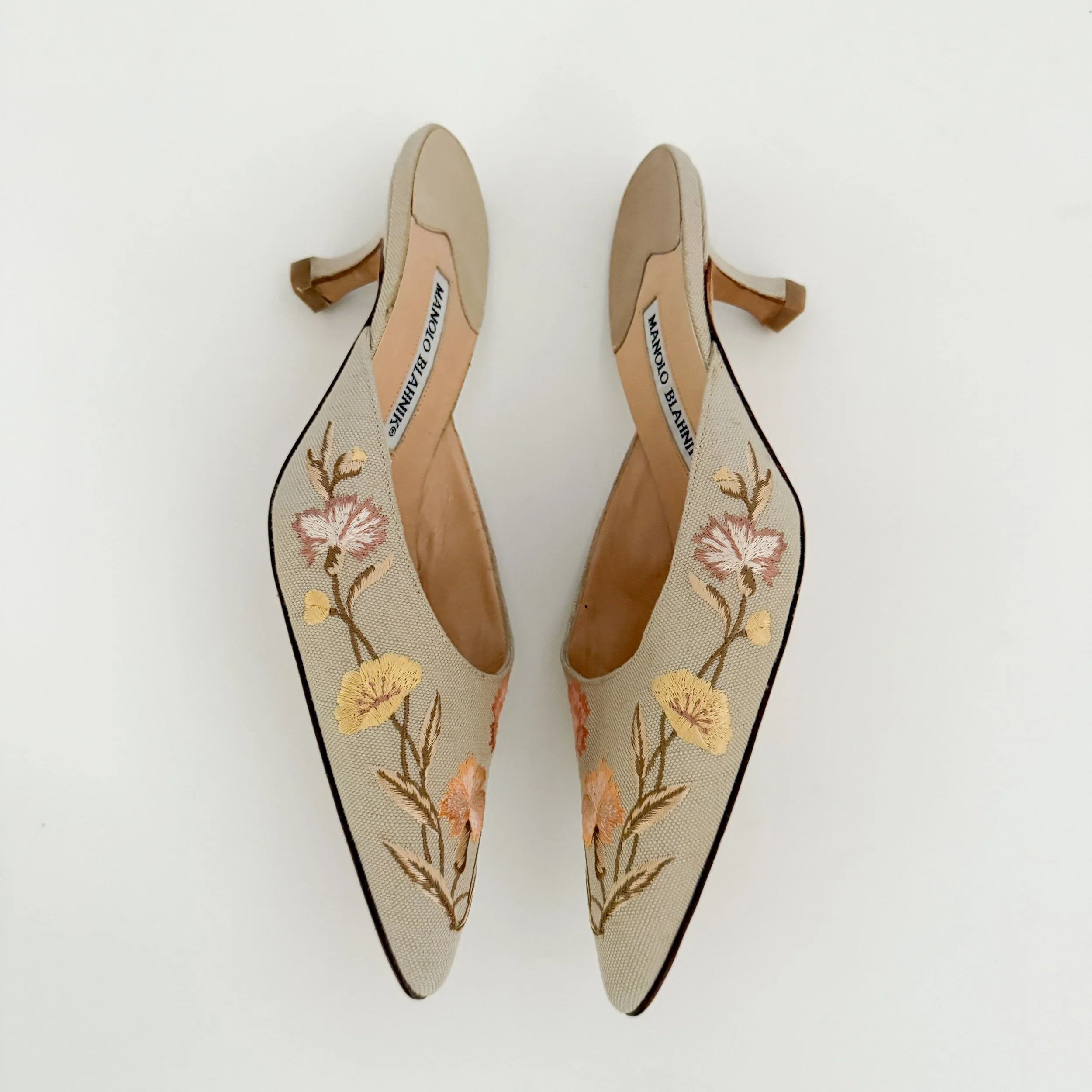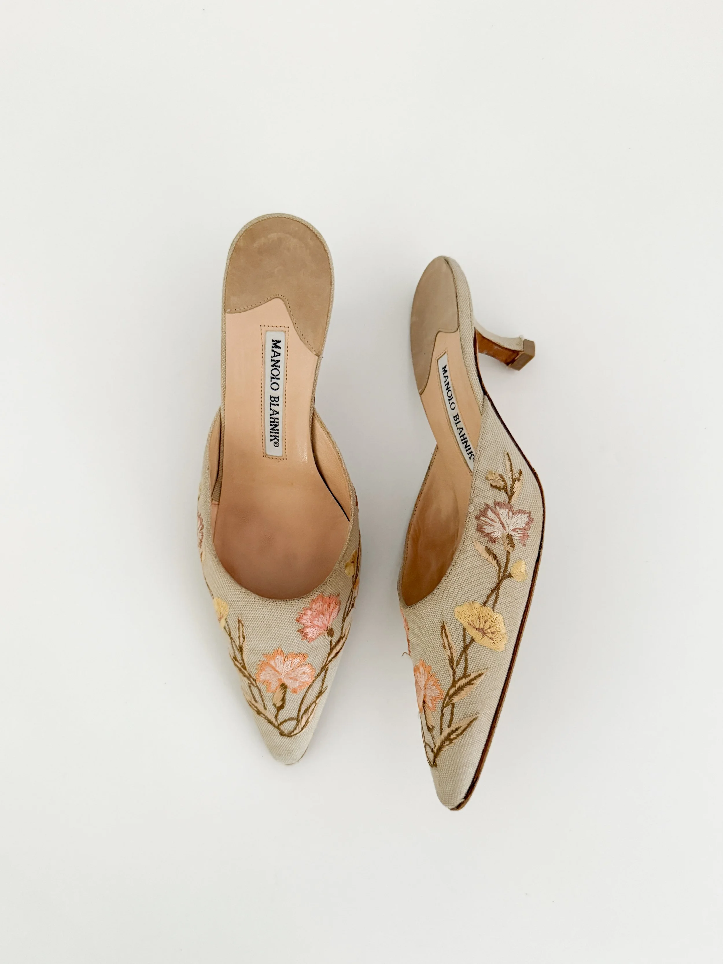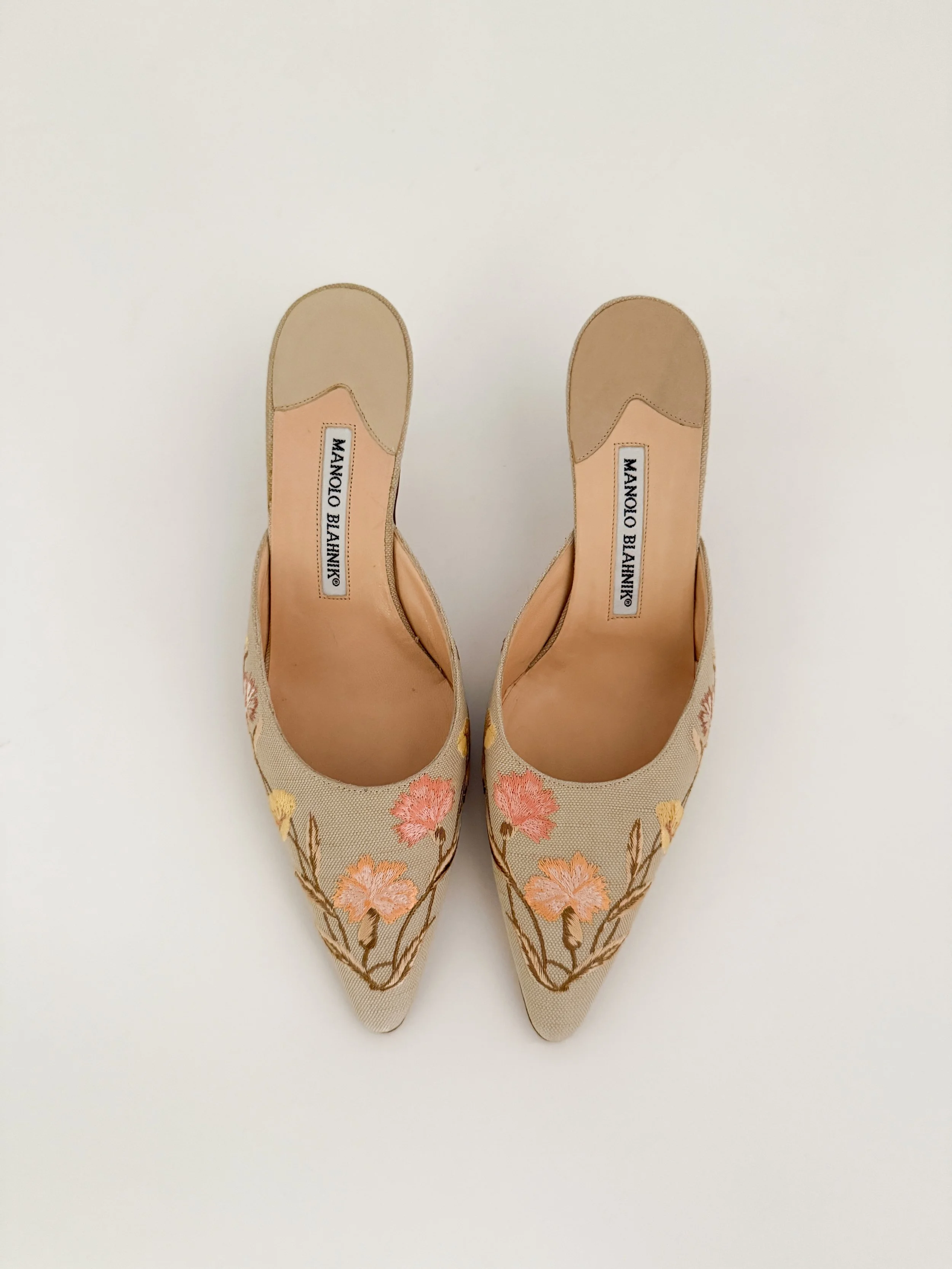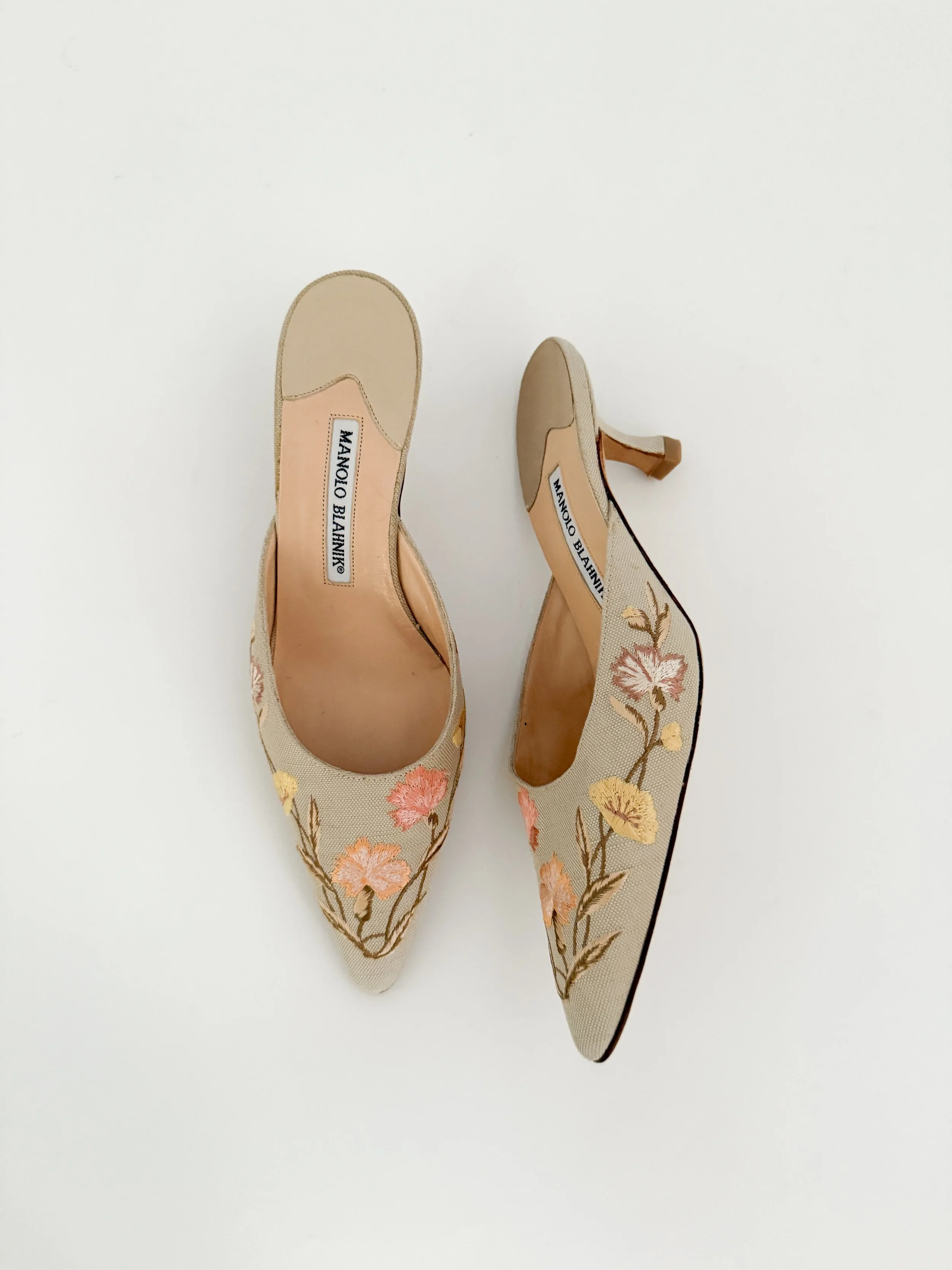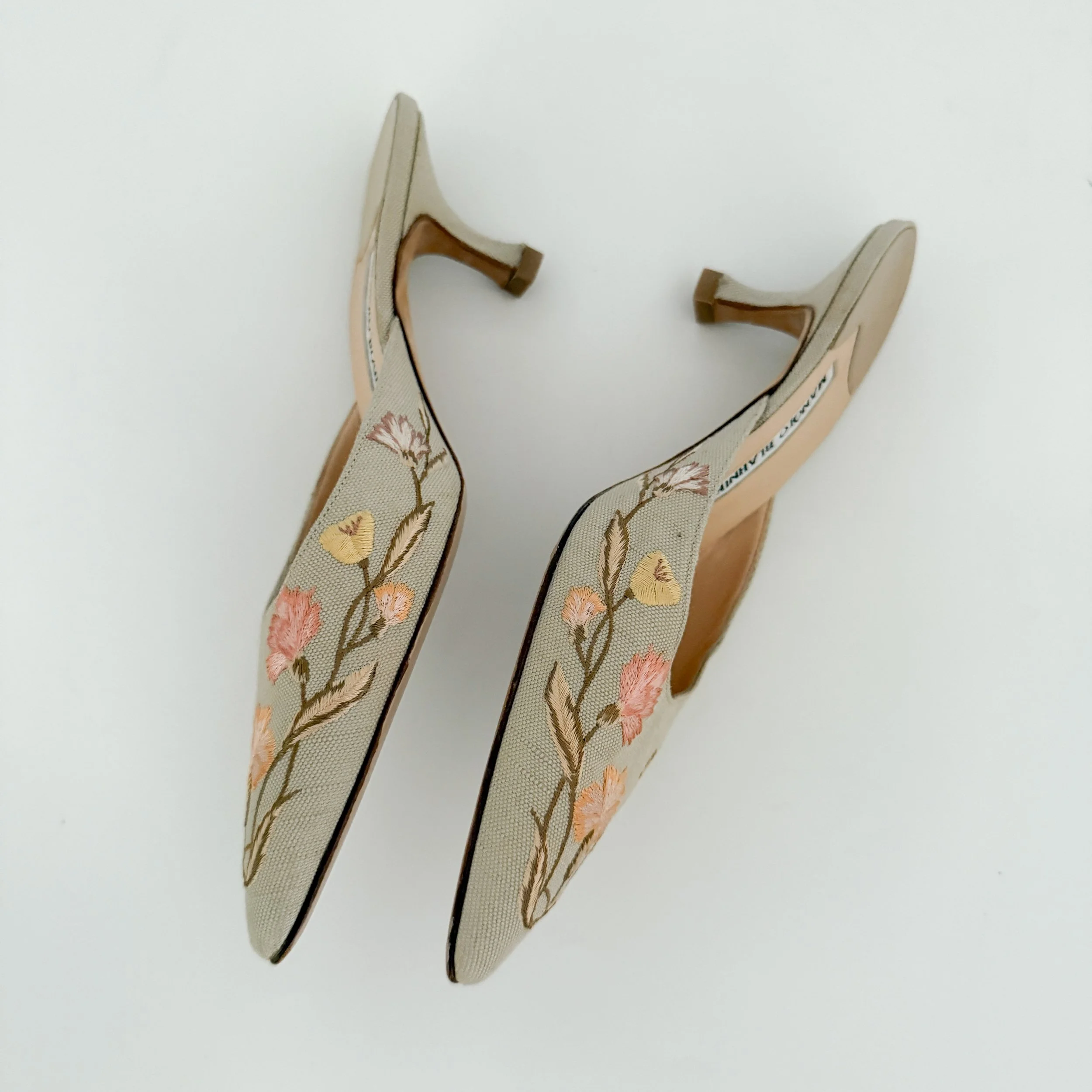 The most chic mule heels from iconic luxury shoe designer Manolo Blahnik. Can be styled both casually and formally in endless ways. Perfect for year ‘round wear. A pair of heels to treasure forever.