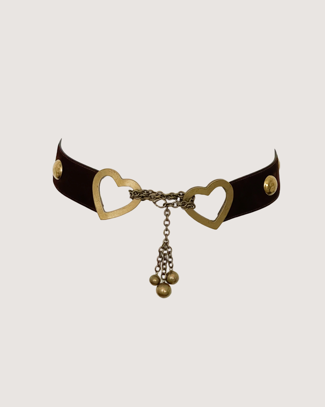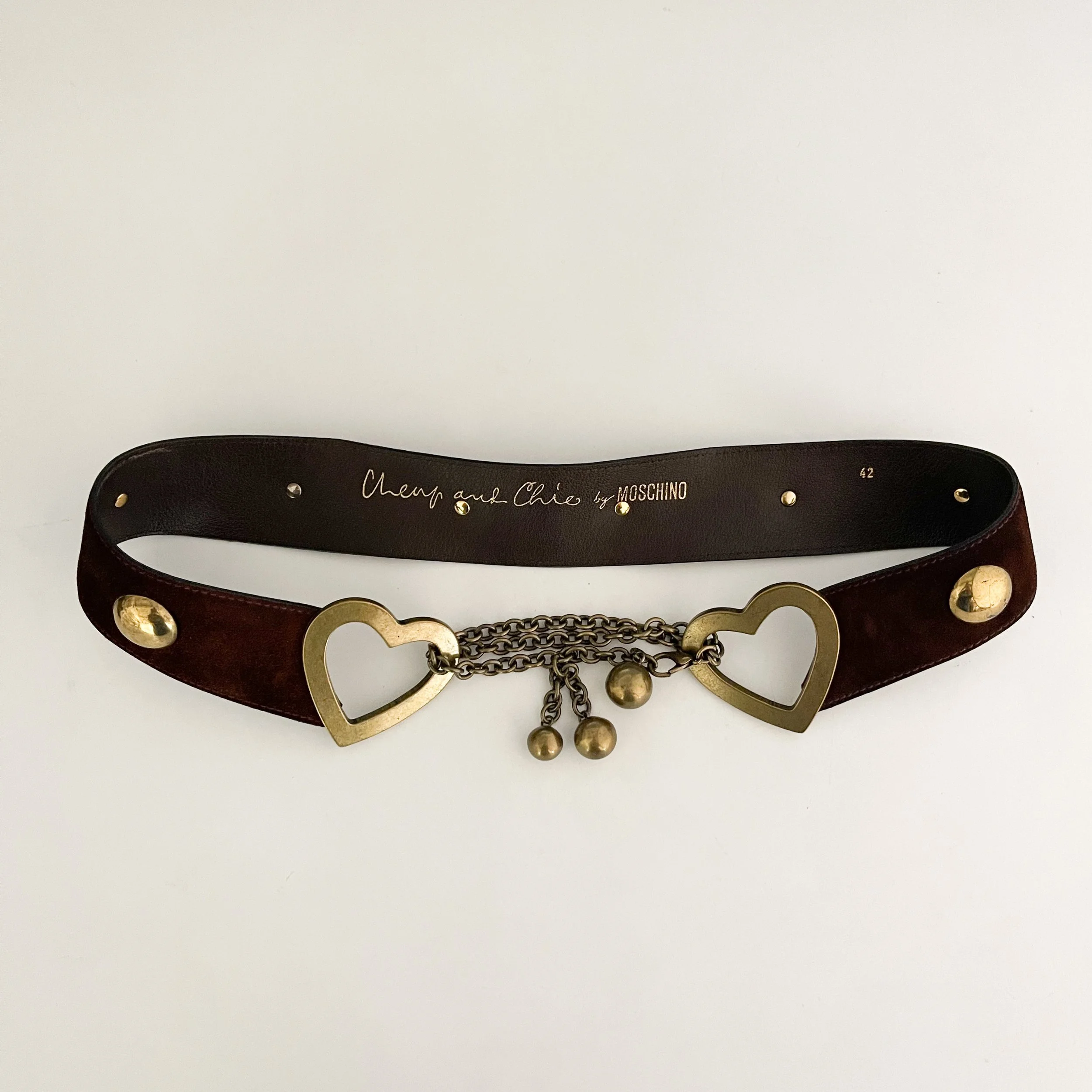 The most incredible—and absolutely darling—brown and gold studded heart belt from iconic fashion house Moschino. Features adjustable chain closure.