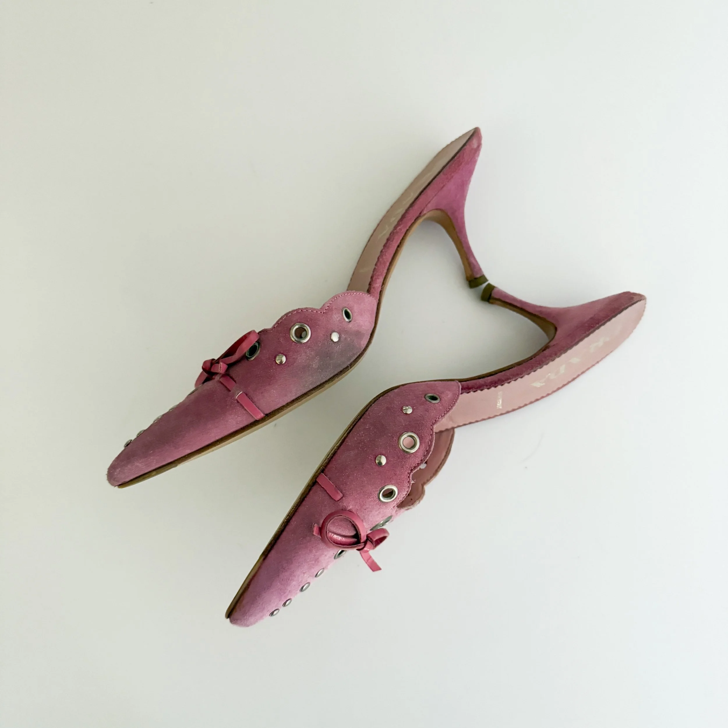 Prada Iconic Pink Eyelet Bow Mule Heels (IT 35.5)
