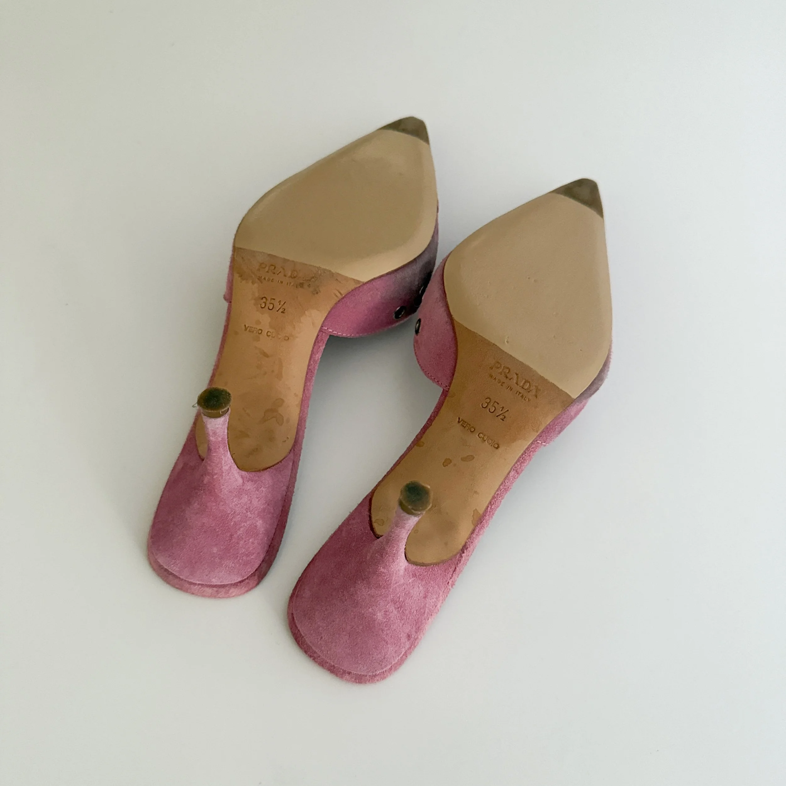 The most darling pink suede eyelet bow mule heels from iconic fashion house Prada. An in-demand and iconic Prada heel style.