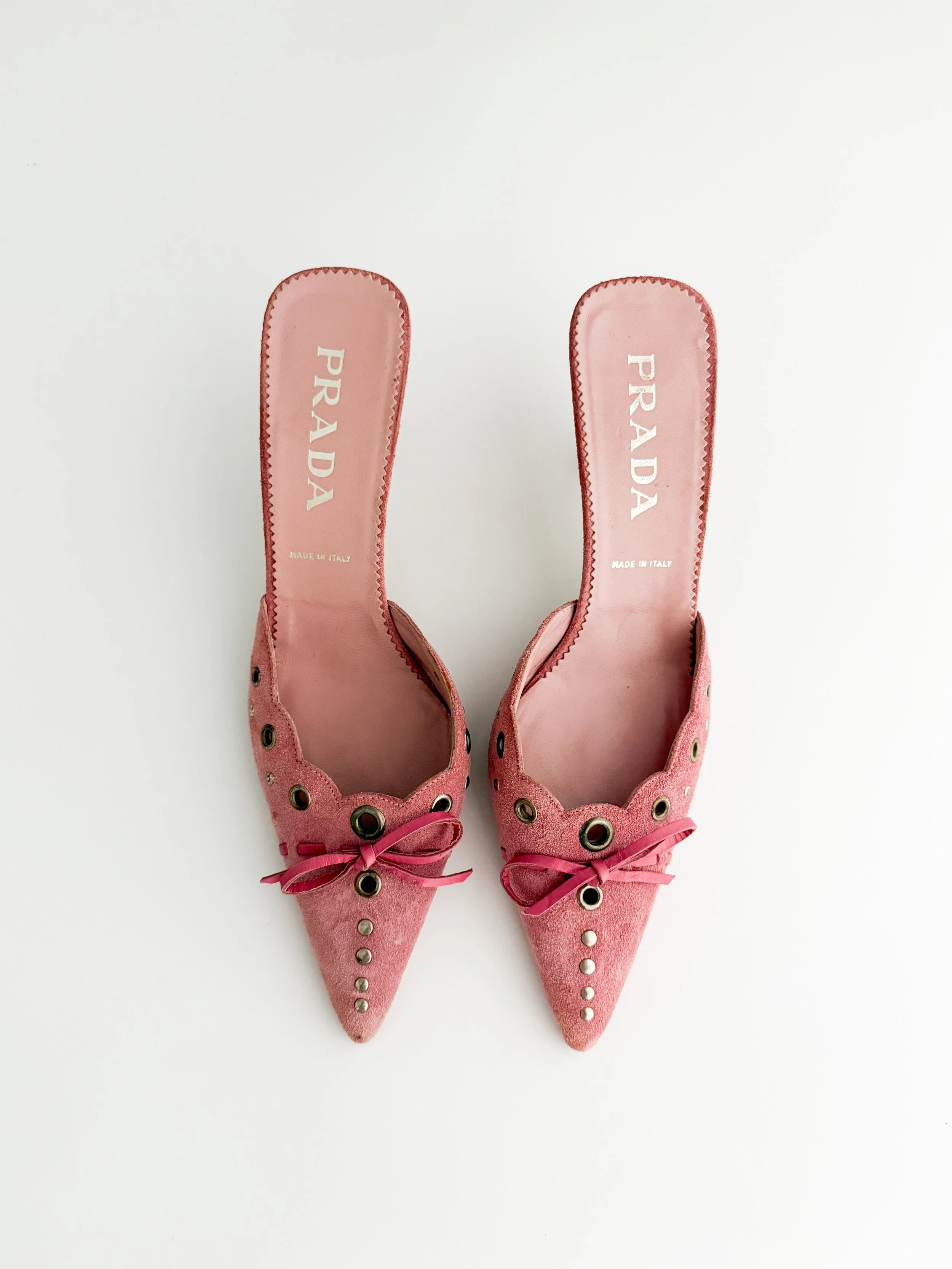Prada Iconic Pink Eyelet Bow Mule Heels (US 7.5 / IT 37.5)