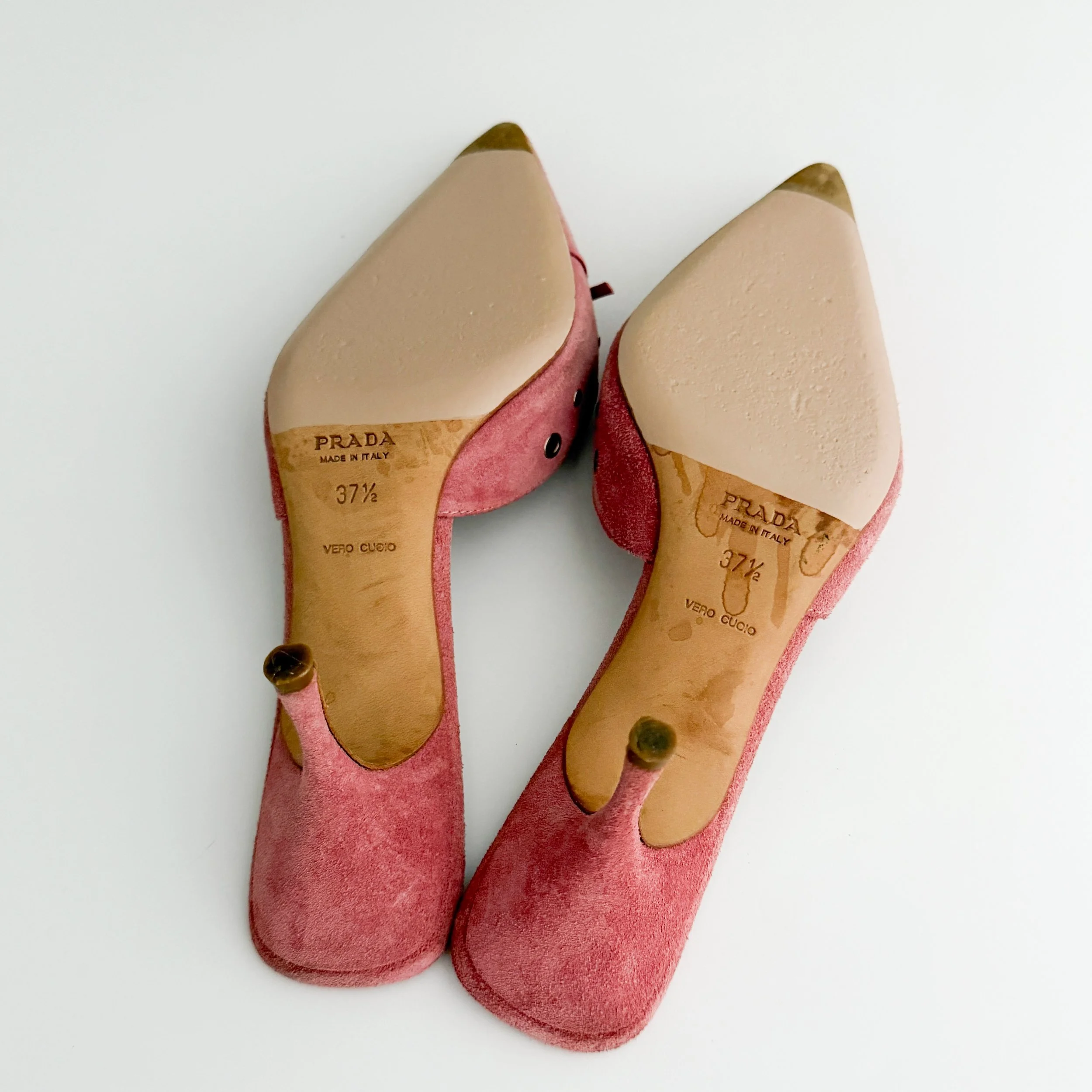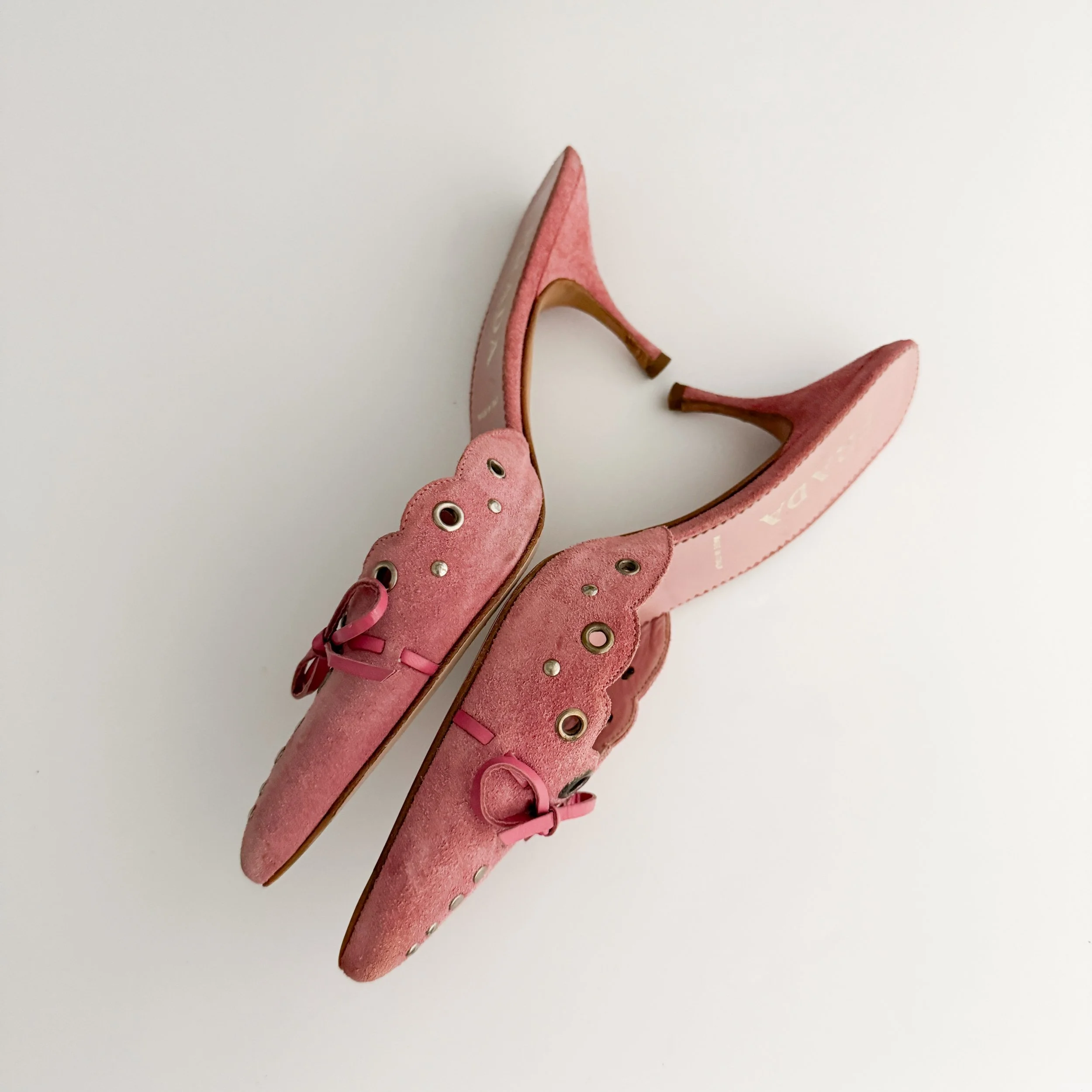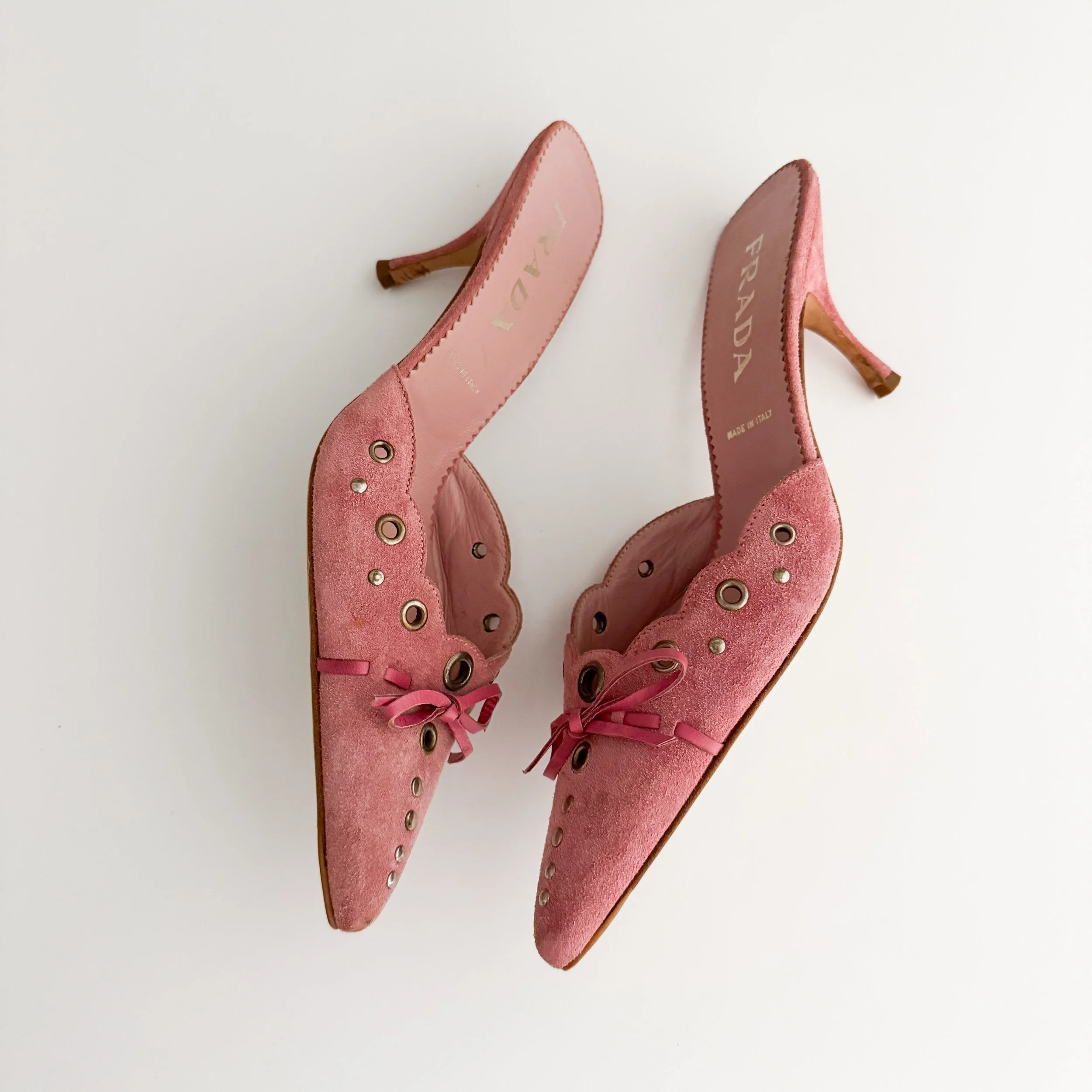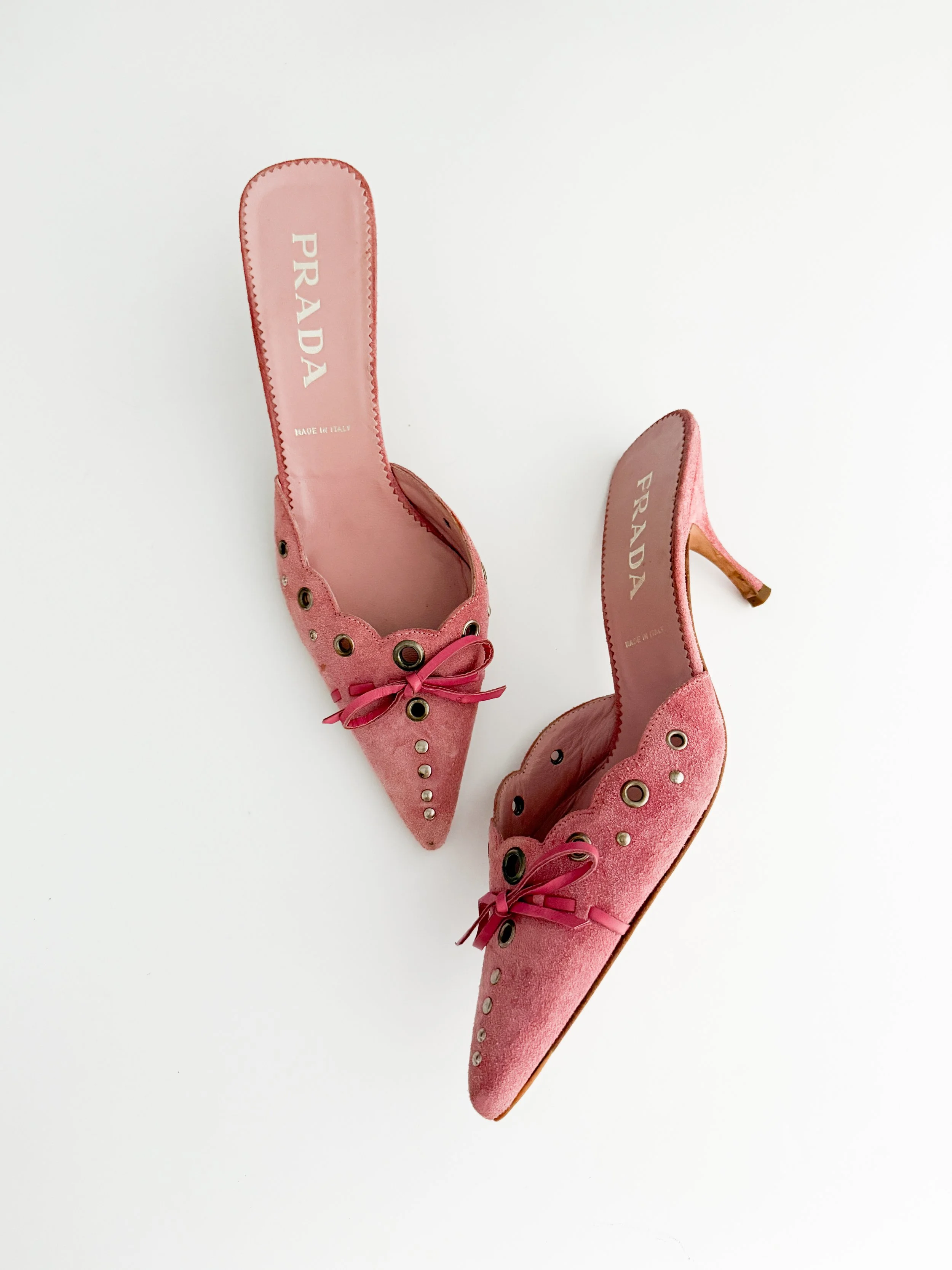 The most darling pink suede eyelet bow mule heels from iconic fashion house Prada. An in-demand and iconic Prada heel style.