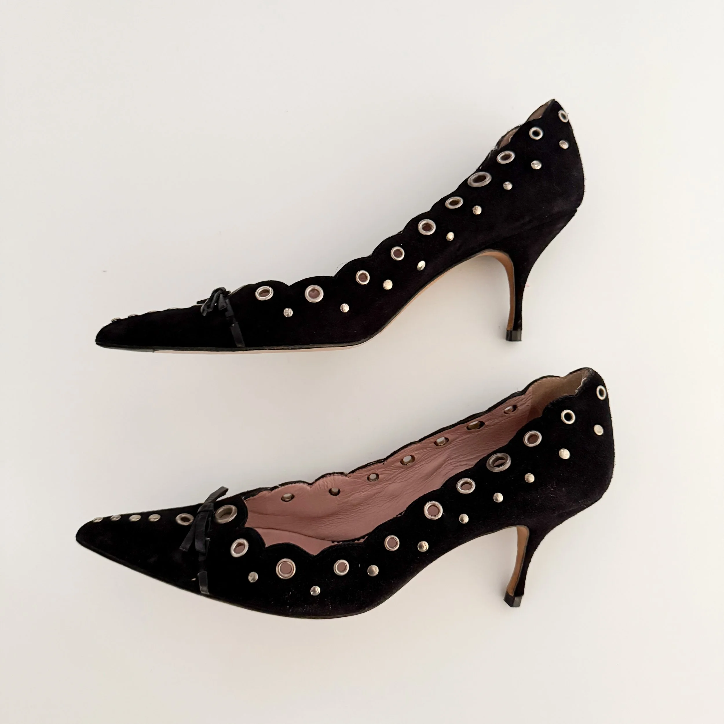 The most darling black suede eyelet bow heels from iconic fashion house Prada. An in-demand and iconic Prada heel style.