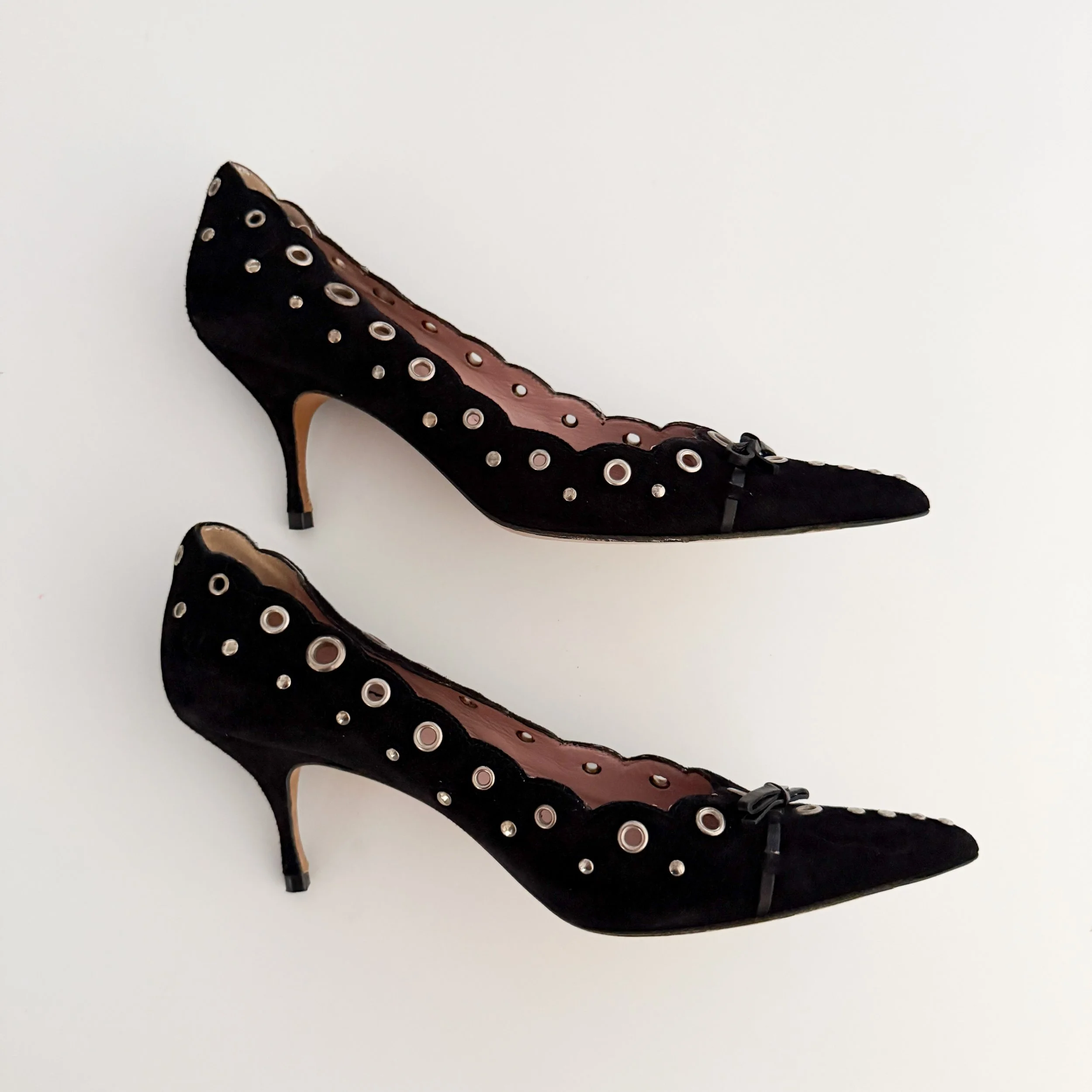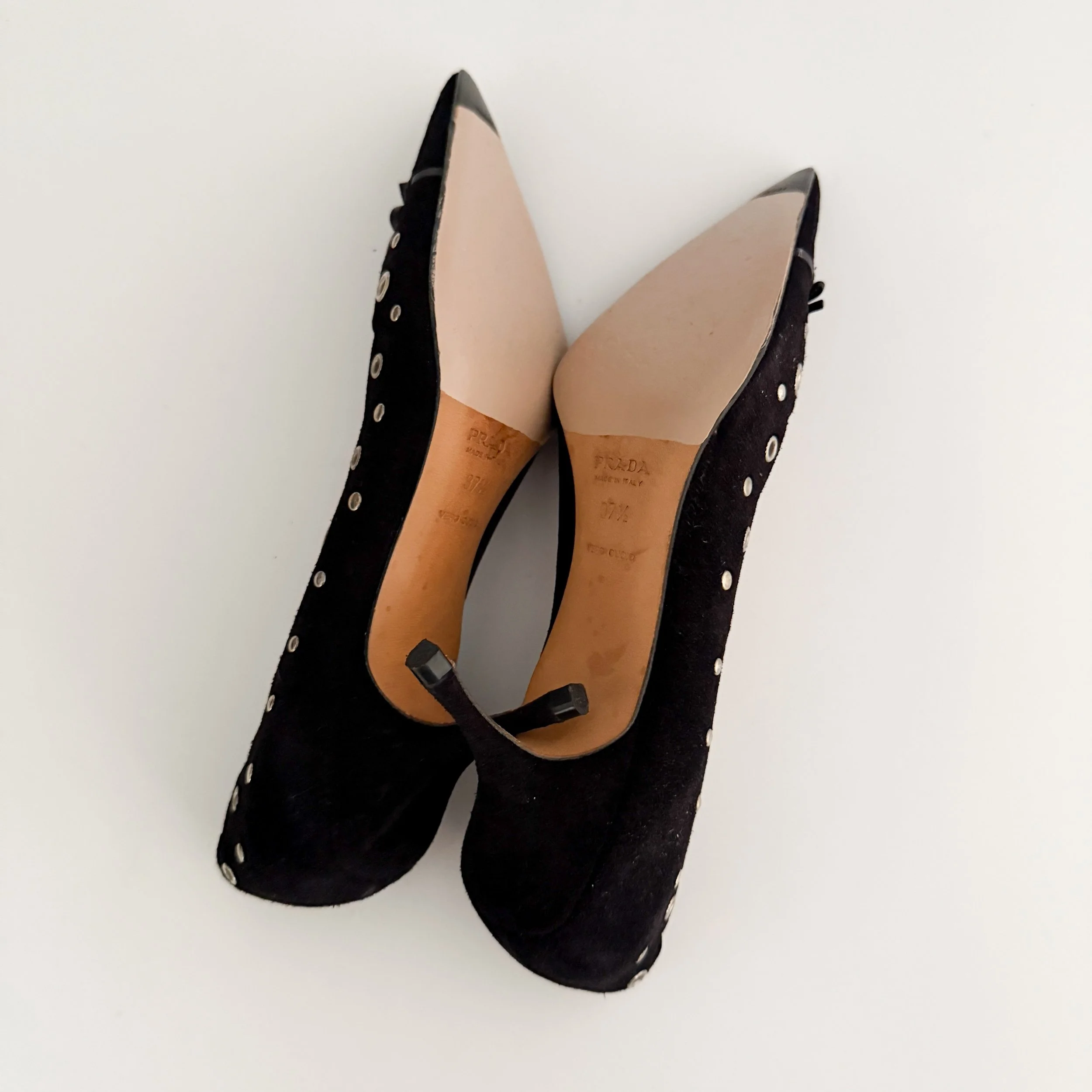 Prada Iconic Black Eyelet Suede Bow Heels (US 8 / IT 37.5)