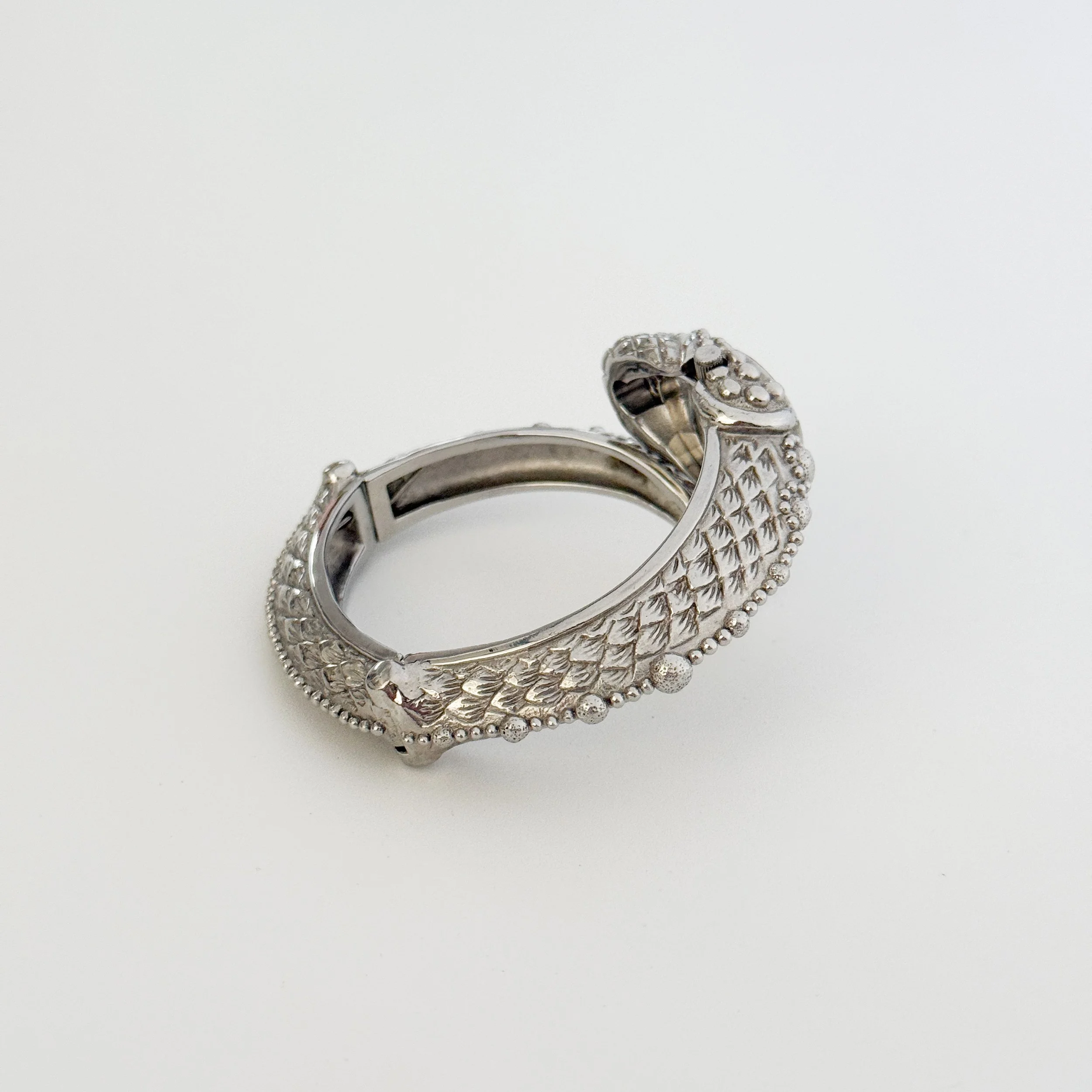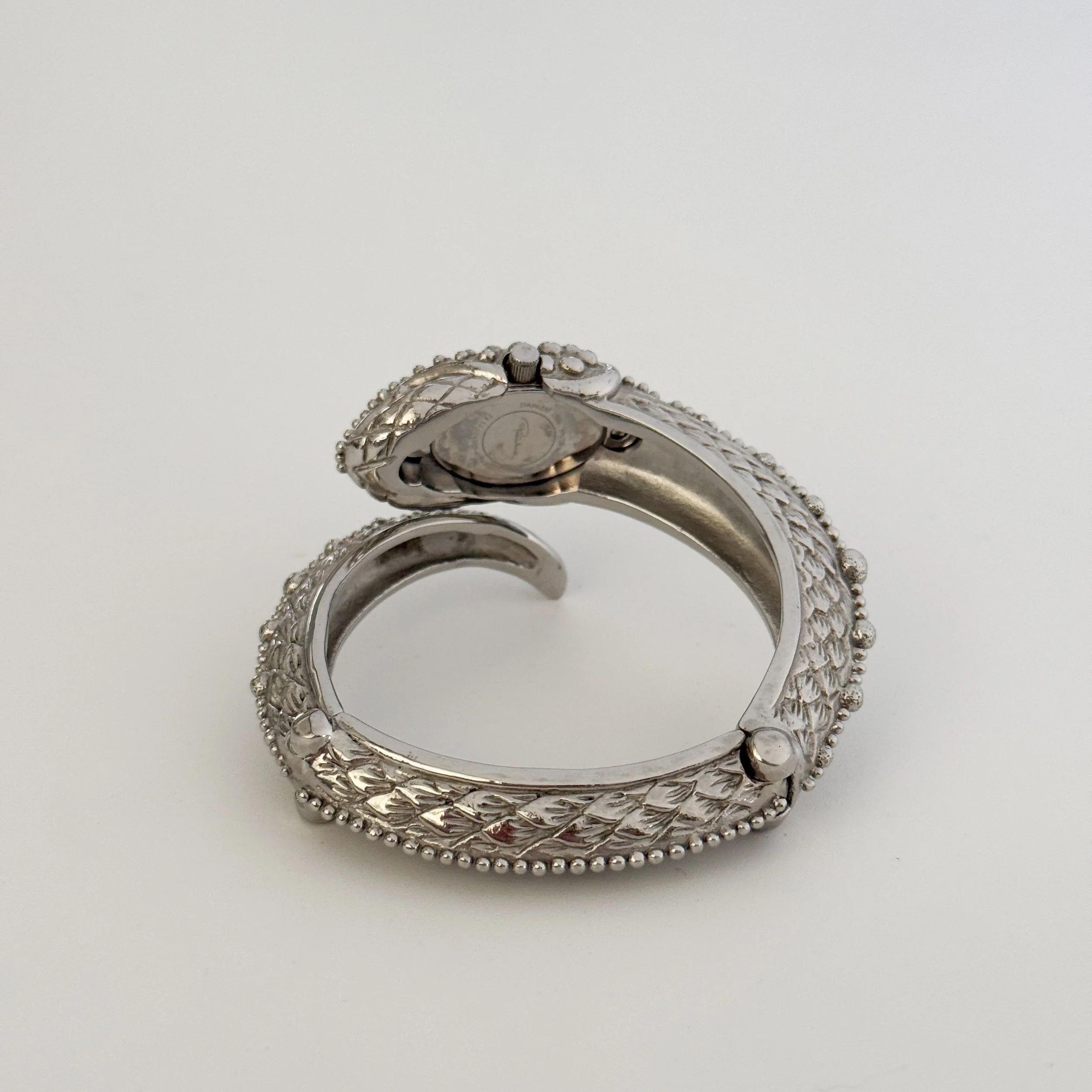 Absolutely exquisite vintage Roberto Cavalli figural snake watch cuff. The details on this piece are absolutely incredible, all the way down to the stylized watch hands, which resemble a snake as well. This statement accessory is meant to be shown off and treasured forever. An heirloom. Perfect for the vintage designer collector. So rare and luxurious.