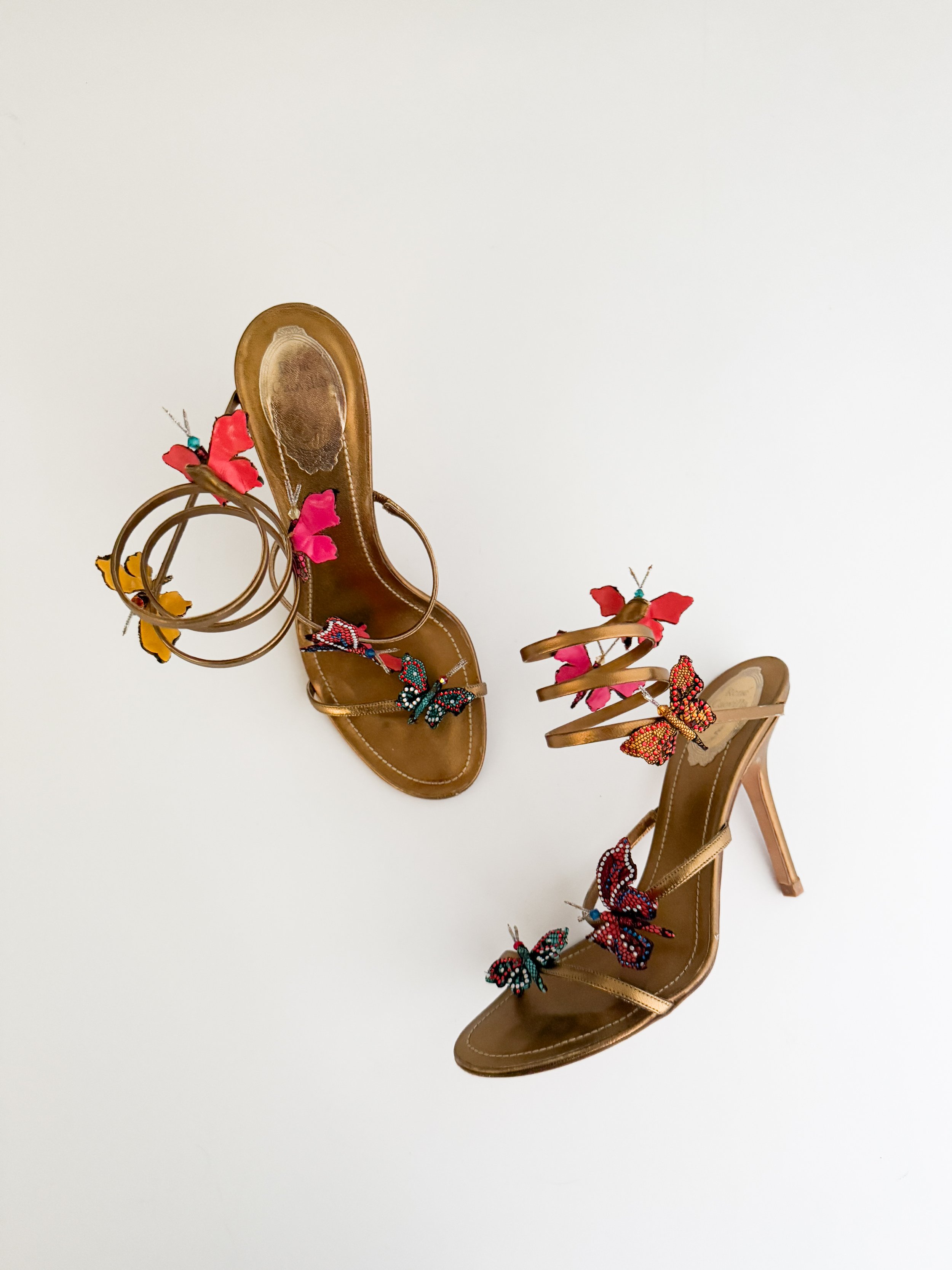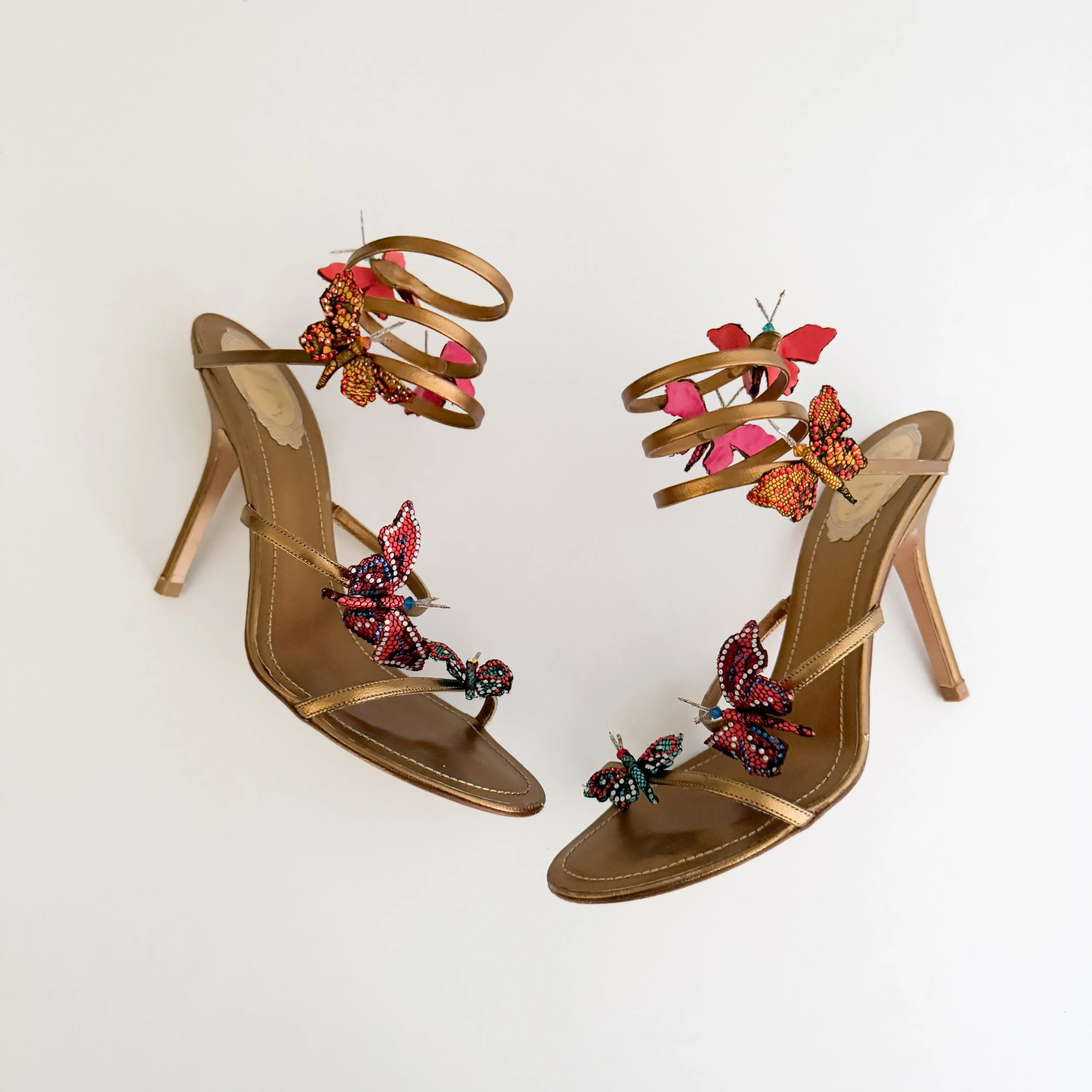 The most incredible butterfly wrap heels from luxury shoe designer René Caovilla. These shoes are a timeless statement accessory that can be styled in endless ways. Truly remarkable, a pair of heels to treasure forever. Perfect for the designer collector. Originally retailed for thousands of dollars. Rare.