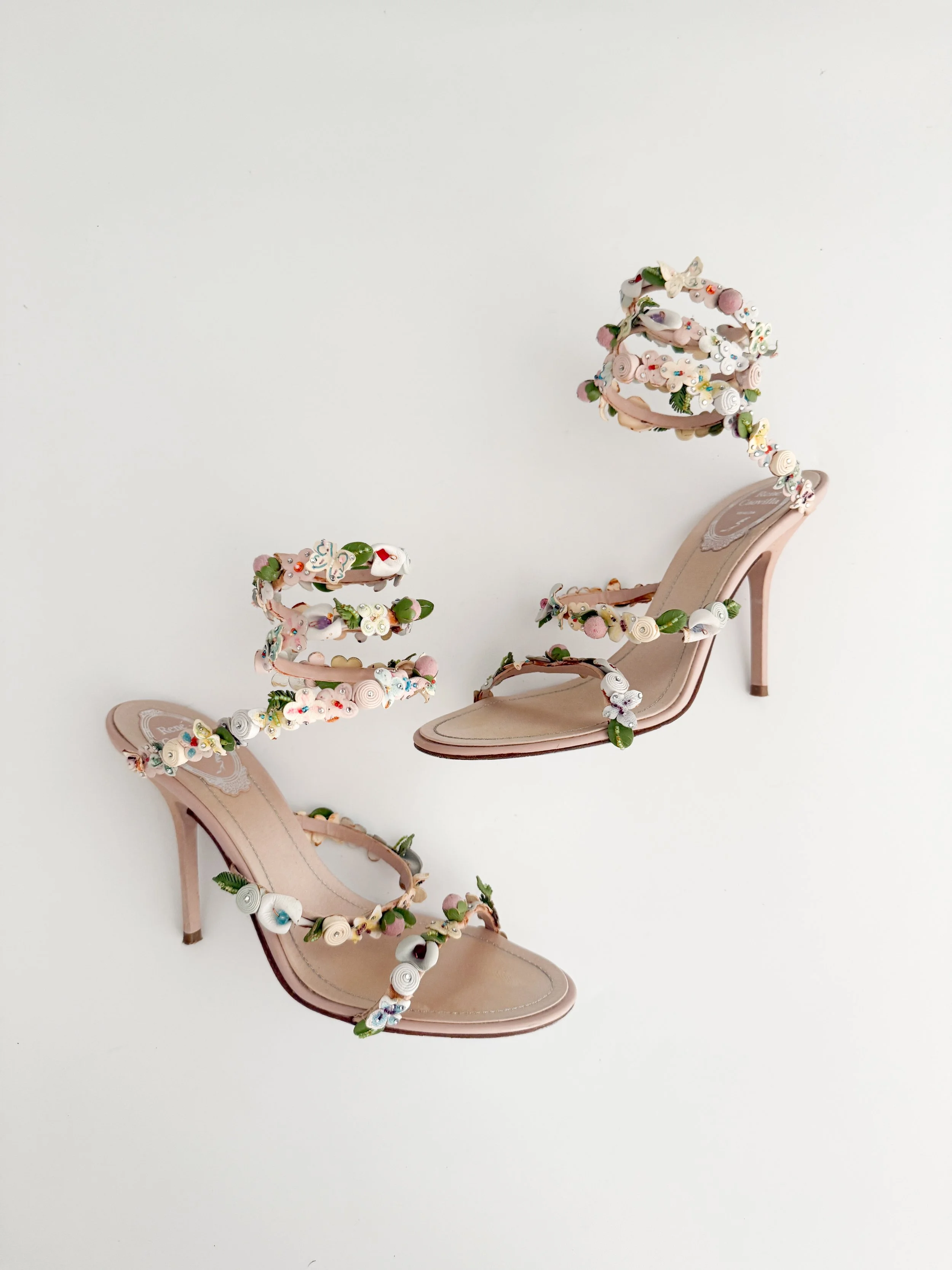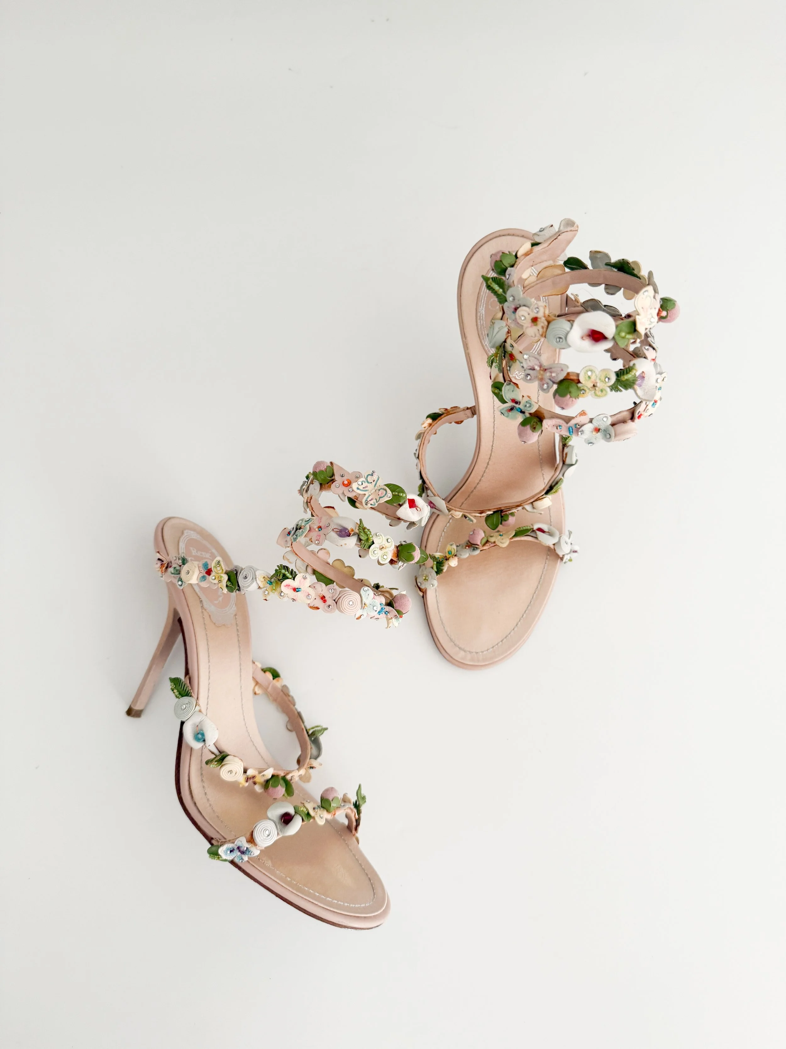 The most incredible ankle wrap sandal heels from luxury shoe designer René Caovilla. These shoes are a unique statement accessory that can be styled in endless ways during the spring and summer seasons. Perfect for a bride. A true statement piece.
