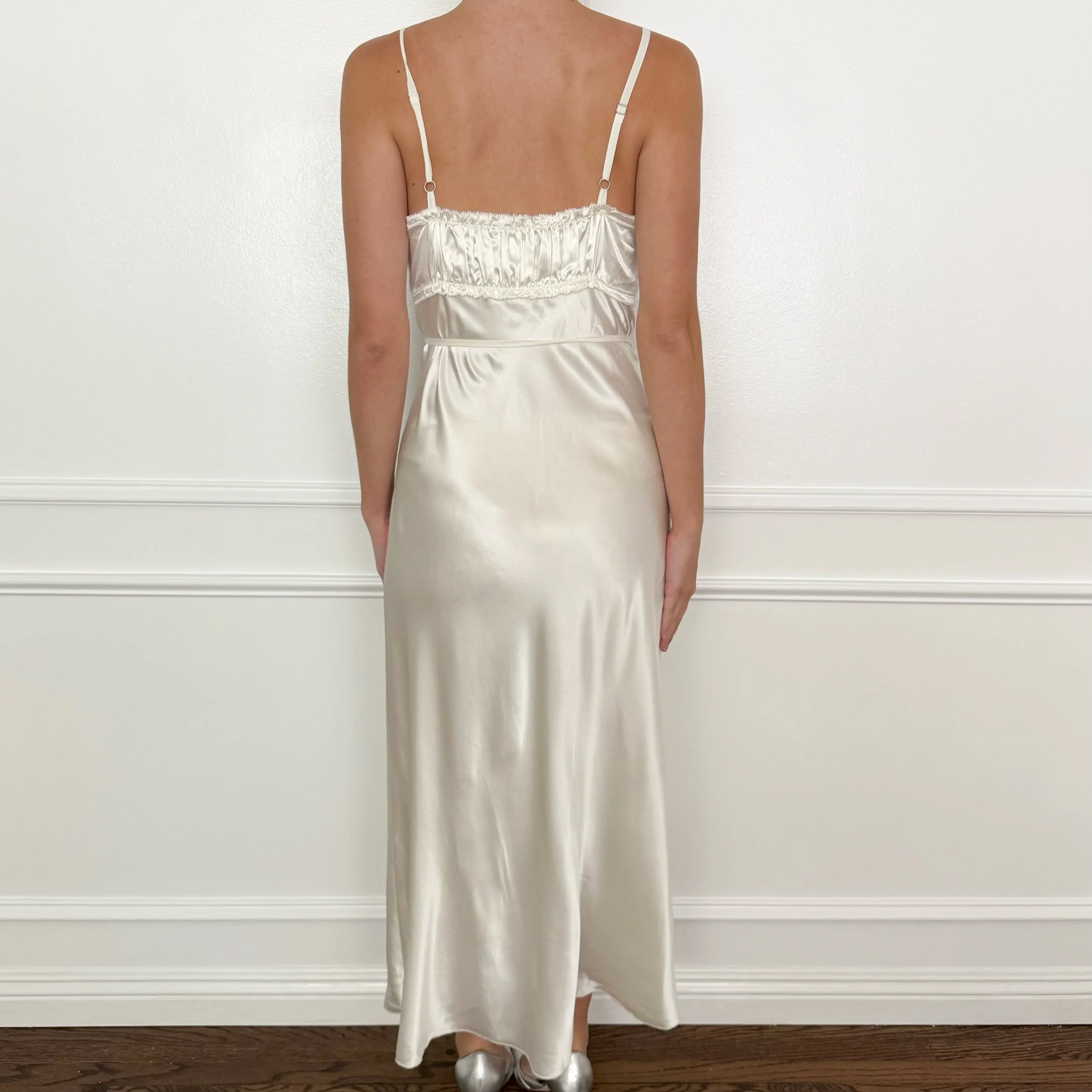 The loveliest ivory tied slip gown from iconic fashion designer Vera Wang. This angelic and absolutely romantic closet staple is meant to be shown off, and can be styled both casually and formally year ‘round.