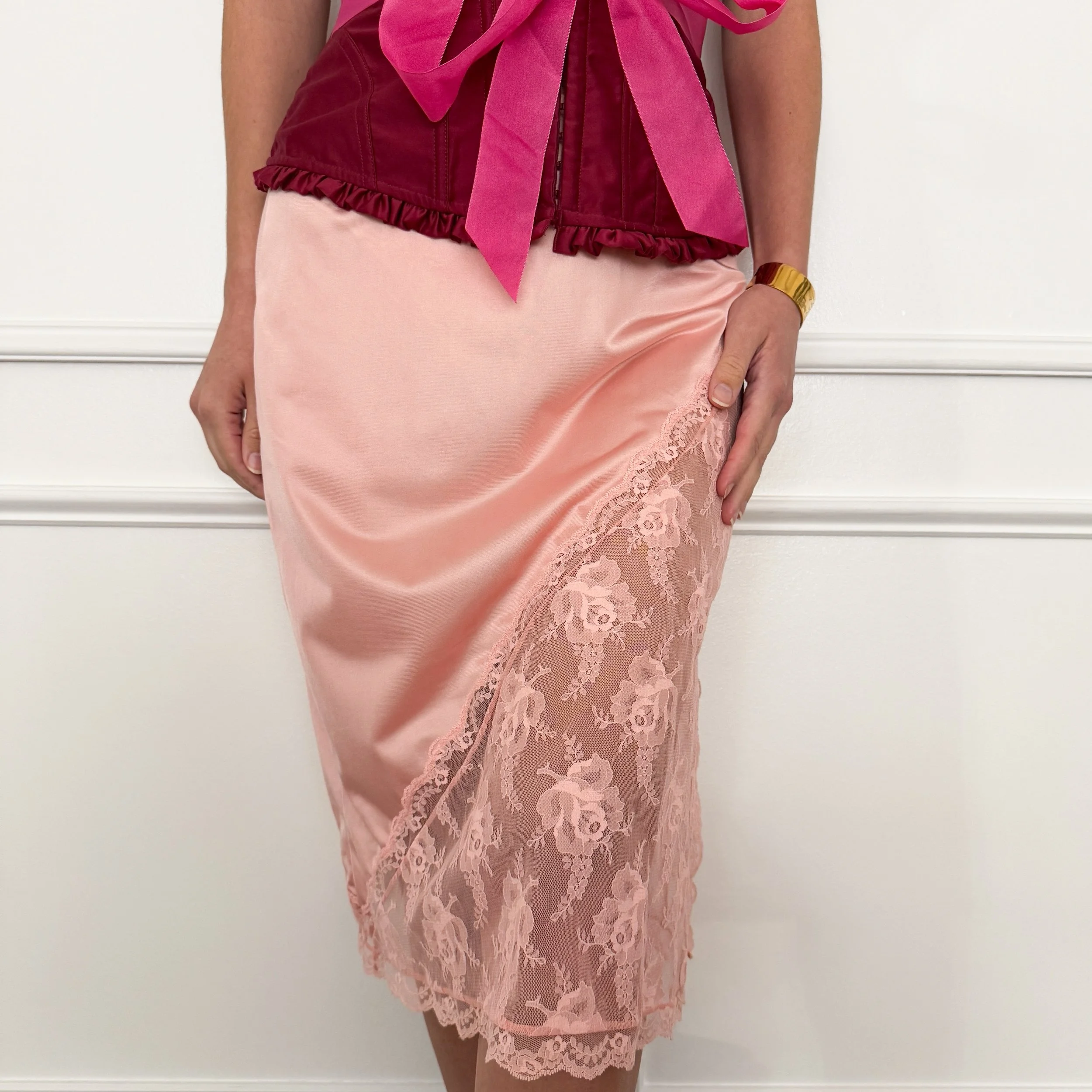The most darling and classic vintage pink floral lace trim skirt circa the 1970’s. This timeless closet staple is meant to be shown off, and looks stunning styled as loungewear and lingerie, as well as worn out and about. A designer timepiece to treasure forever.