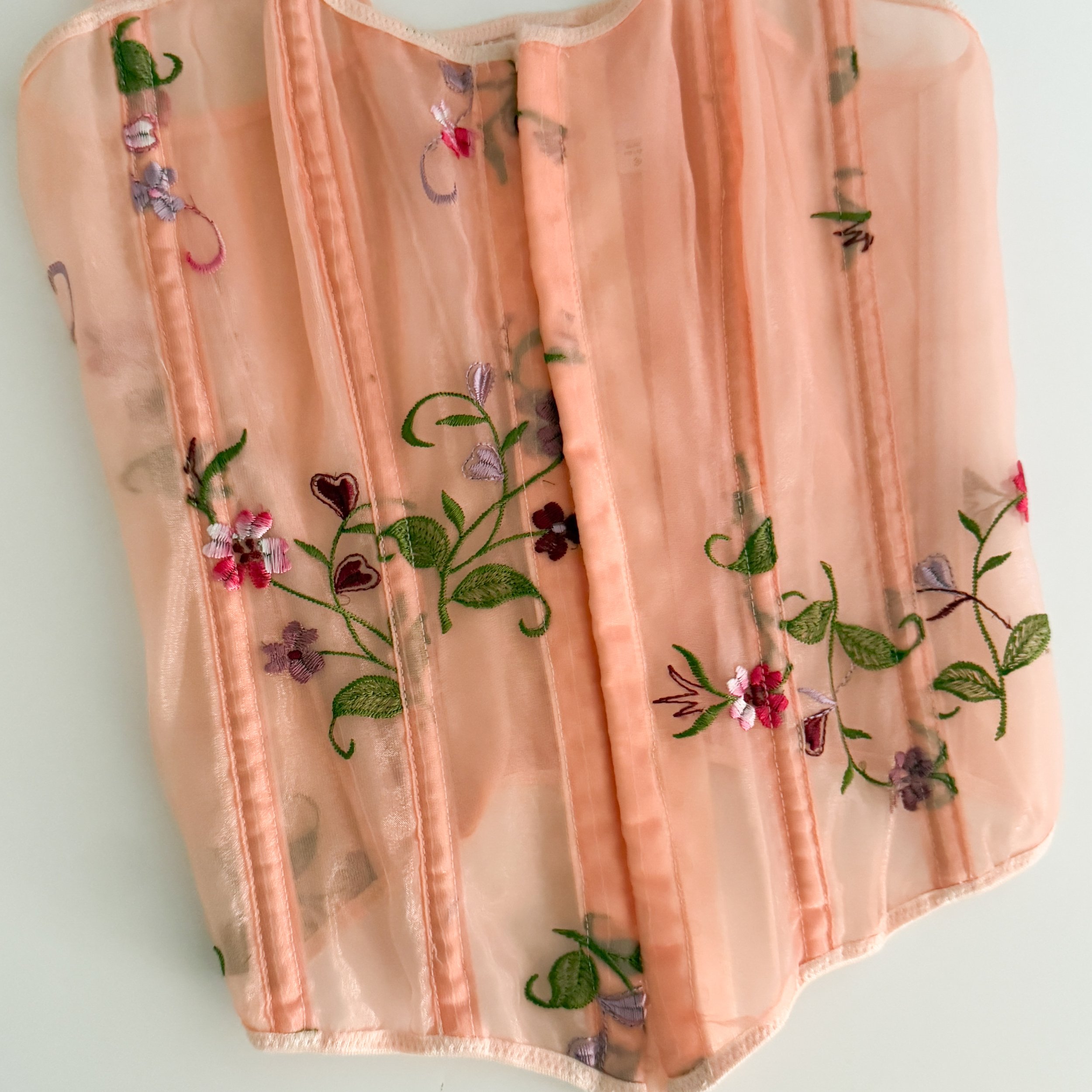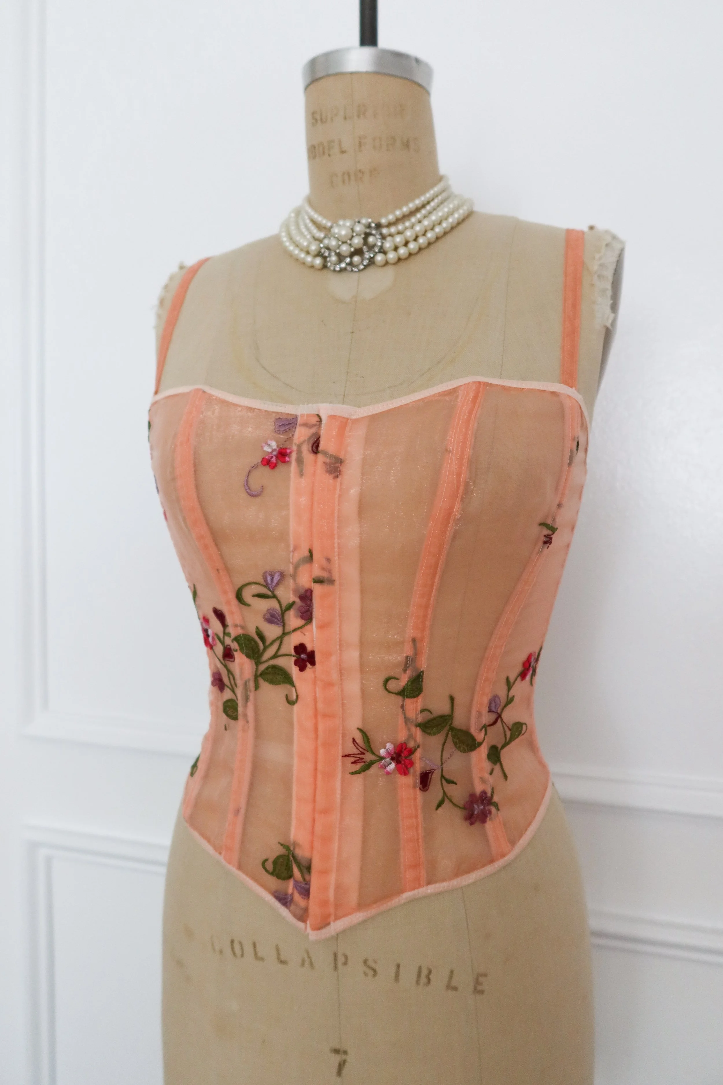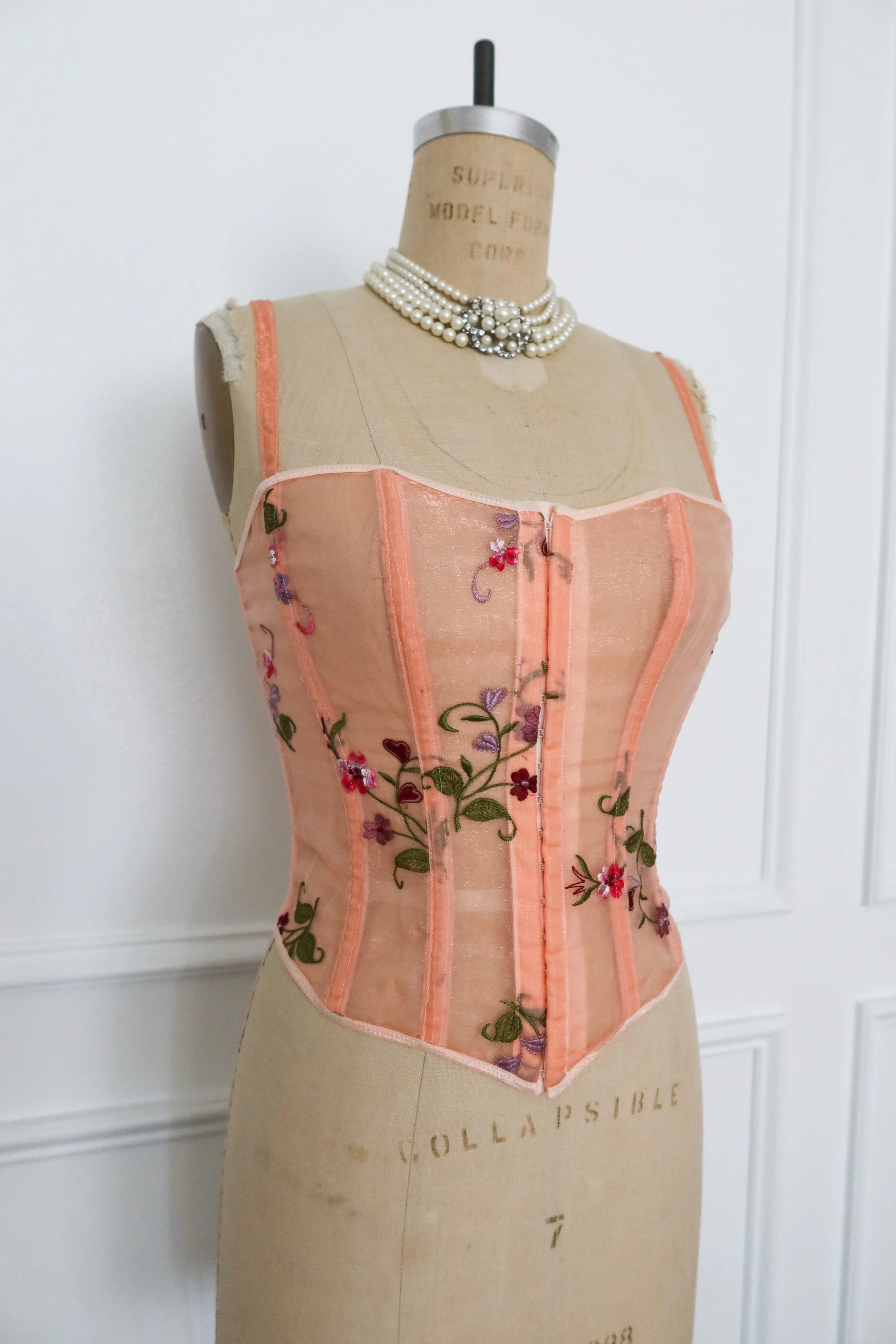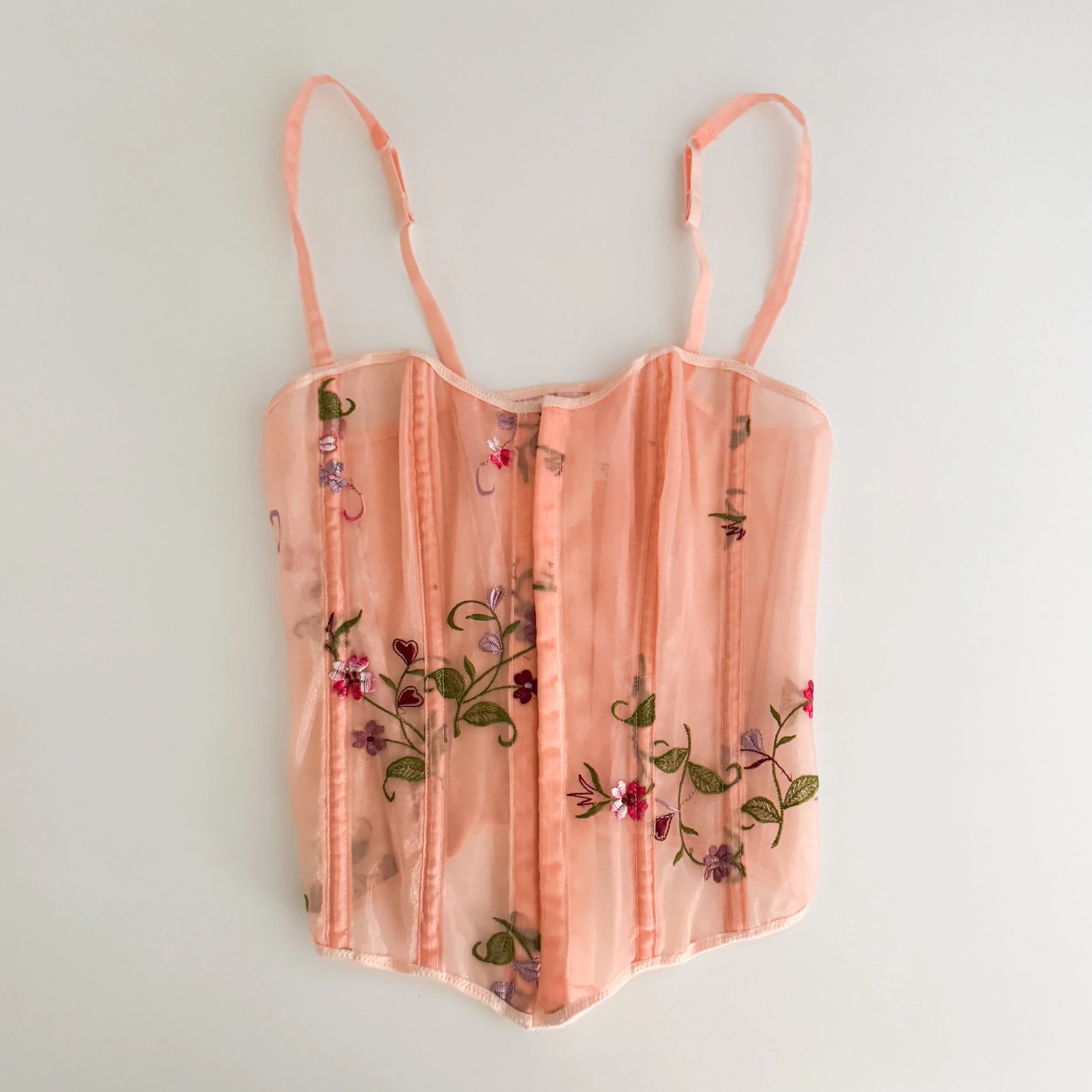 Vintage 2002 VS Peach Sheer Floral Embroidered Boned Bodice (Small)