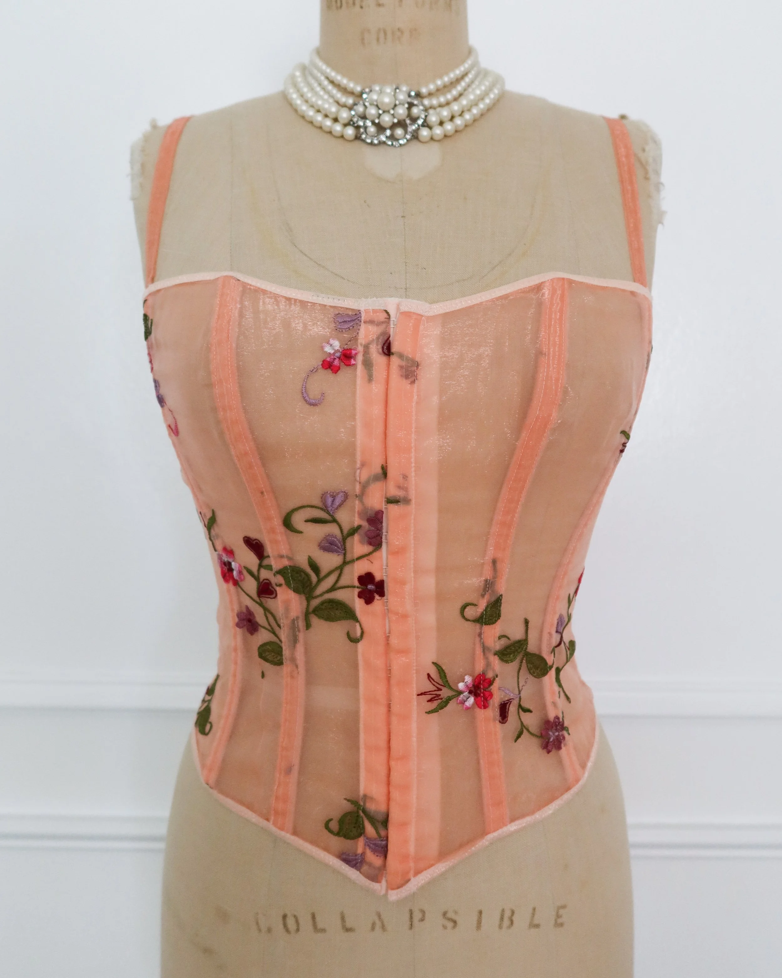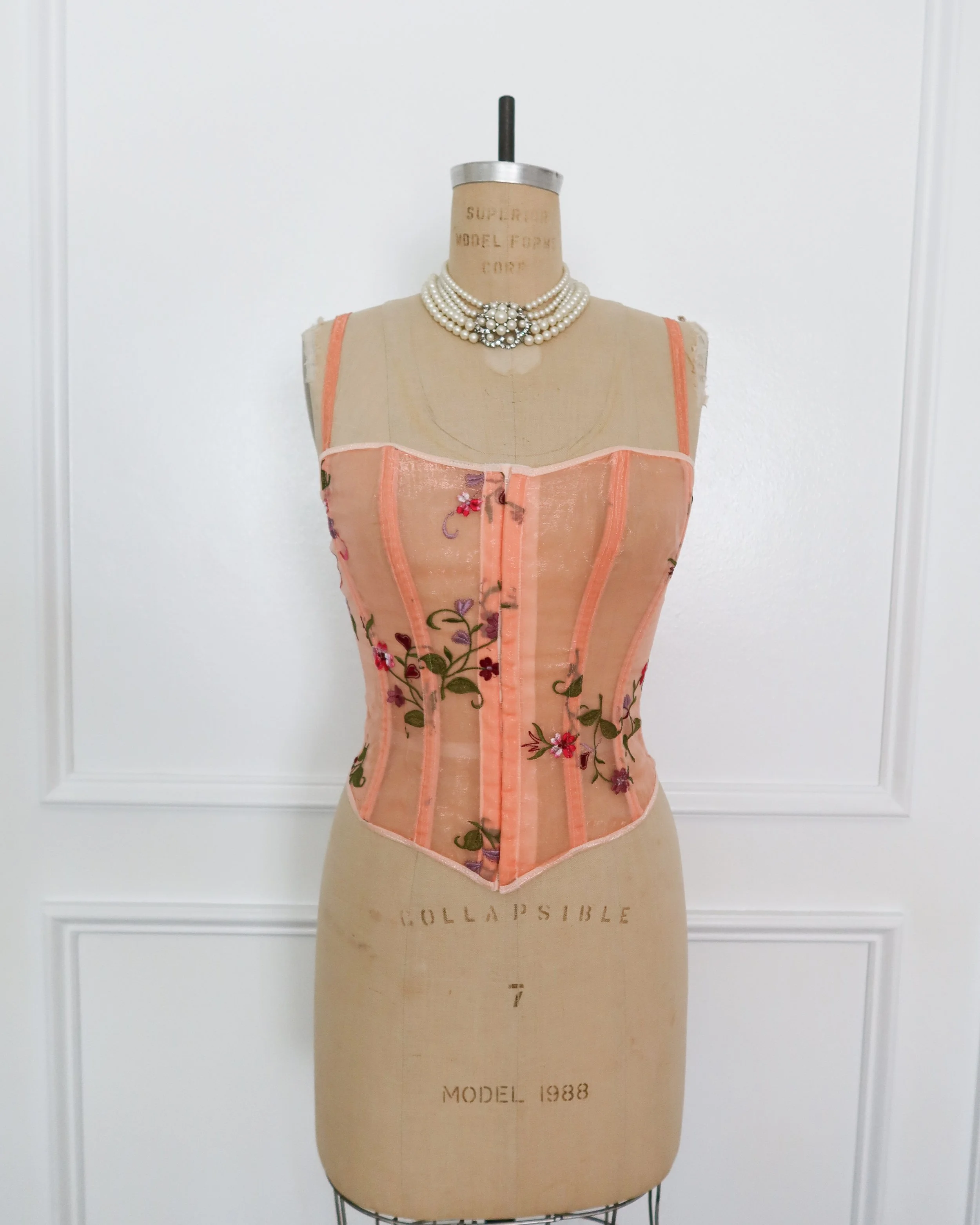 The loveliest vintage peach sheer floral embroidered boned bodice from Victoria’s Secret circa the year 2002. This closet staple can be styled in endless ways year ‘round; looks amazing both as loungewear and lingerie, as well as shown off out and about. Especially perfect for the spring and summer seasons.