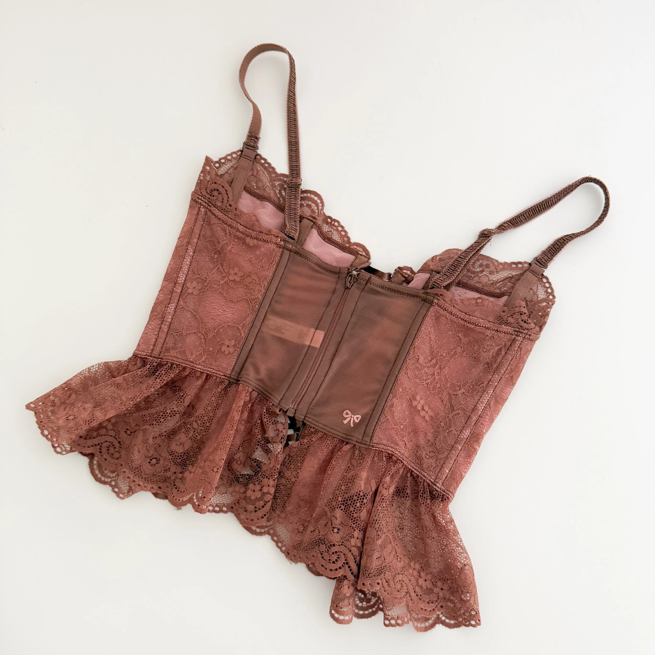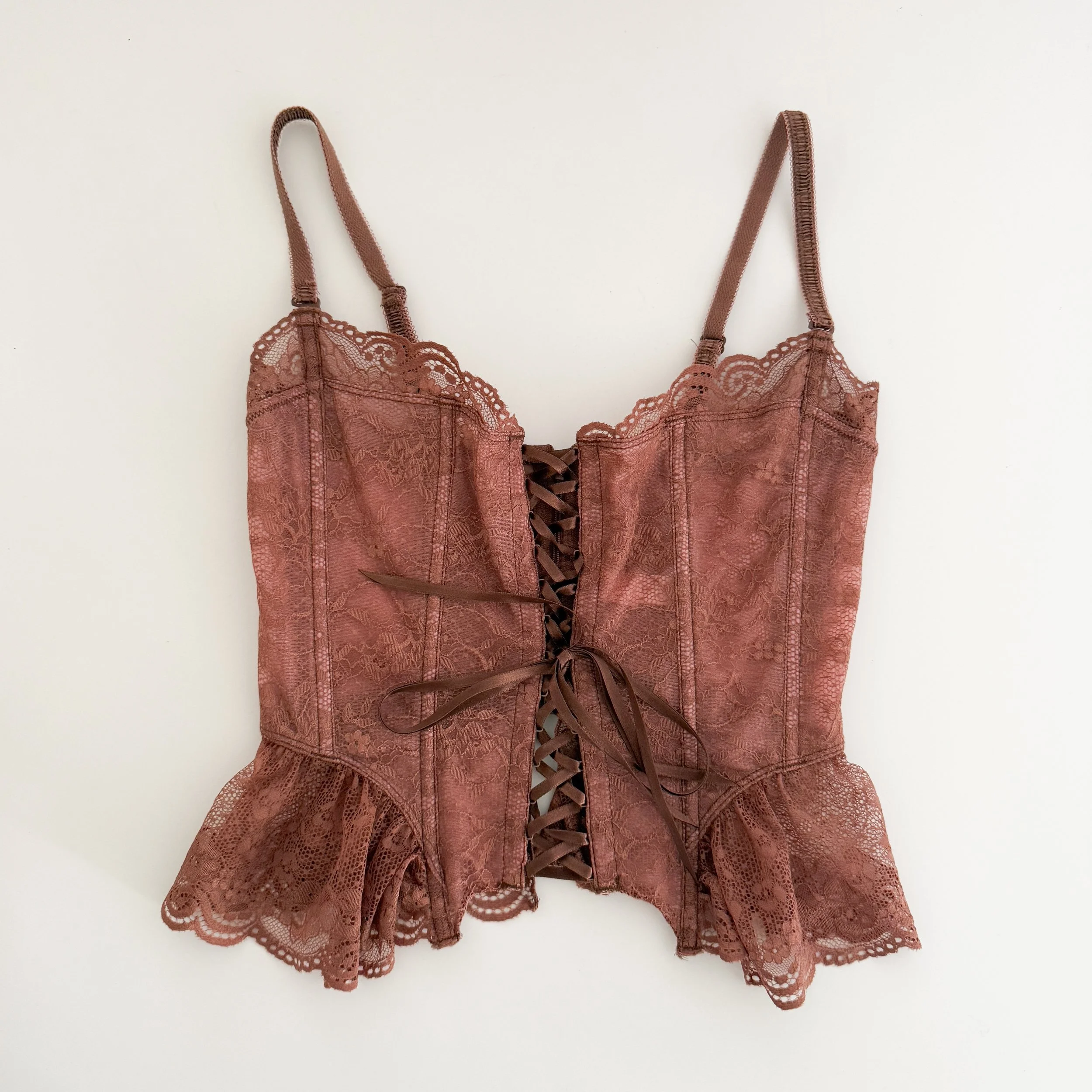 The loveliest vintage mauve floral lace lace-up corset bustier from Victoria’s Secret circa the year 2003. This darling statement bustier looks amazing as lingerie, and is meant to be shown off out and about. A romantic closet staple to treasure forever.