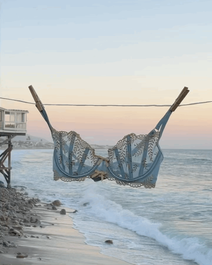 The most darling soft blue and gold sheer boned bra with delicate floral lace embroidered details. As seen on the iconic supermodel Gisele Bündchen for the Victoria’s Secret 2003 fashion show. When a bra is this stunning, it should be shown off — style this garment both as loungewear and lingerie, and out on the town. A rare find.