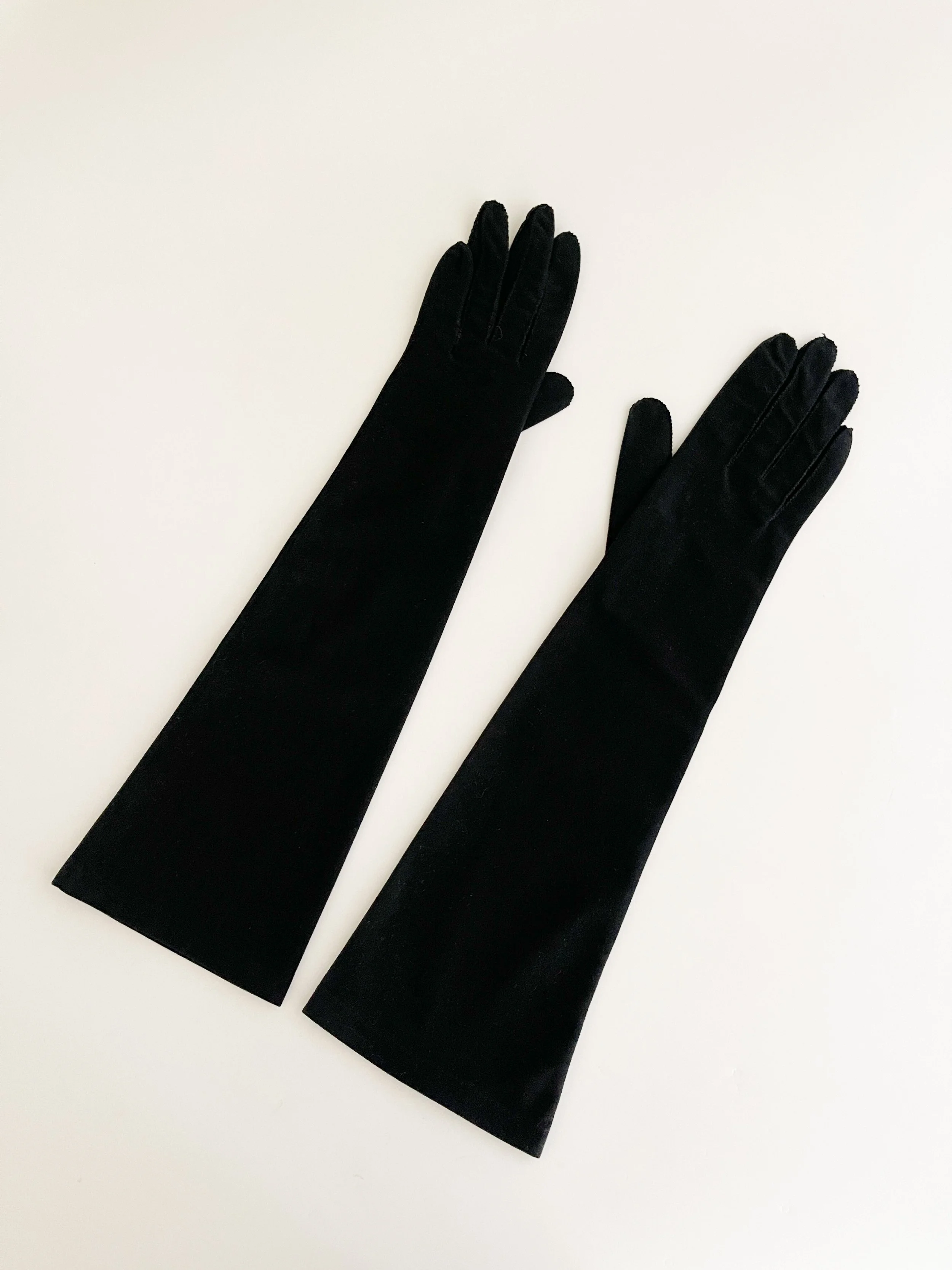 The most classic vintage black evening gloves. Can be styled for formal events year ‘round. Perfect for the vintage collector.