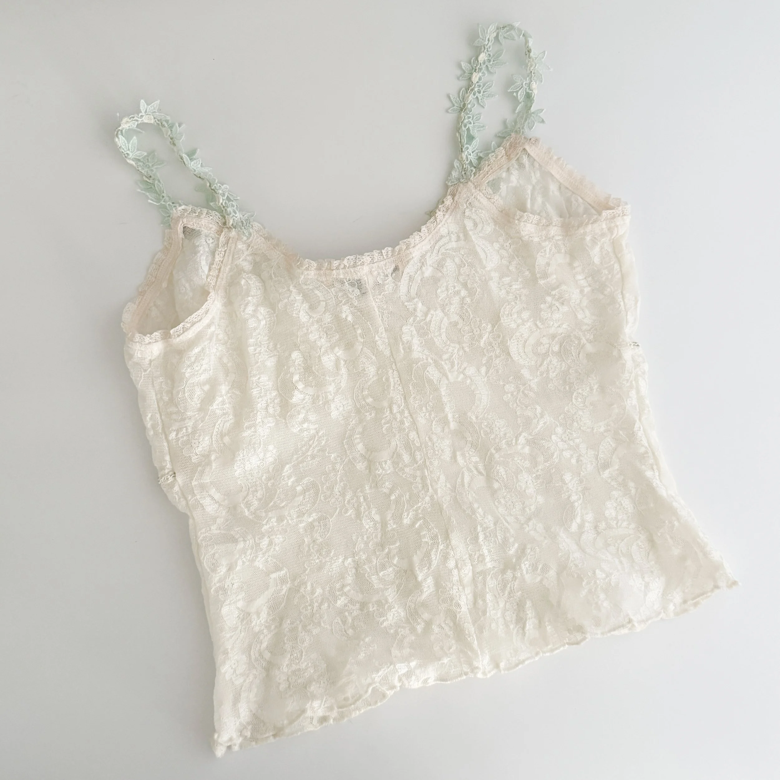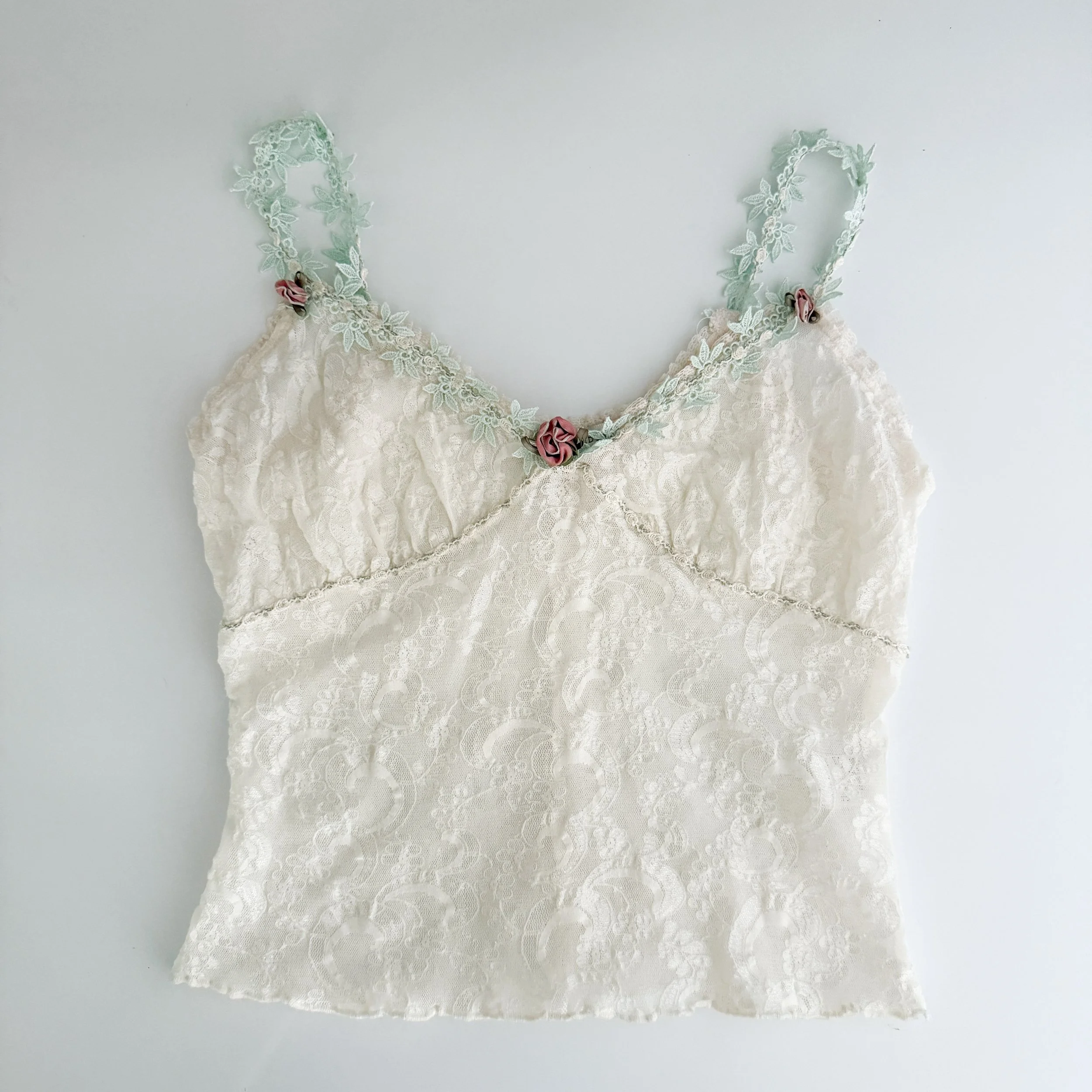 Absolutely darling and romantic vintage late 1990’s two-piece ensemble from designer Claire Pettibone, featuring an ivory sheer floral lace camisole and matching boy short. This pair of garments look stunning as loungewear, as well as shown off and worn out and about. An extremely comfortable and simply lovely set of closet staples to treasure forever.