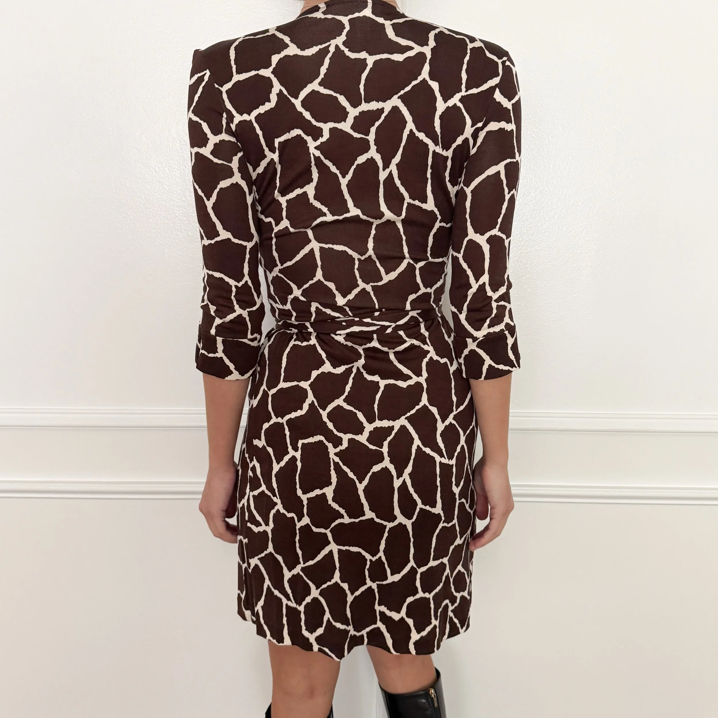 From designer Diane Von Furstenberg, this is a chic vintage giraffe-patterned tied dress. Made of 100% silk—so luxurious. This versatile animal print closet staple can be styled both casually and formally year 'round, and is perfect for the fall season.