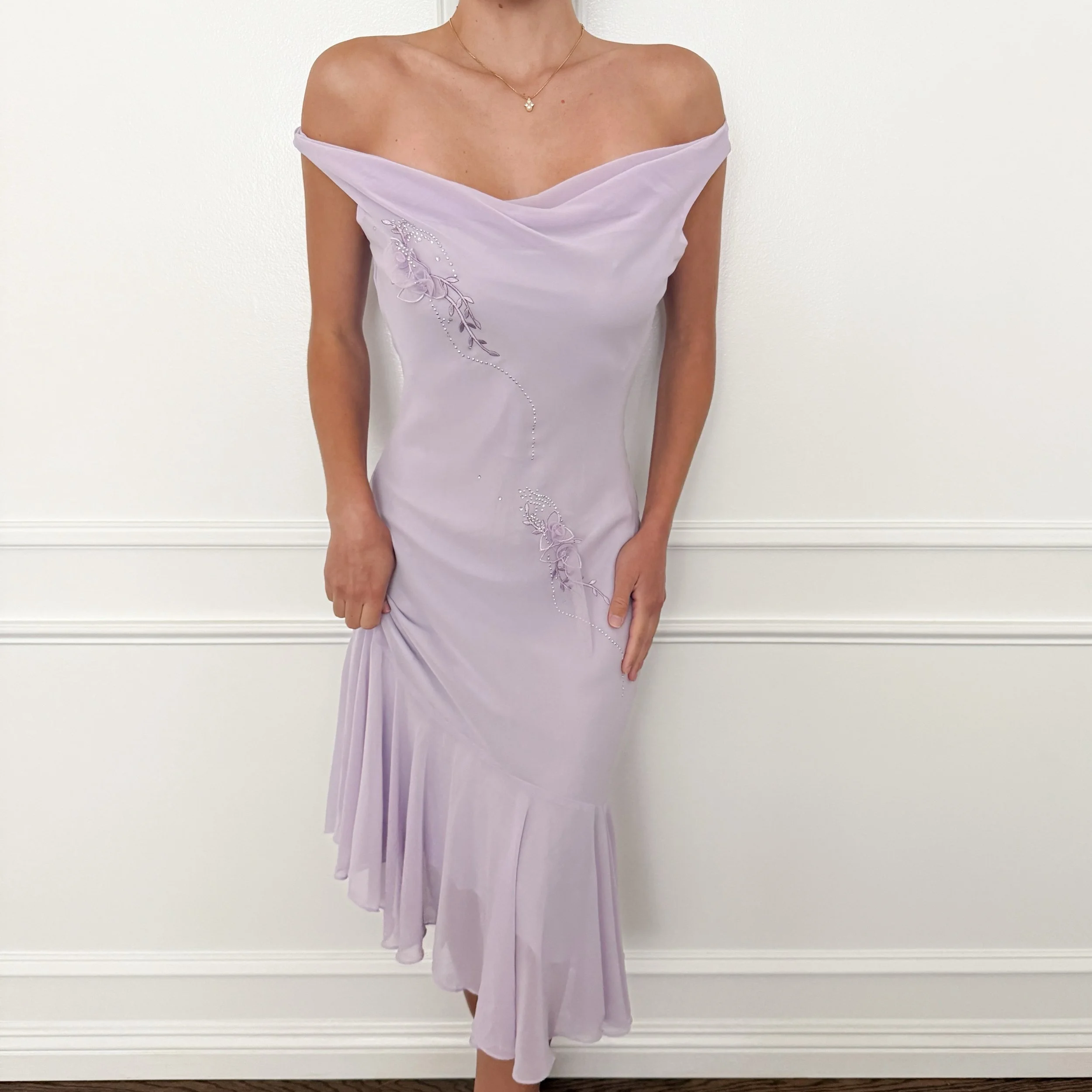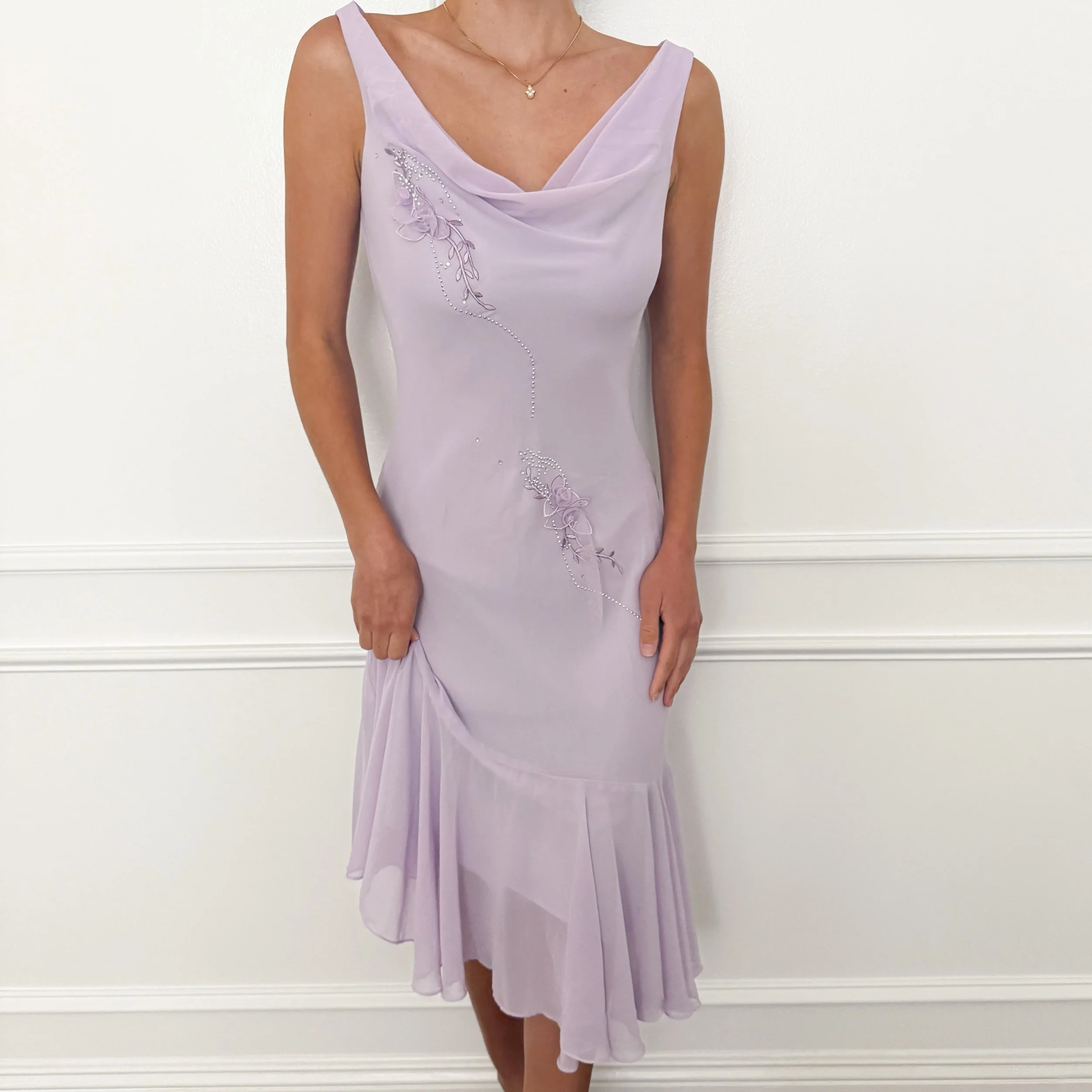 The loveliest vintage lilac dress with floral details and rhinestone appliqué accents. This closet staple can be styled both casually and formally year ‘round.