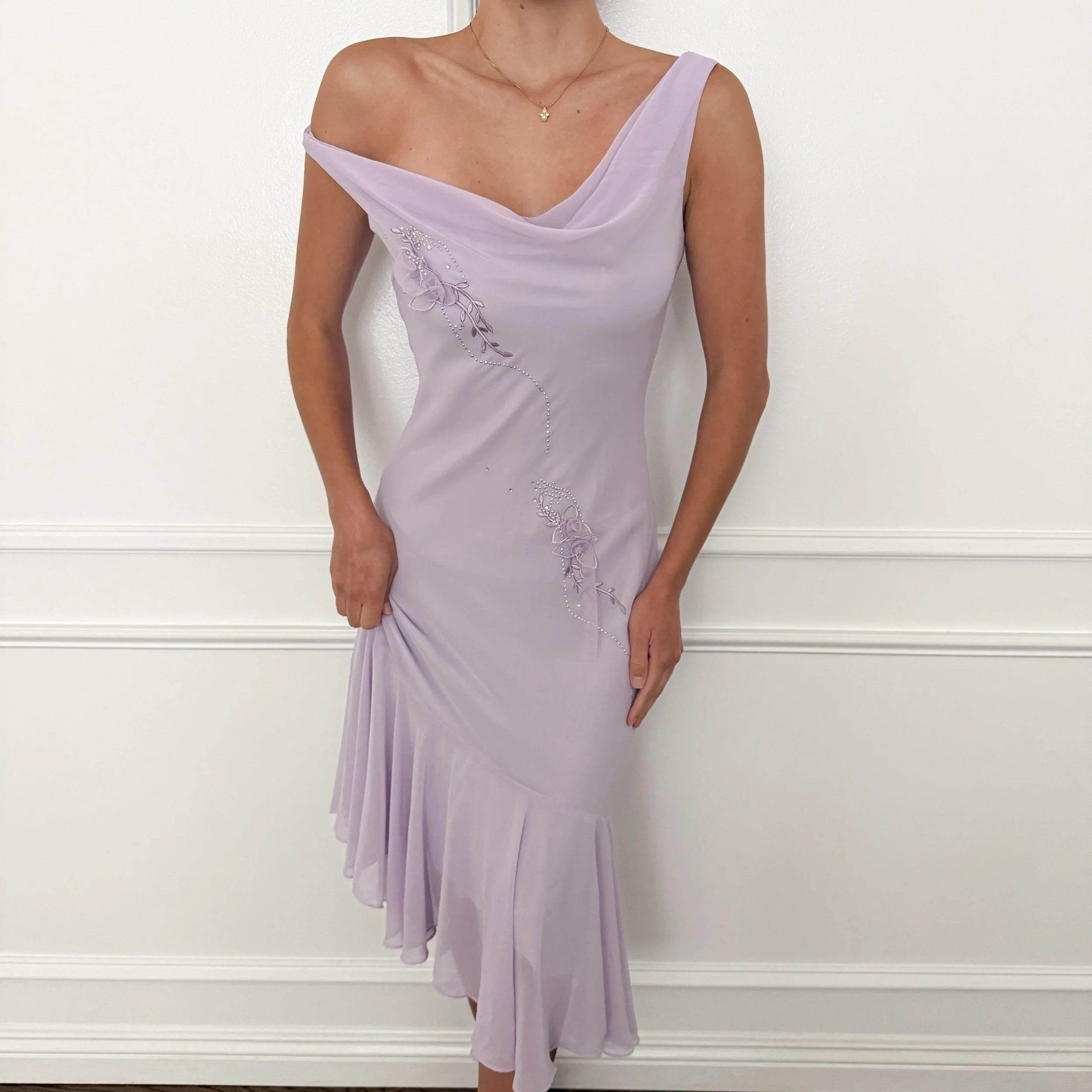Vintage Lilac Floral Rhinestone Appliqué Dress (Medium)