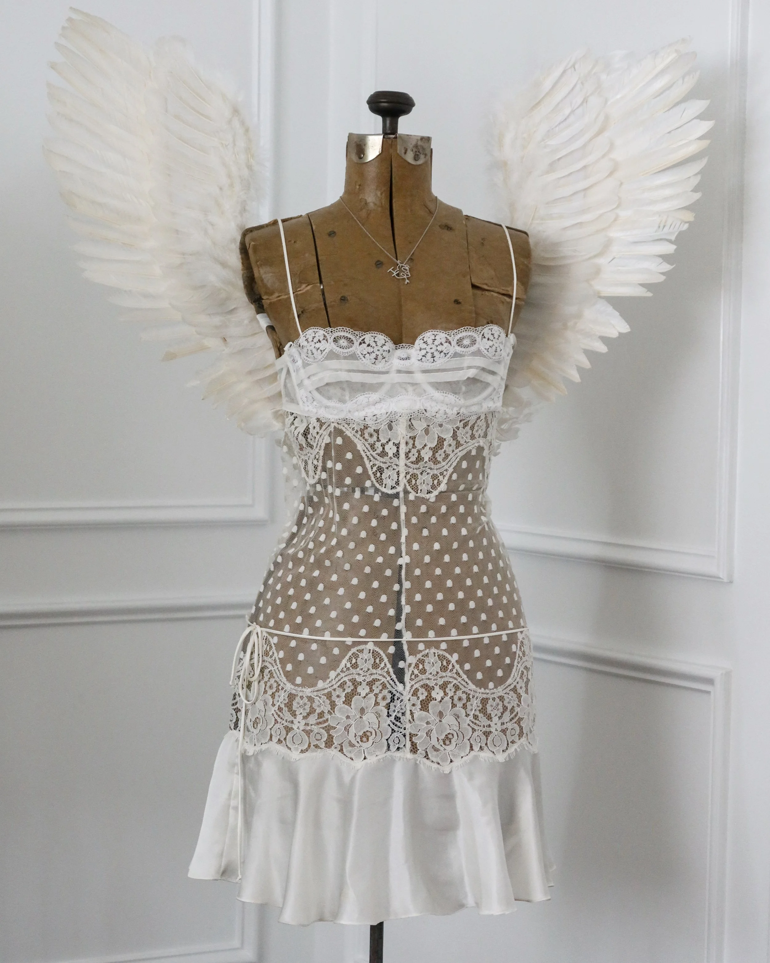 The most romantic and angelic vintage ivory sheer floral lace mini slip dress from Victoria’s Secret’s iconic gold label. This garment looks amazing as loungewear and lingerie, as well as shown off out and about; a true closet staple to treasure forever.